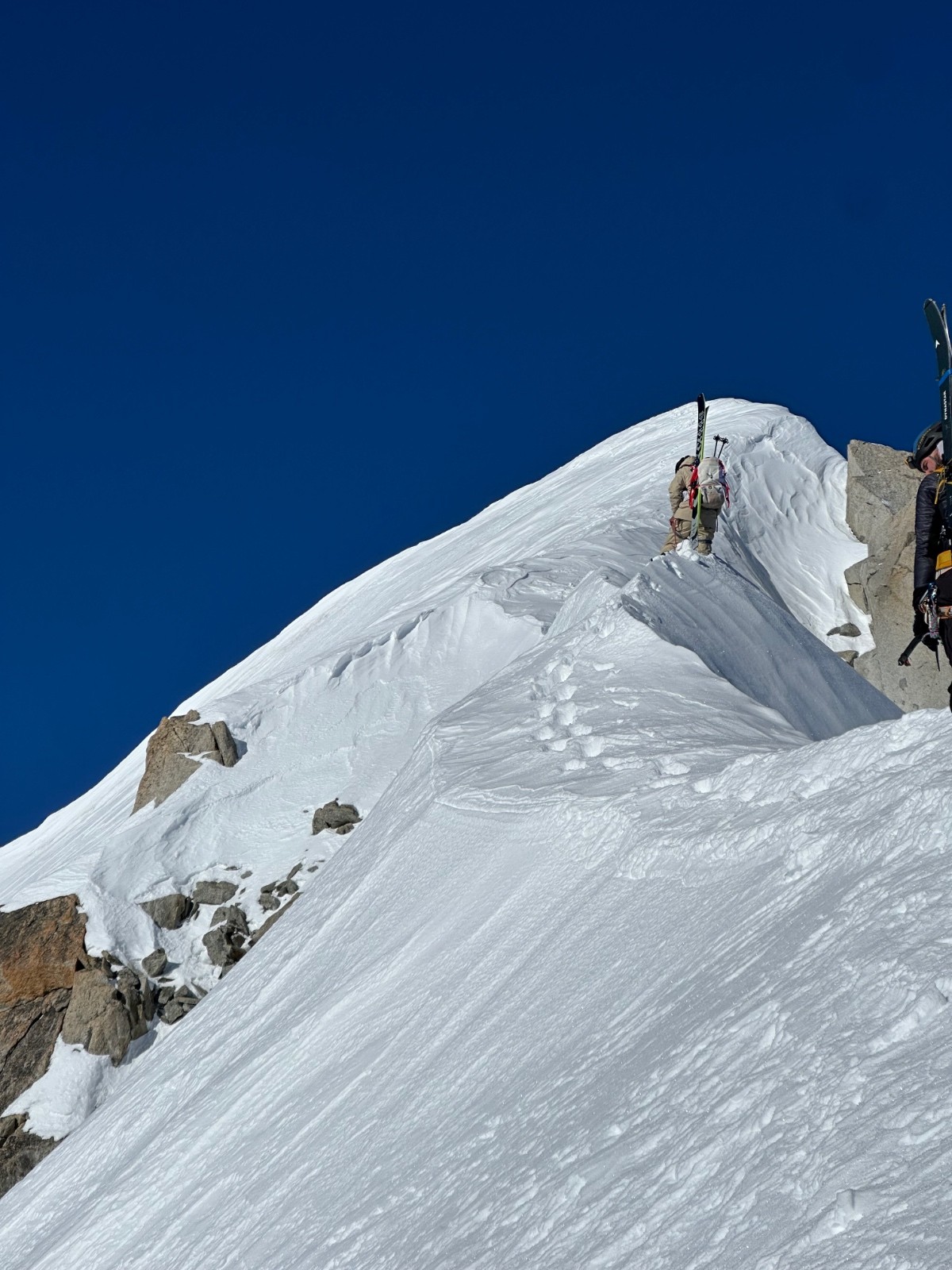 L’arête sommitale sublime est en poudre globalement. Même pu faire des virages moquette. Tous en forme en haut pour skier nickel . Vigilance tout de même avec ces condis piegeuses mais avec néanmoins de bons virages. On fera un saut de la rimaye en bas en son point faible.