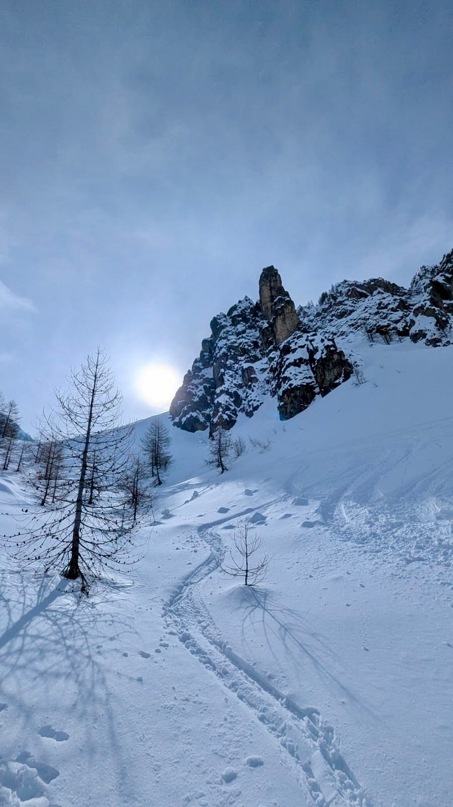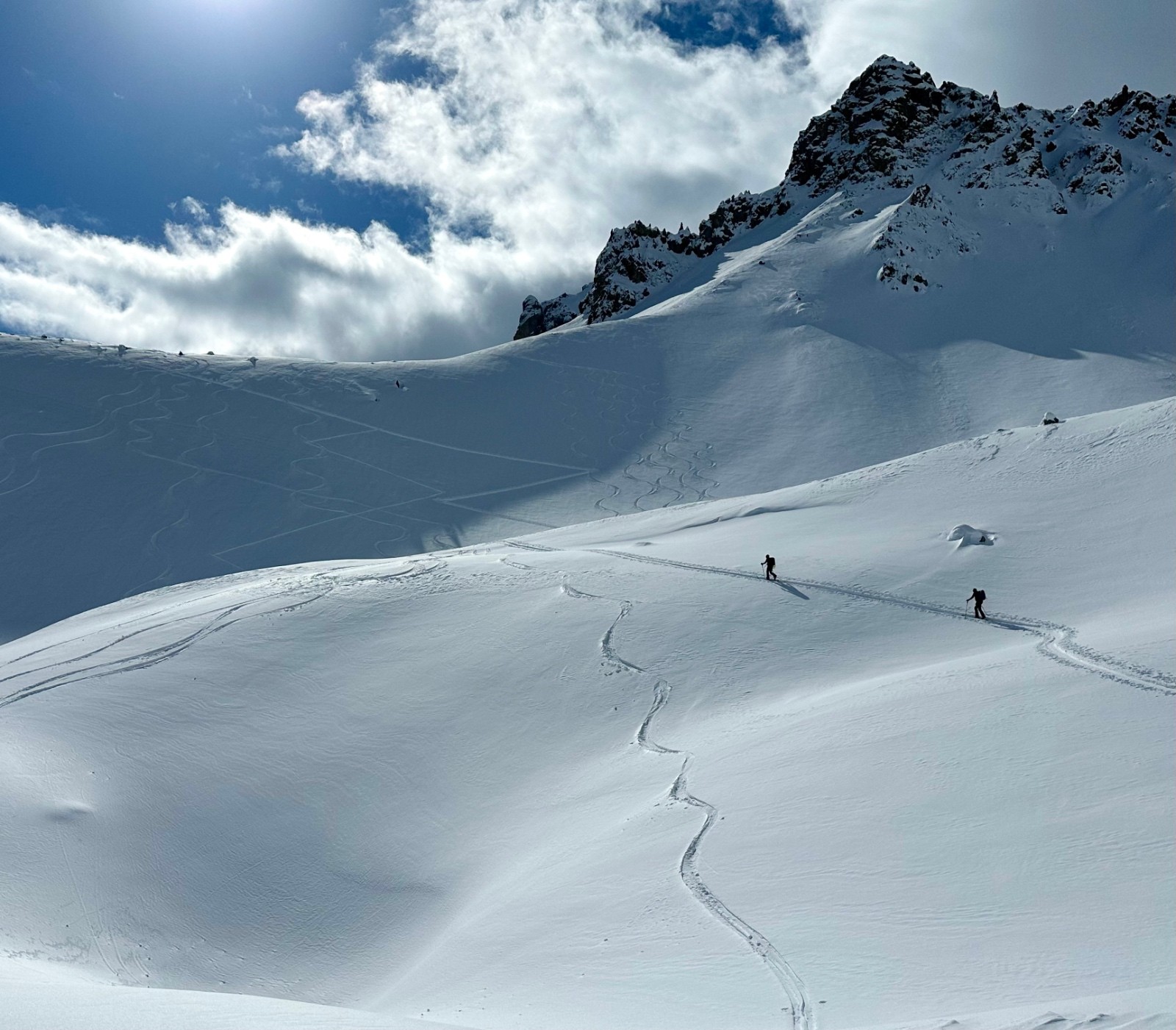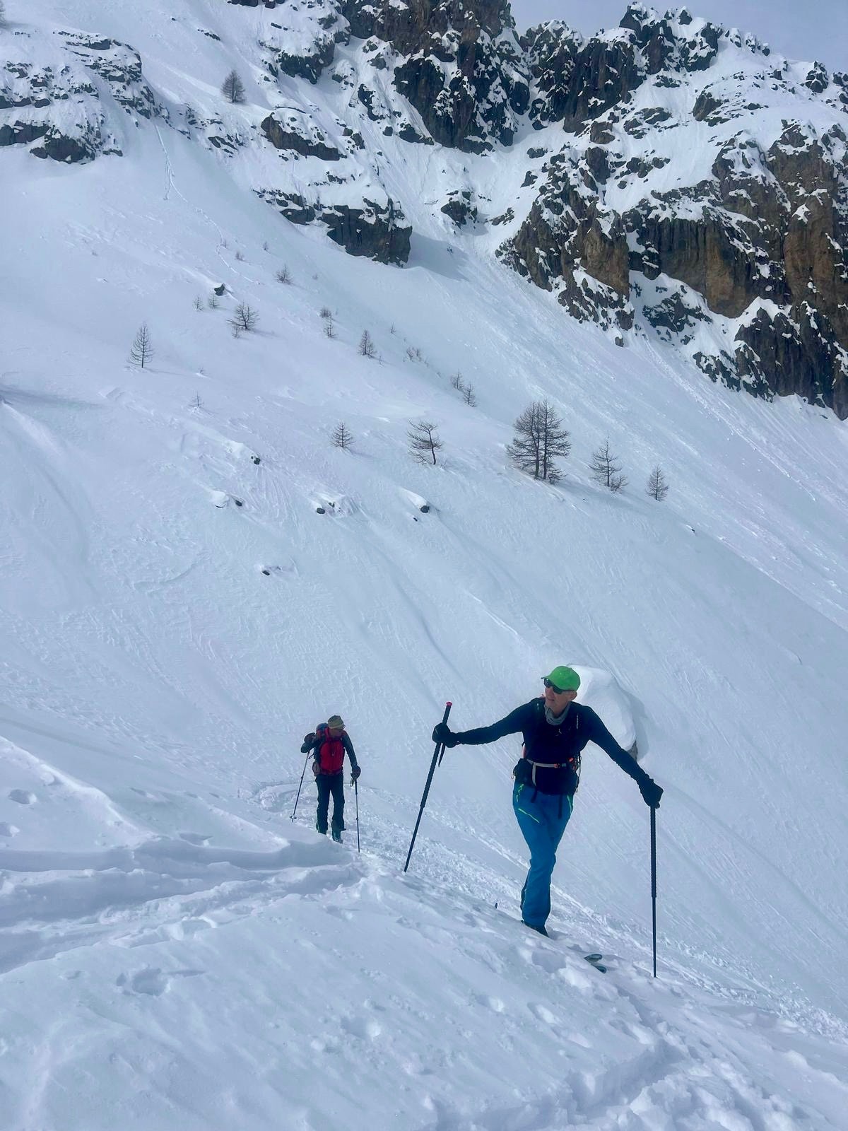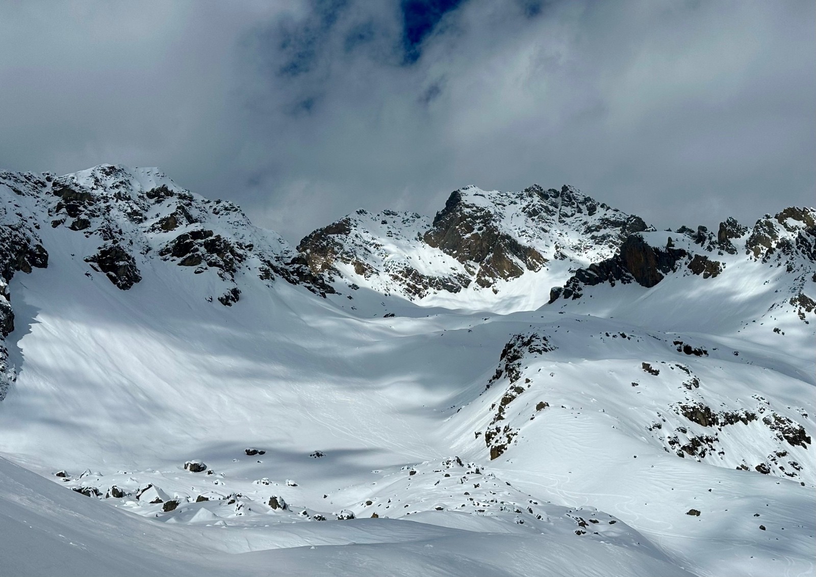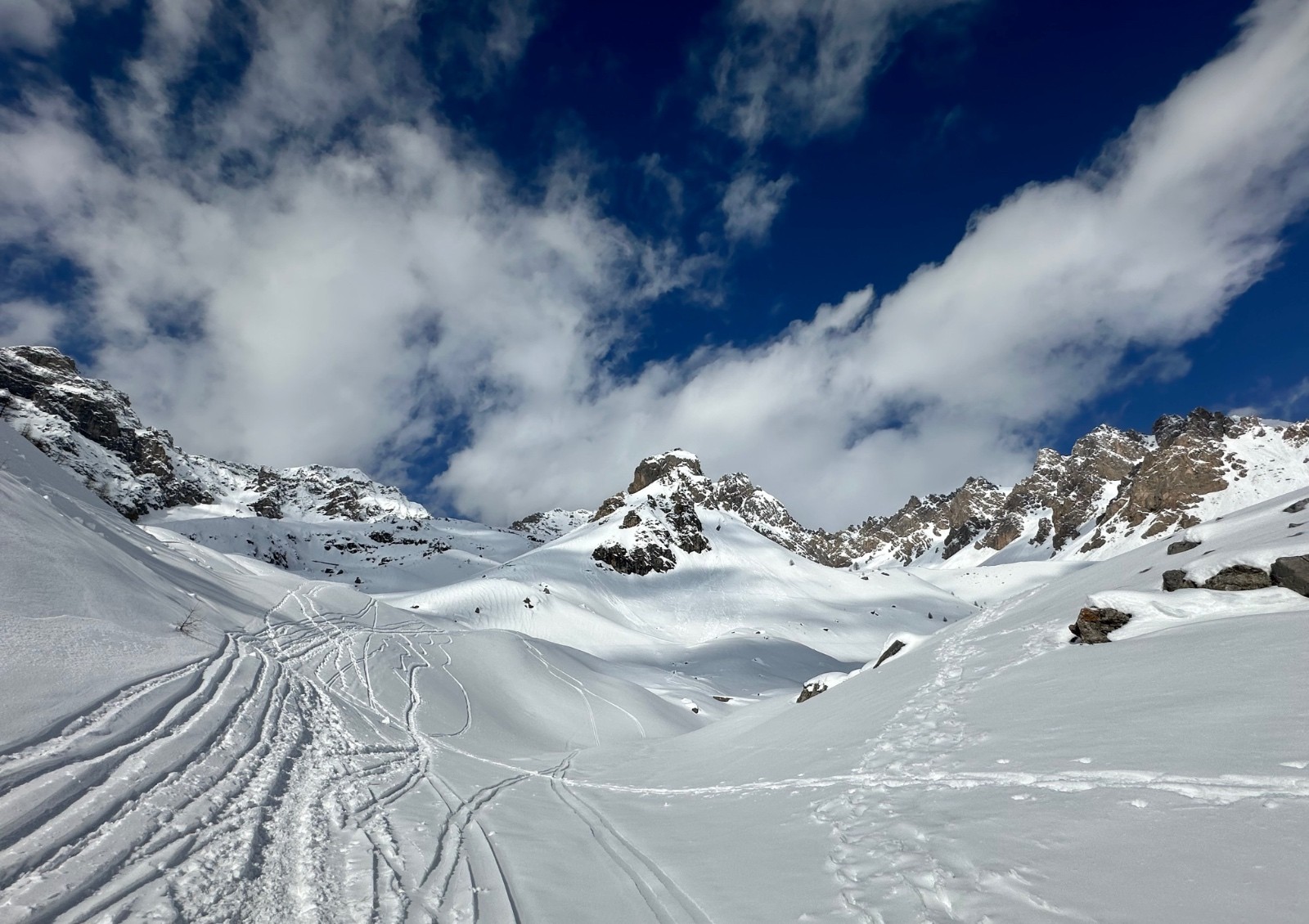 Nous continuons à explorer la vallée et partons ce coup-ci de Saretto. La météo est plutôt au gris en début de matinée, les éclaircies gagnent ensuite du terrain. Magnifique montée avec un itinéraire tournant, réservant de belles surprises à chaque virage. Vent désagréable au sommet, nous ne restons guère. Petit coup d'oeil à un joli couloir N qui a été skié et qui permet d'éviter un peu de pousse-bâtons plus bas, mais le haut bien étroit et un peu ravagé ne nous tente guère et nous descendons par notre itinéraire de montée. Poudre sur le haut (un peu de jour blanc, on ne peut guère se lâcher), et neige de printemps en dessous de Grange Pausa. Le coin est moins fréquenté que Chialvetta, la sortie la plus esthétique de la semaine.