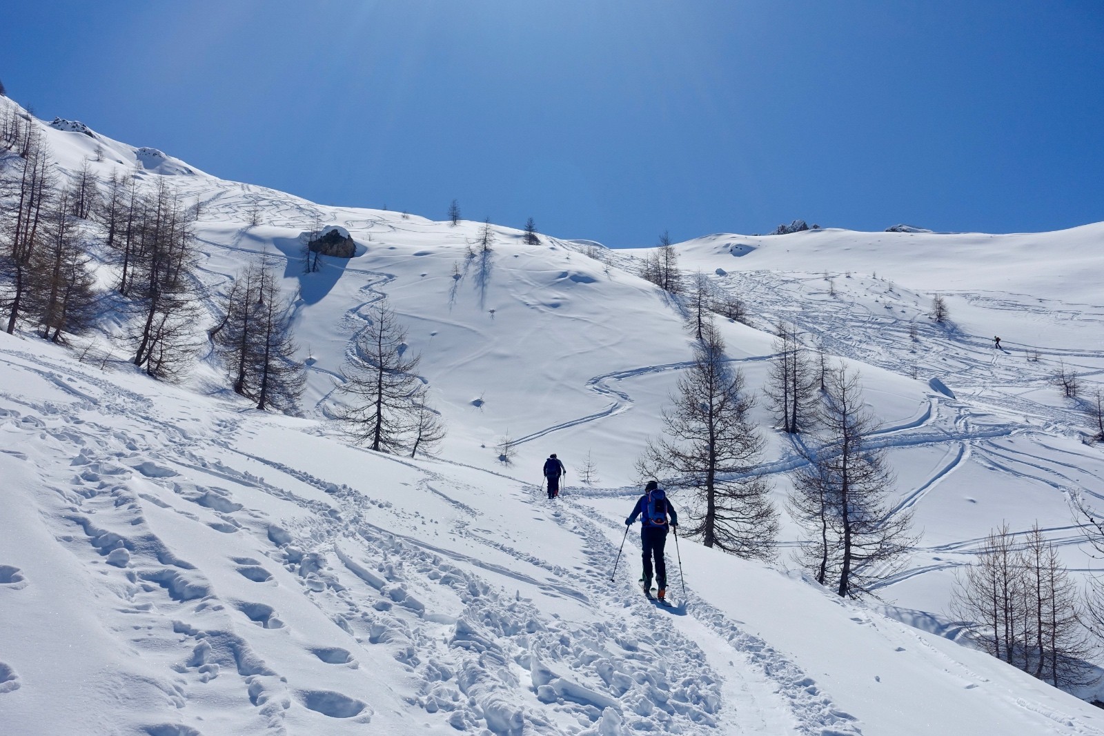 Le grand beau est de retour, et nous partons pour le Bric Boscasso, grande classique de la vallée. Pas mal de monde au départ du très beau village de Chialvetta, mais tout le monde s'égaille assez vite, vu les nombreuses possibilités du vallon. La montée dans le mélezin de Bandia Lunga est magnifique. Nous sortons à un petit collet au sud du sommet avant de gagner celui-ci par un bout d'arête aisée. Panorama exceptionnel, nous restons un petit moment à nous régaler. Début descente bien croûtée, nous obliquons SW pour gagner le Cumbal Vallonetto, mieux abrité du soleil. Bon choix, nous allons y trouver une croûte très fine n'empêchant pas du bon ski (quelques surprises ici ou là pour pimenter un peu les choses). Le bas du vallon se transforme en mini canyon, bien ludique à skier. Plus bas le mélezin est un peu moins sympa, puis une glissade agréable pour regagner Pratorotondo puis Chialvetta. Une magnifique journée dans un cadre exceptionnel, le Val Maira mérite bien sa réputation.