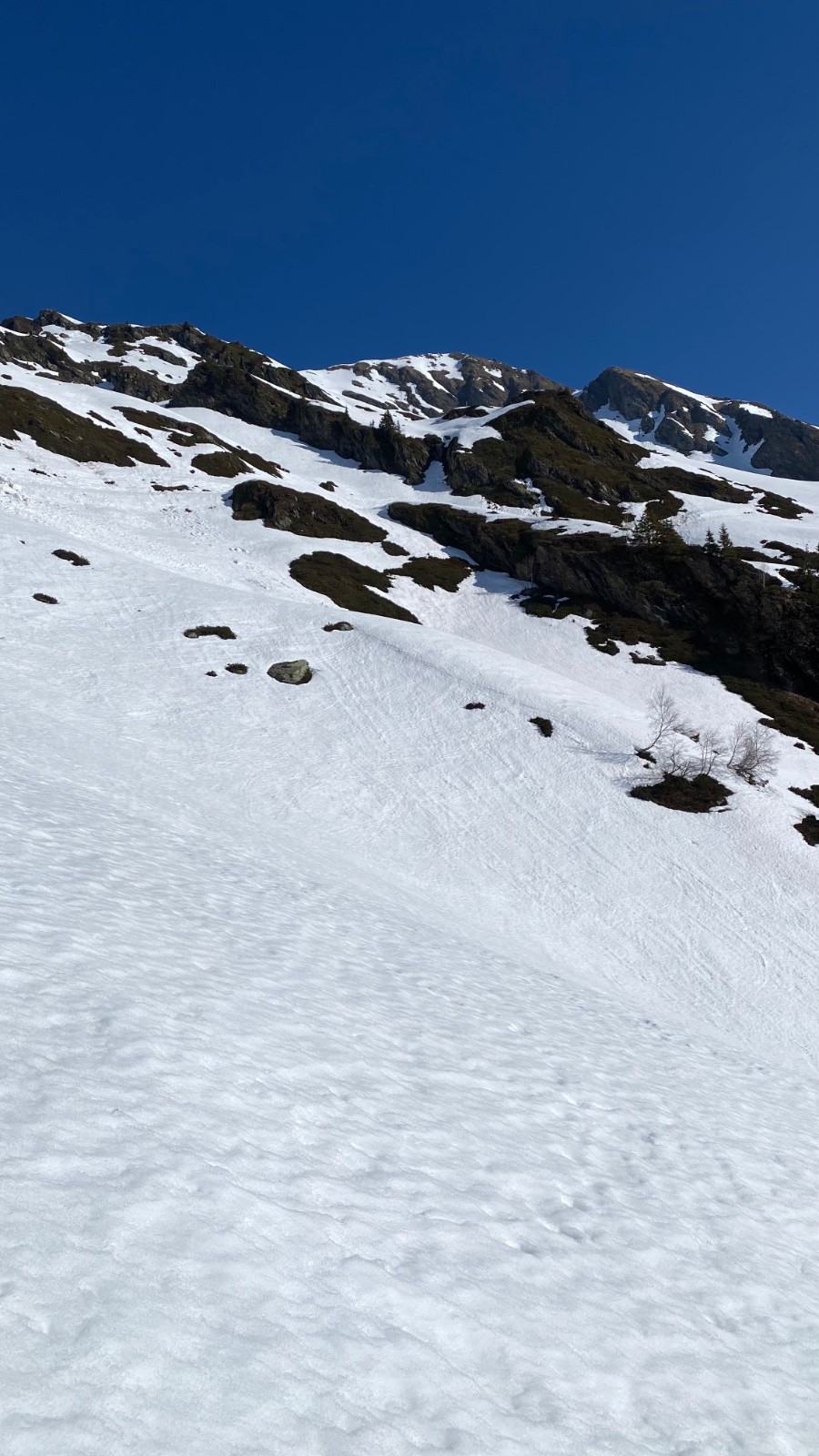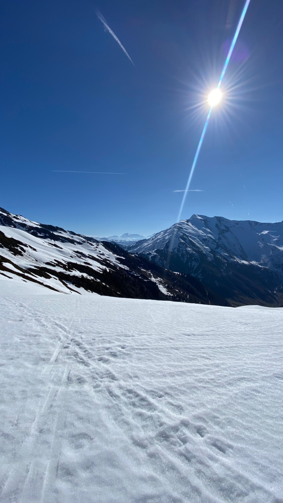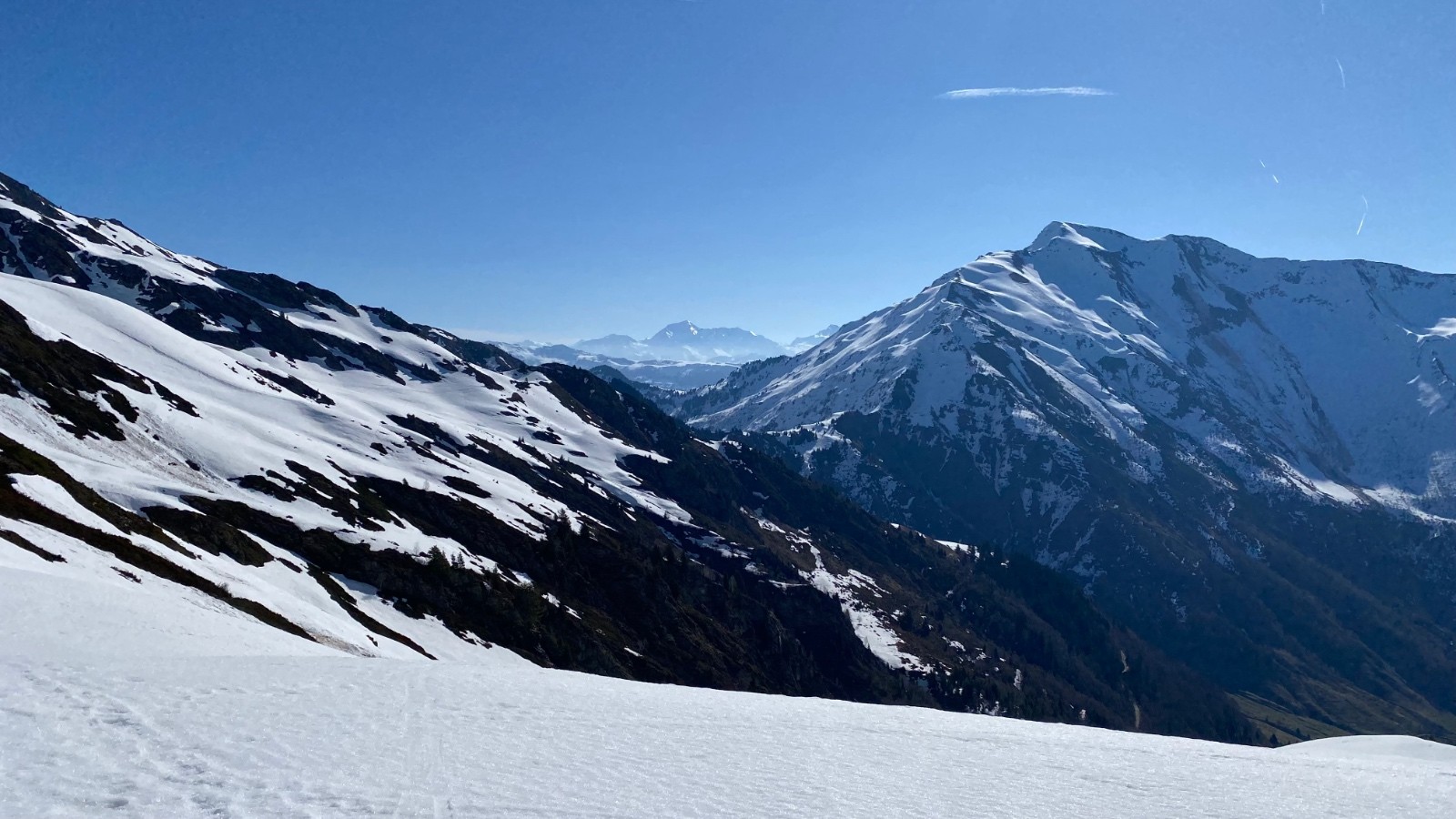 Une bien jolie sortie de printemps, 2ème fois que je fais ce Grand Arc, la vue est toujours aussi somptueuse au sommet ! Départ à 8H30 (pour une prochaine dans les mêmes conditions, partir à 7H00), personne, et je ne croiserai absolument personne jusqu'à l'arête sommitale : 1 skieur revient du sommet après être monté par le versant N, et deux autres jeunes arrivent depuis la gauche, à pieds ! À la descente, je croiserai également 2 autres gars à pieds et torse nu, je souffre pour eux...