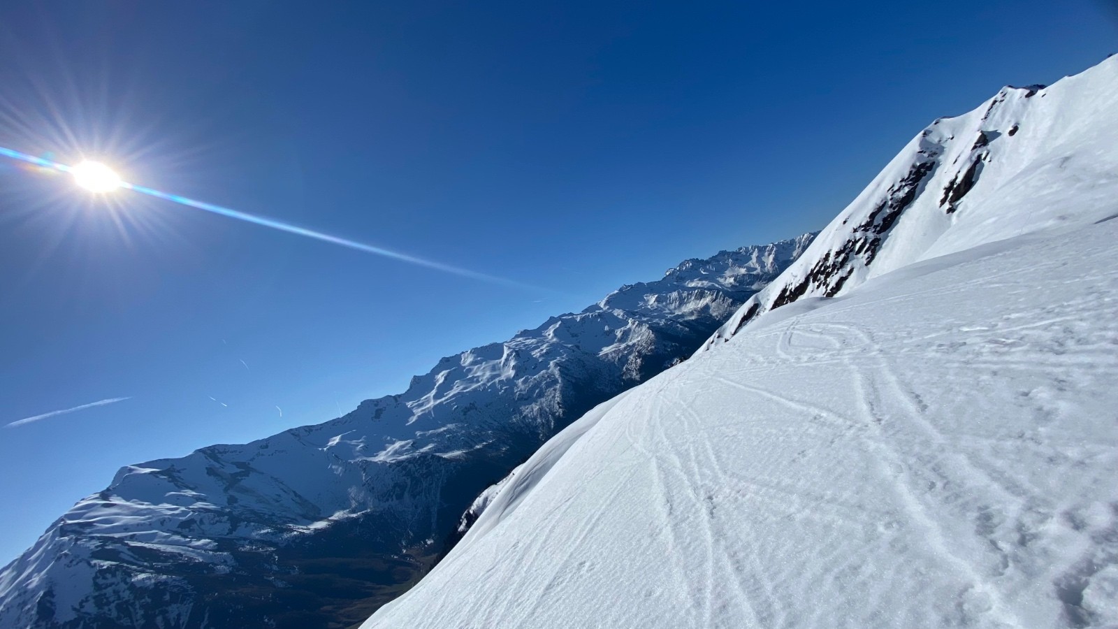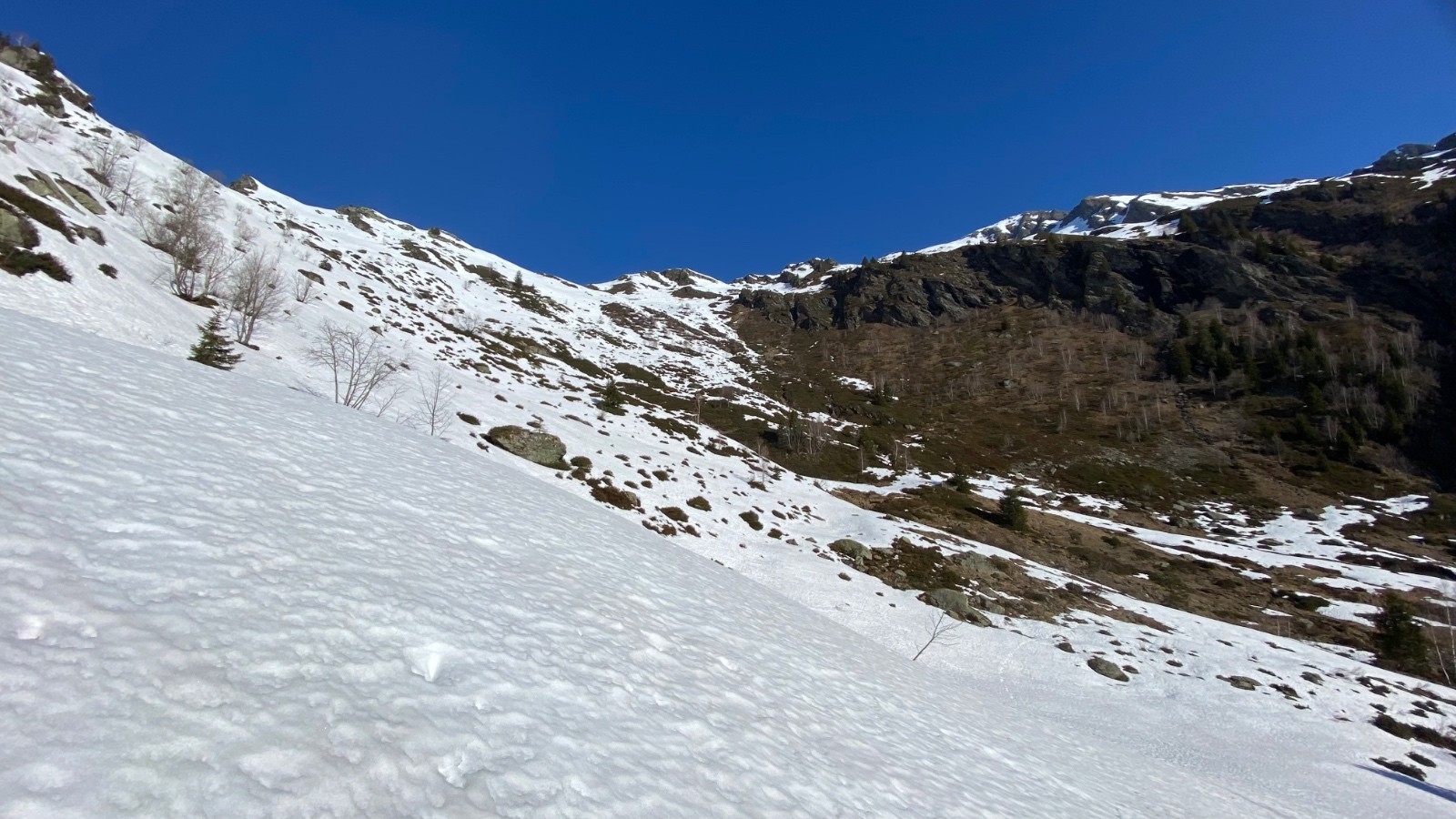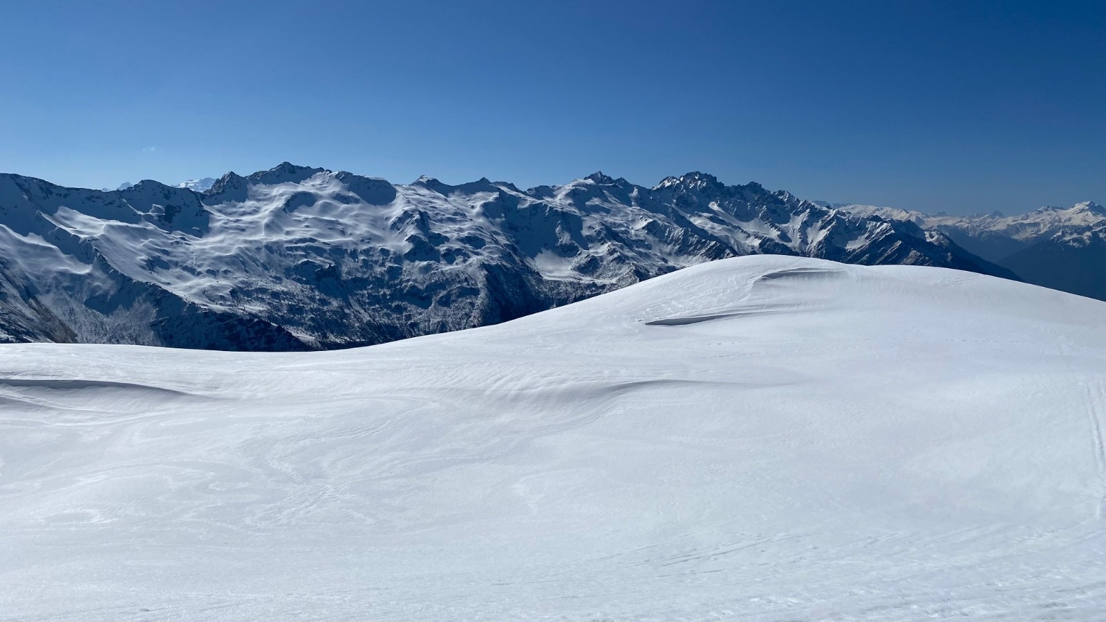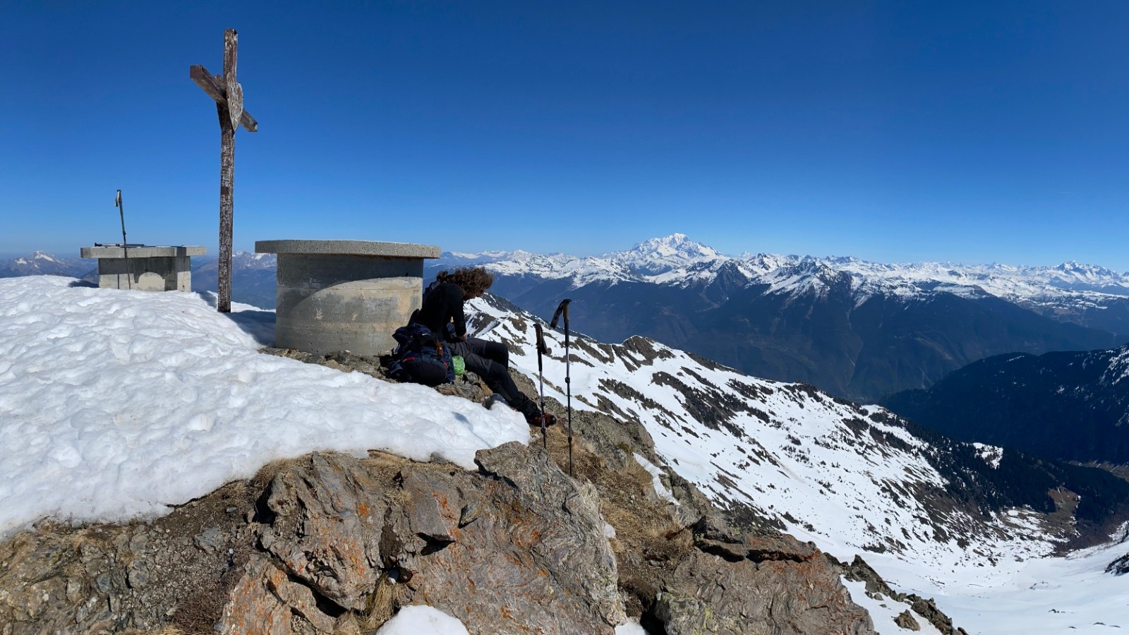 Une bien jolie sortie de printemps, 2ème fois que je fais ce Grand Arc, la vue est toujours aussi somptueuse au sommet ! Départ à 8H30 (pour une prochaine dans les mêmes conditions, partir à 7H00), personne, et je ne croiserai absolument personne jusqu'à l'arête sommitale : 1 skieur revient du sommet après être monté par le versant N, et deux autres jeunes arrivent depuis la gauche, à pieds ! À la descente, je croiserai également 2 autres gars à pieds et torse nu, je souffre pour eux...