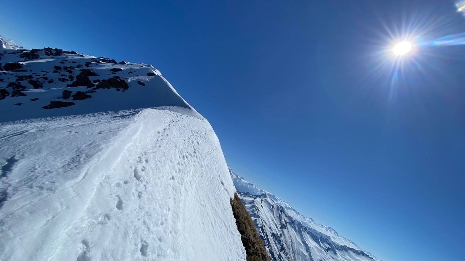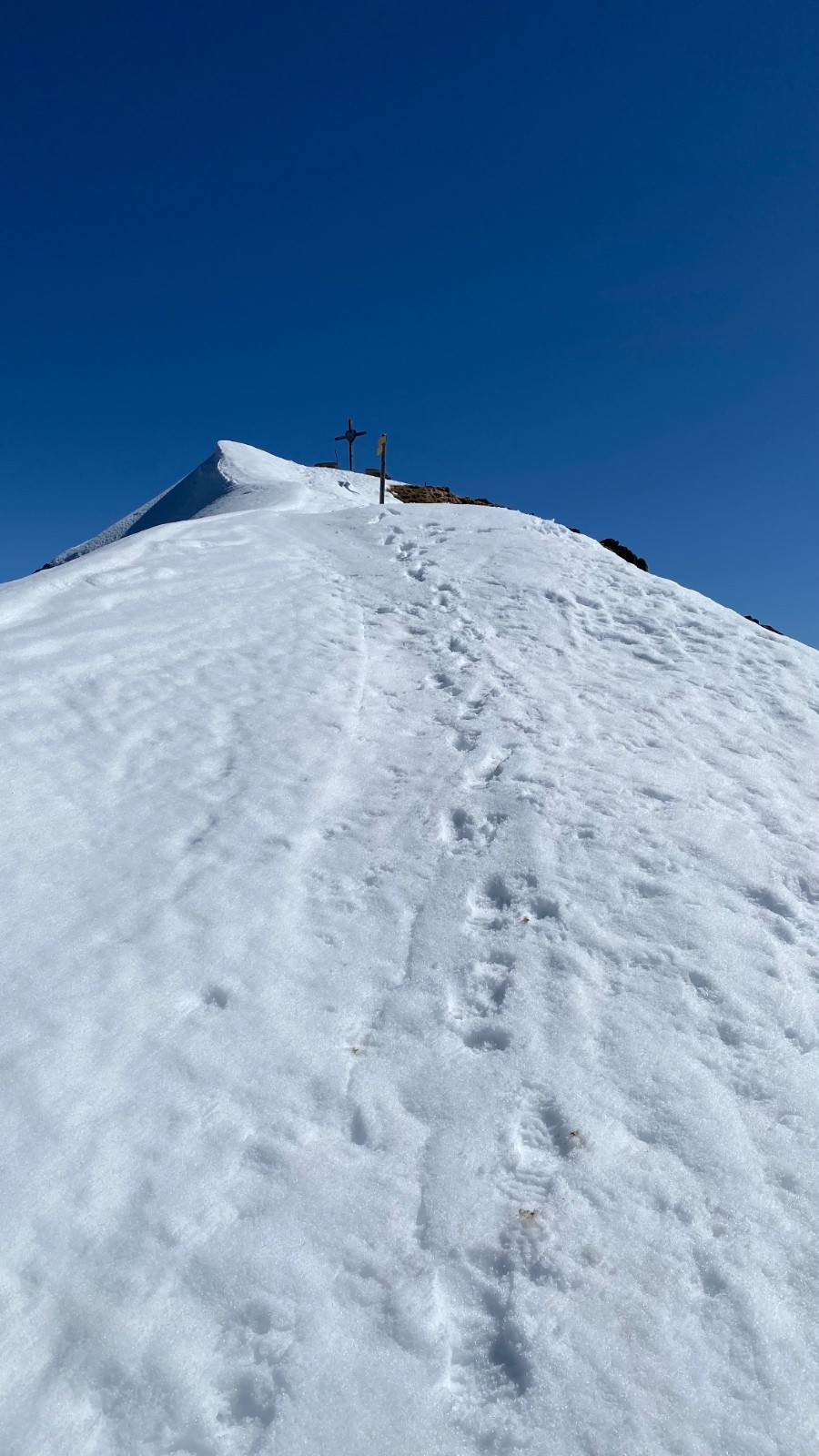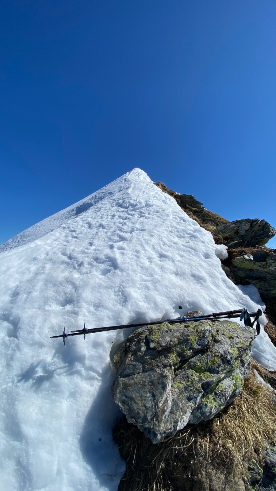 J'ai préféré poser les skis au début de l'arête sommitale et mettre les crampons (pas obligatoires, mais ils étaient dans le sac). Gare à la corniche en versant ouest, elle est conséquente, donc bien rester aux bons endroits...