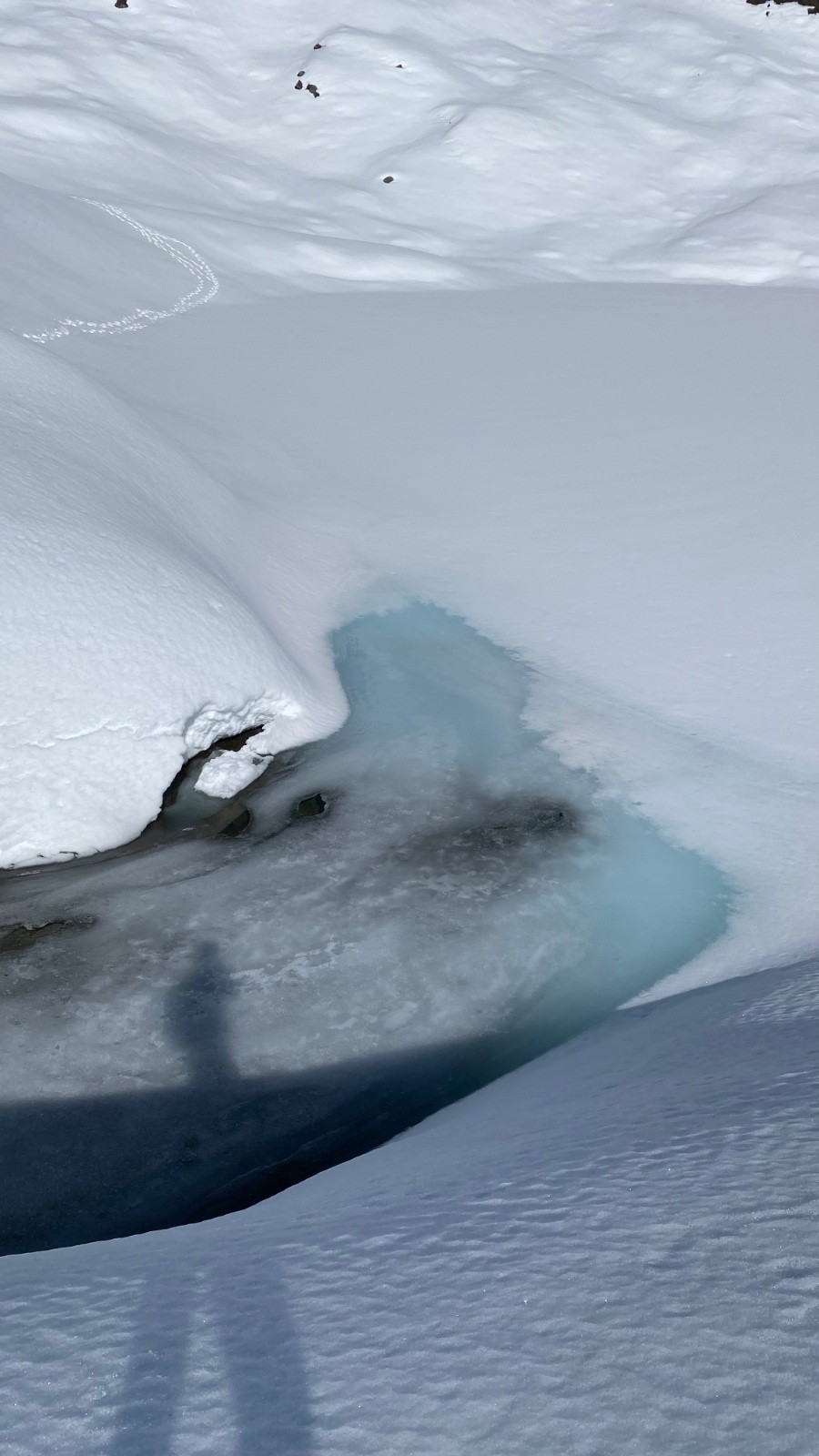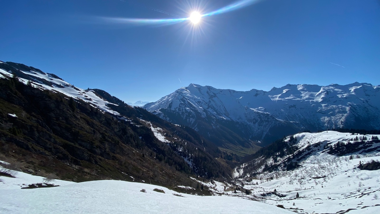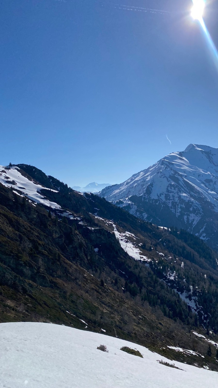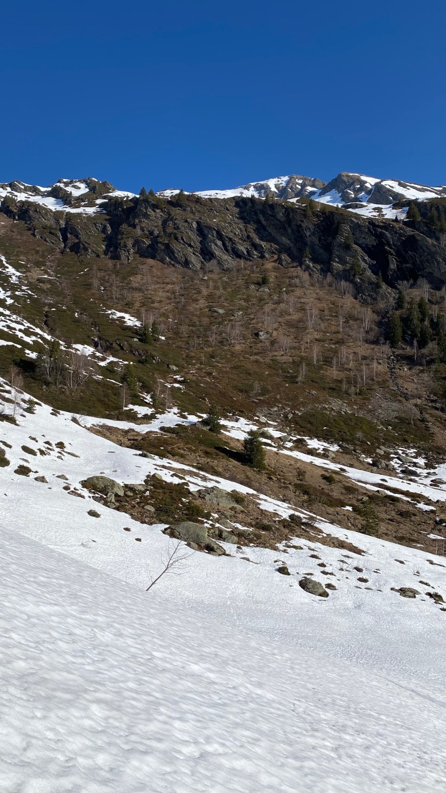 Chaussage à 1480m, en même temps que le soleil, pas de regel nocturne ici, ça va cogner ! Et toute la trace est à faire car tout a fondu cette semaine j'imagine. Tout passe dans les vernes en montée / descente, mais plus pour bien longtemps...