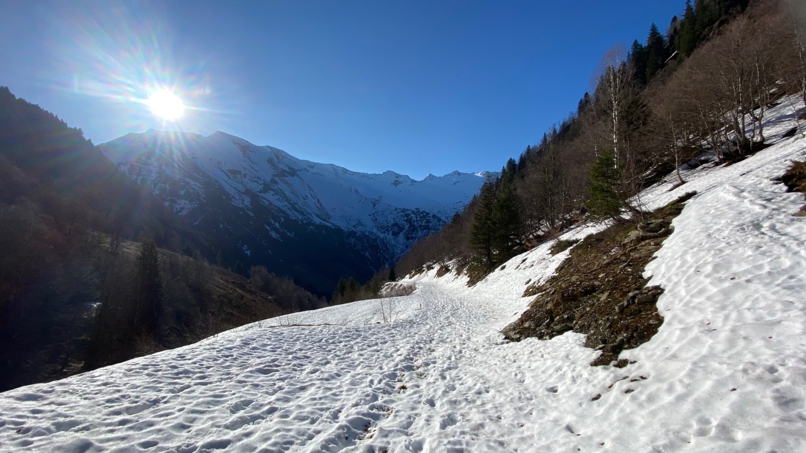 Itinéraire suivi : versant est-sud classique, départ joli hameau de Tioulévé, chemin d'été jusqu'au pont vert, puis poursuite rive droite jusqu'au croisement avec le chemin / route plus haut vers 1480m où j'ai chaussé.