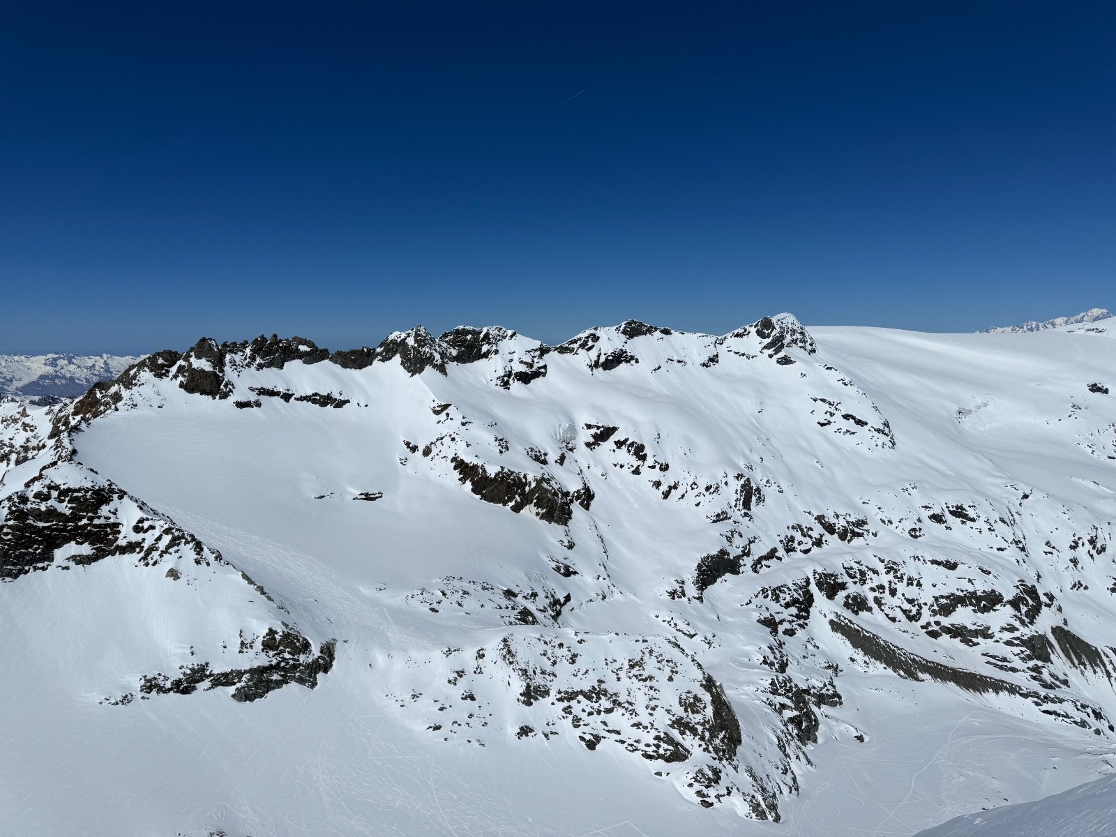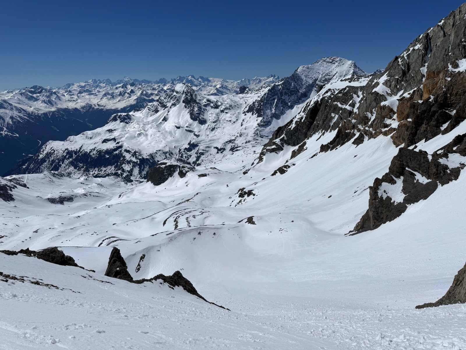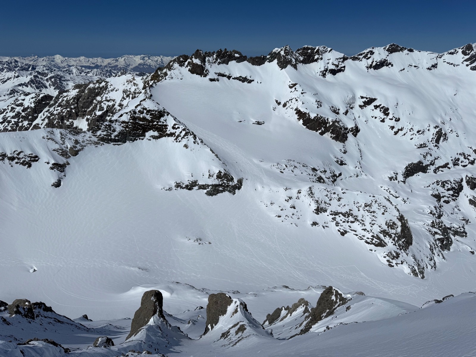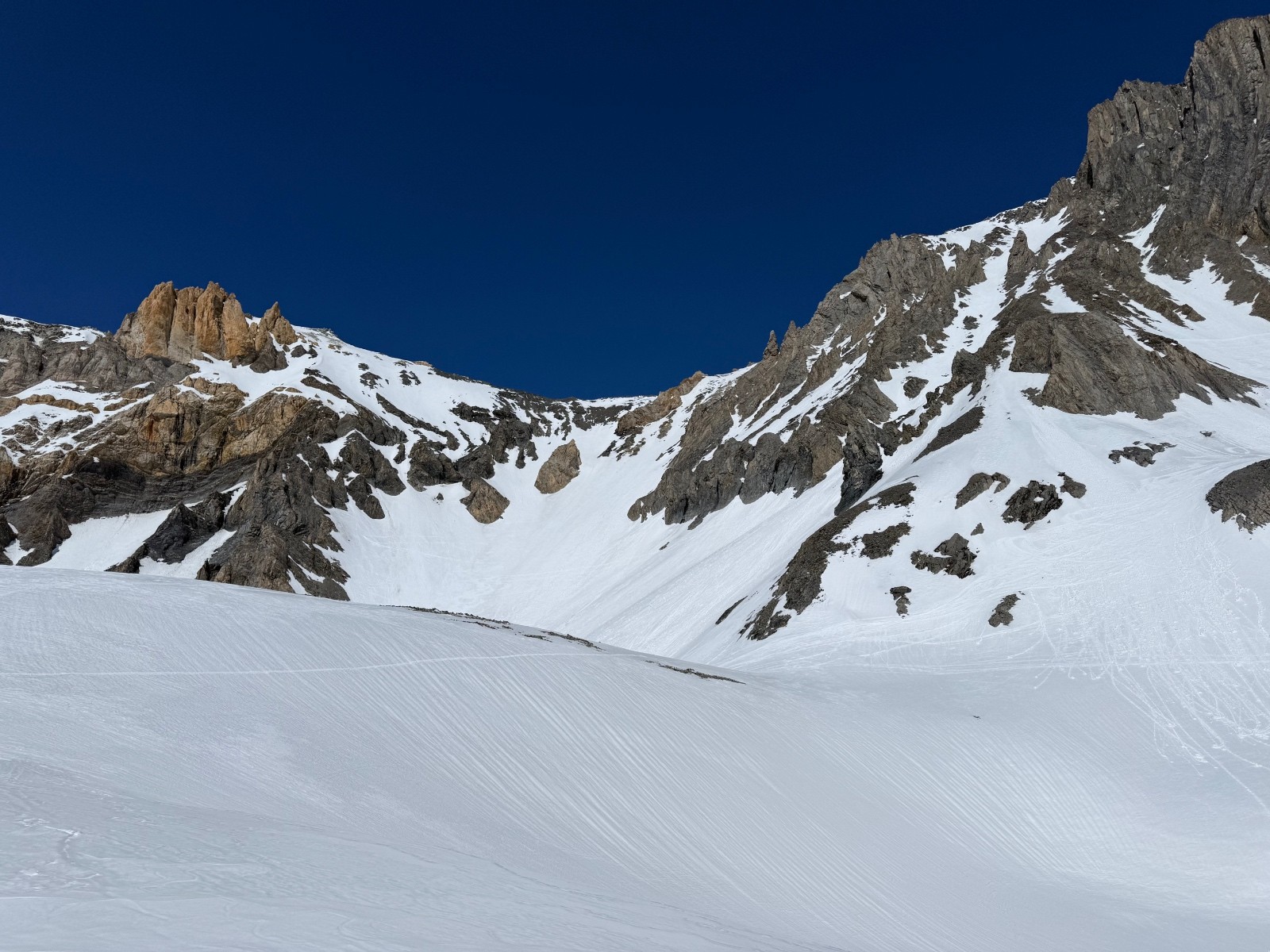 Superbe enchaînement, ça change de la plus classique Dent Parrachée. De belles ambiances avec les rochers et un couloir Ssw de la Fournache qui vaut vraiment le coup. 2 traces de descente sur la Nw de Scolette ( a priori rien dans les couloirs), pas de trace sur Longe Côte et Pte du Clôt.
