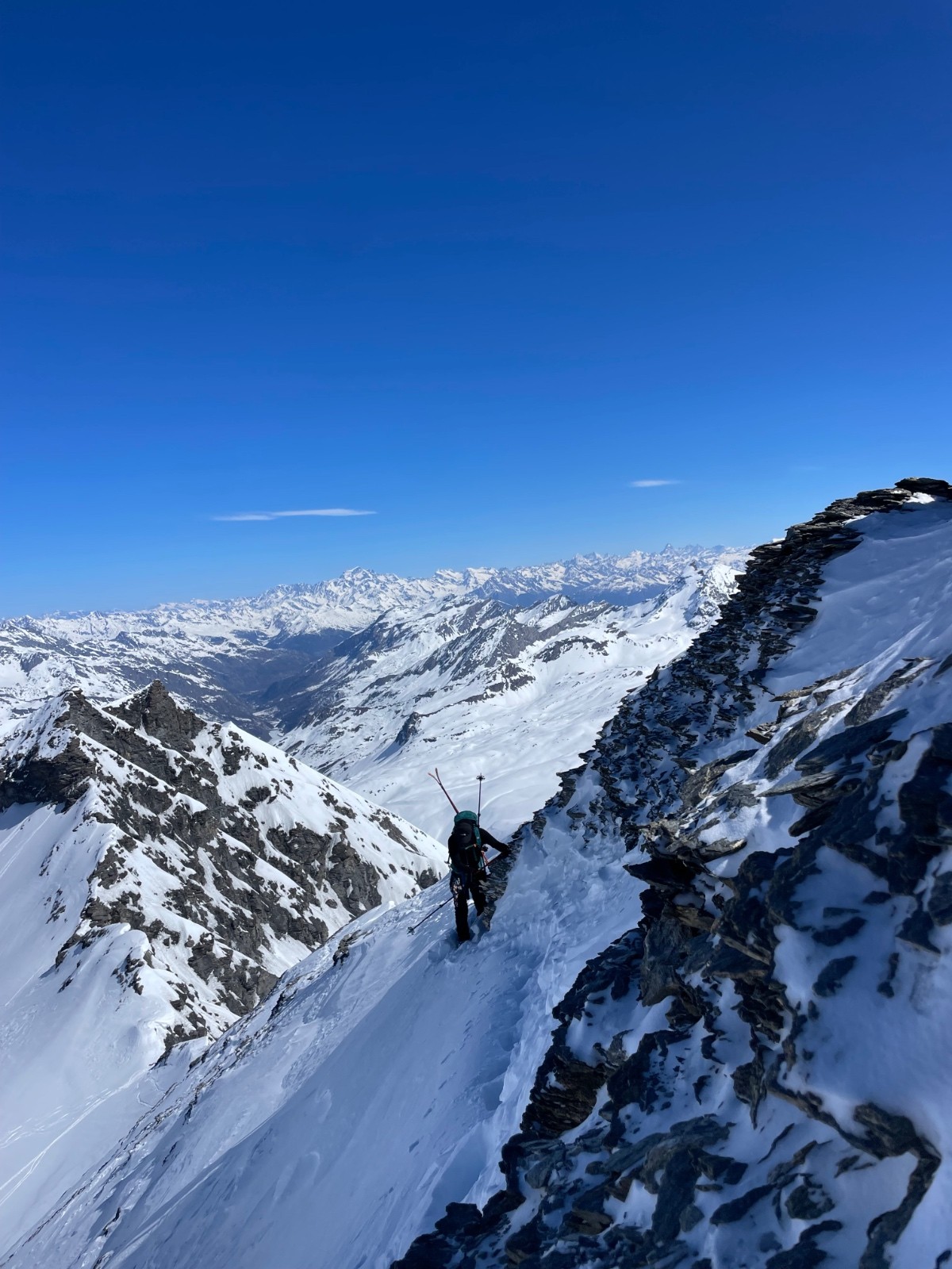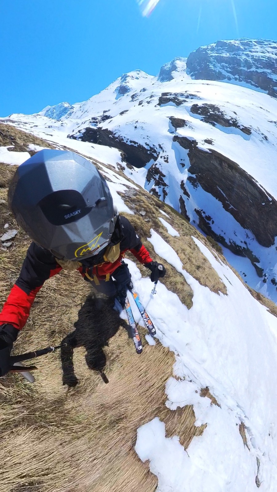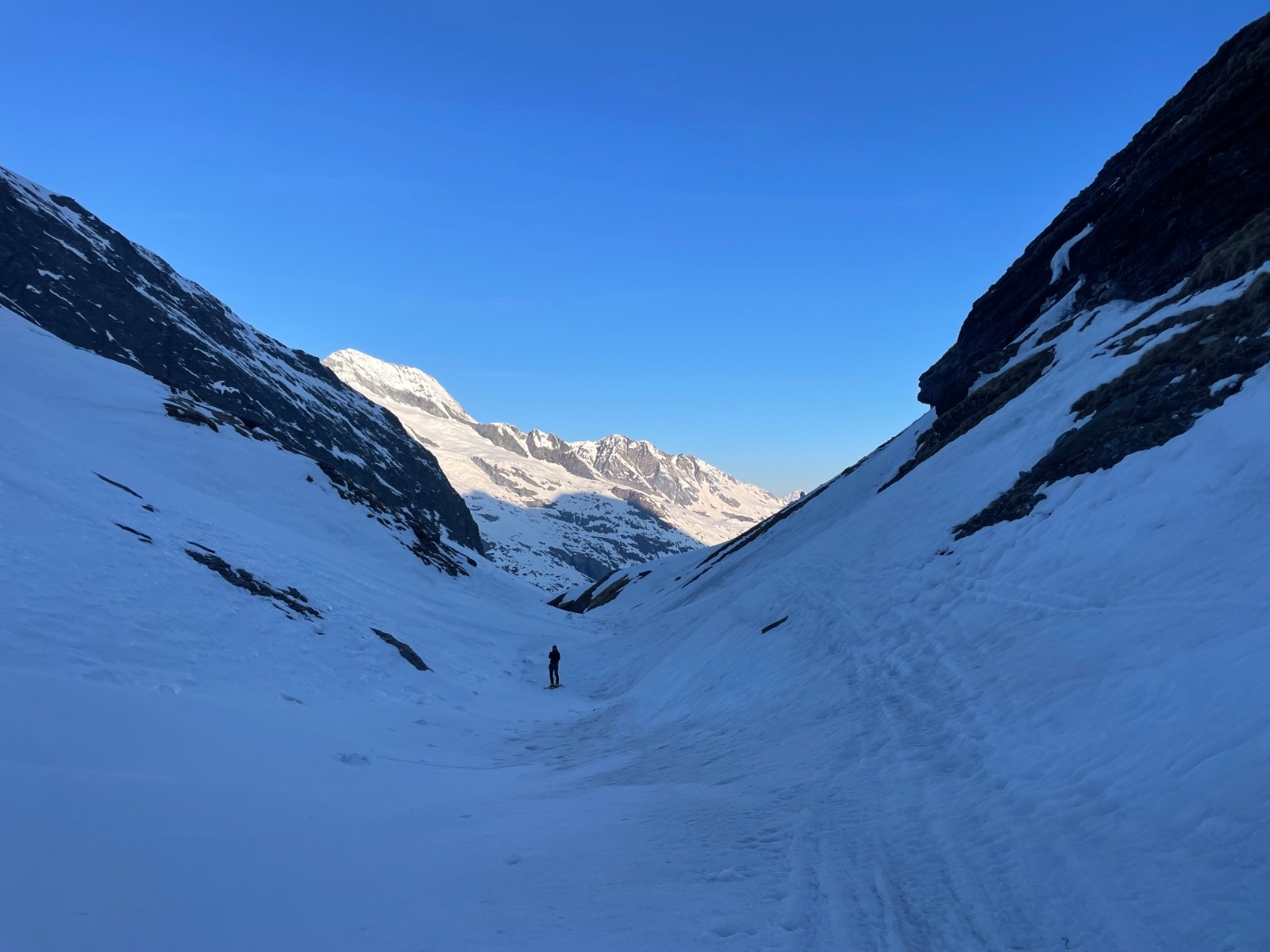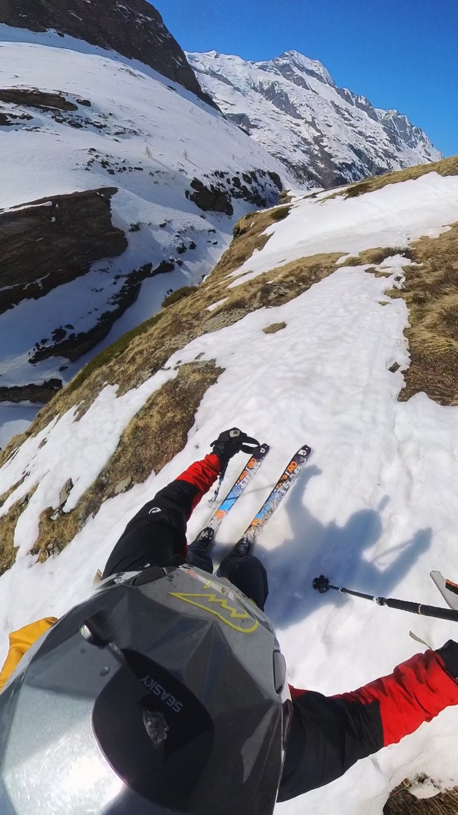 Une très belle journée. Comme je l'ai mentionné plus haut, la route pour rejoindre le parking était trop enneigée, donc nous nous sommes garés environ 500 m avant. Nous avons marché jusqu'au hameau puis mis nos skis. Plusieurs passages avaient très peu de neige, où l'on glissait légèrement sur de la boue ou des cailloux. Un passage notamment, où l'on traverse au-dessus des gorges, présente une pente assez raide avec très peu de neige, ce qui rend la traversée un peu compliquée niveau sécurité, mais ça passe (voir les photos). À partir du point où les gorges rejoignent le fond de la vallée, là où se situait autrefois le niveau du glacier, l'enneigement est très bon. Nous nous sommes encordés dès le début du glacier car nous ne connaissions pas bien les conditions des crevasses. Finalement, aucune crevasse visible, mais nous avons pu admirer quelques très beaux séracs (voir les photos). Le glacier semble être en très bonnes conditions, d'après ce que nous avons observé. La rimaye est entièrement bouchée. Nous avons attaqué le côté gauche de la pente sommitale, retiré les skis au niveau de l'arête nord, puis mis nos crampons pour terminer à pied jusqu'au sommet. Les conditions globales étaient vraiment bonnes et tout semblait sûr et stable (à l'exception de la traversée au-dessus des gorges au début).