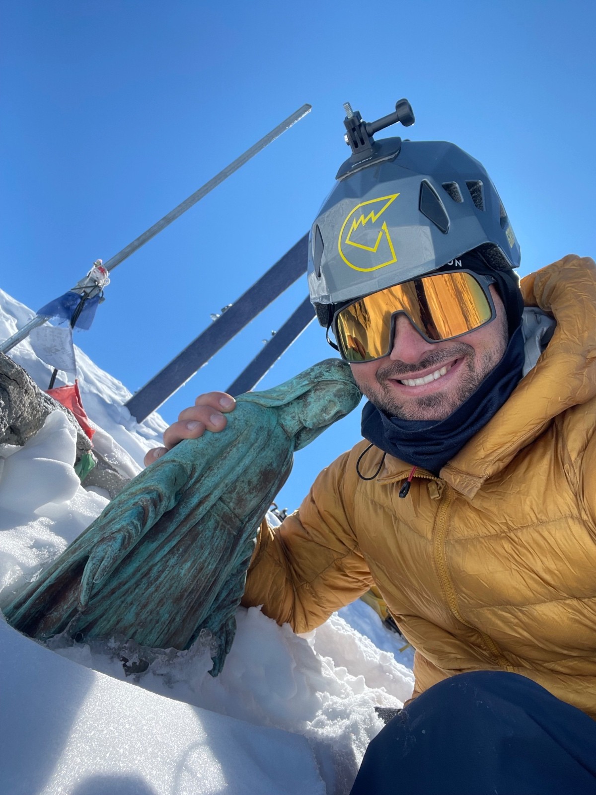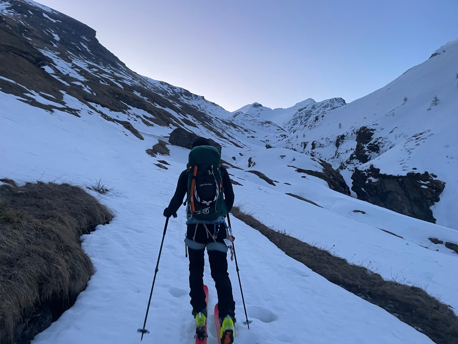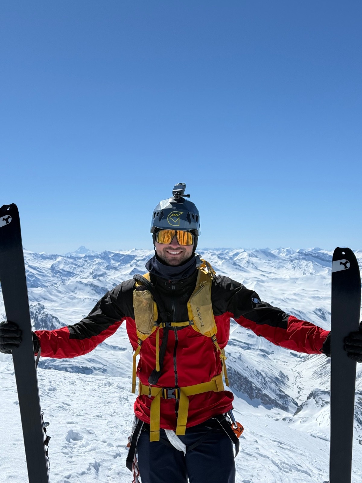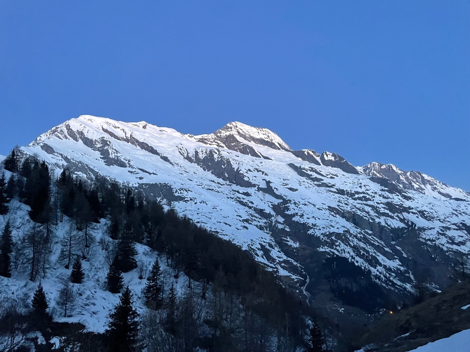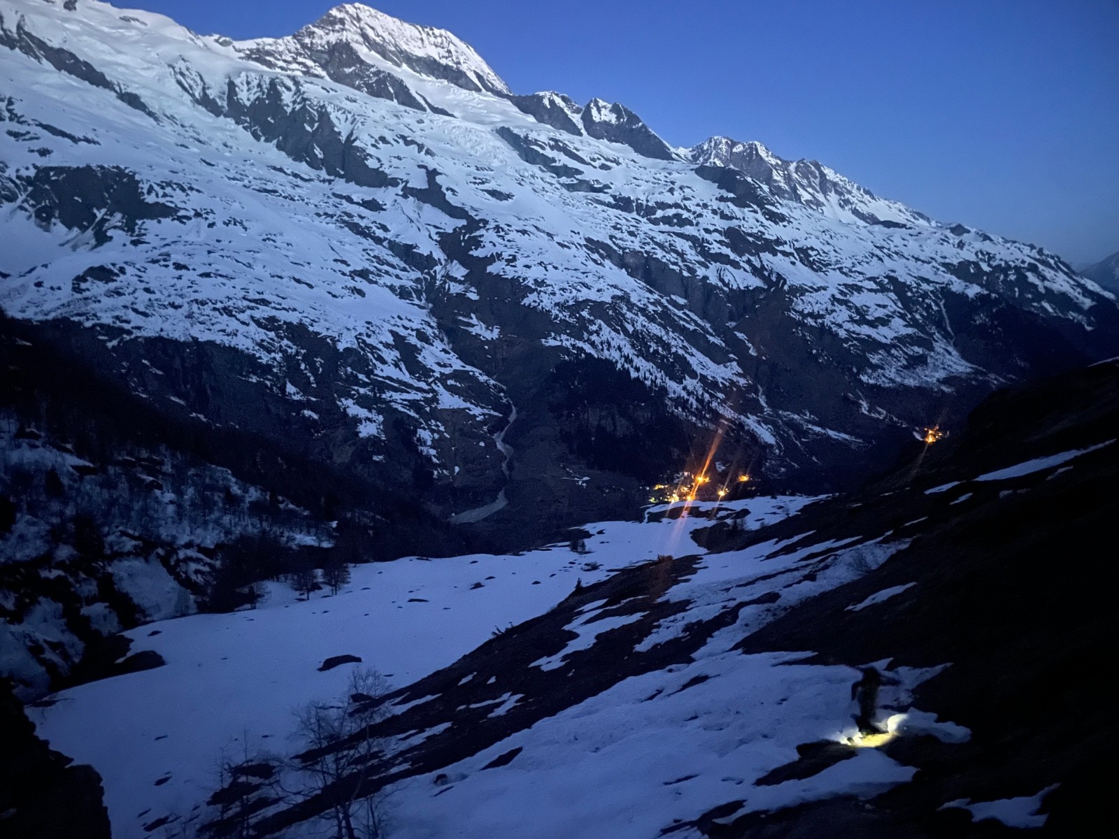 Une très belle journée. Comme je l'ai mentionné plus haut, la route pour rejoindre le parking était trop enneigée, donc nous nous sommes garés environ 500 m avant. Nous avons marché jusqu'au hameau puis mis nos skis. Plusieurs passages avaient très peu de neige, où l'on glissait légèrement sur de la boue ou des cailloux. Un passage notamment, où l'on traverse au-dessus des gorges, présente une pente assez raide avec très peu de neige, ce qui rend la traversée un peu compliquée niveau sécurité, mais ça passe (voir les photos). À partir du point où les gorges rejoignent le fond de la vallée, là où se situait autrefois le niveau du glacier, l'enneigement est très bon. Nous nous sommes encordés dès le début du glacier car nous ne connaissions pas bien les conditions des crevasses. Finalement, aucune crevasse visible, mais nous avons pu admirer quelques très beaux séracs (voir les photos). Le glacier semble être en très bonnes conditions, d'après ce que nous avons observé. La rimaye est entièrement bouchée. Nous avons attaqué le côté gauche de la pente sommitale, retiré les skis au niveau de l'arête nord, puis mis nos crampons pour terminer à pied jusqu'au sommet. Les conditions globales étaient vraiment bonnes et tout semblait sûr et stable (à l'exception de la traversée au-dessus des gorges au début).