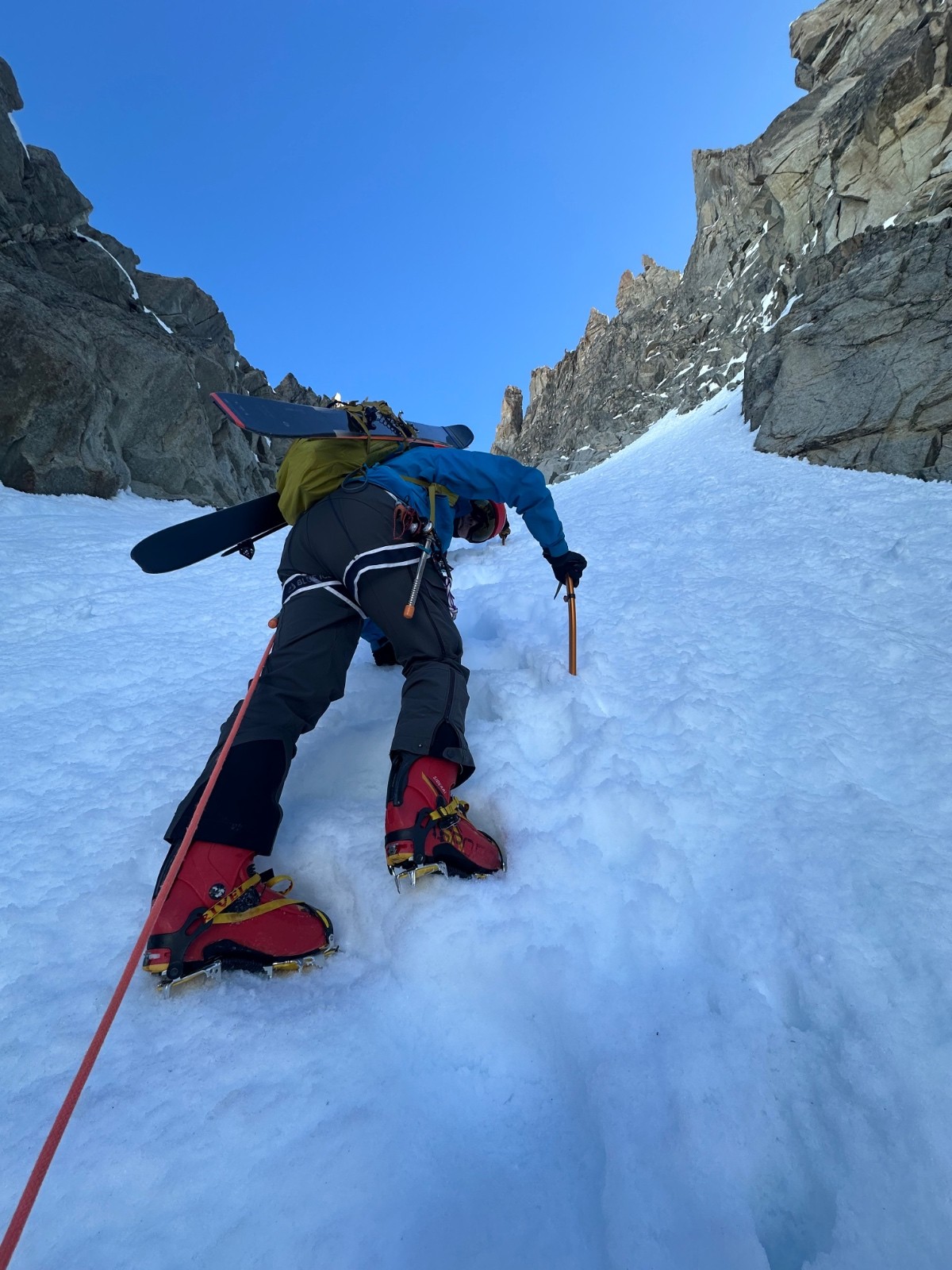 Conditions pour le ski : tollé dans les pentes ayant déjà chauffées la veille, quelques filons de poudre sous les séracs du glacier du Mont Mallet. Certaines crevasses sont en train de perdre leur ponts de neige. . À partir du niveau du refuge de Leschaux, neige transformée puis gros sel. En partie basse deux déchaussages ont été nécessaire pour arriver sous la gare du télécabine (ça va pas durer…)