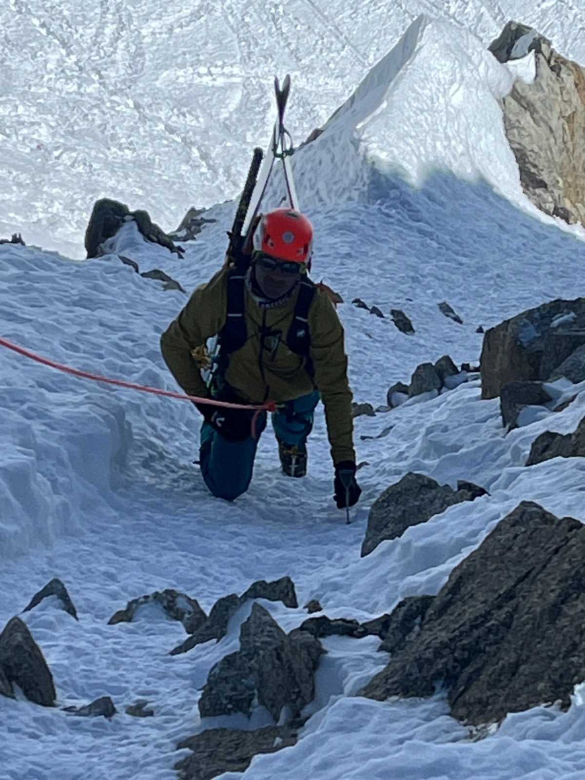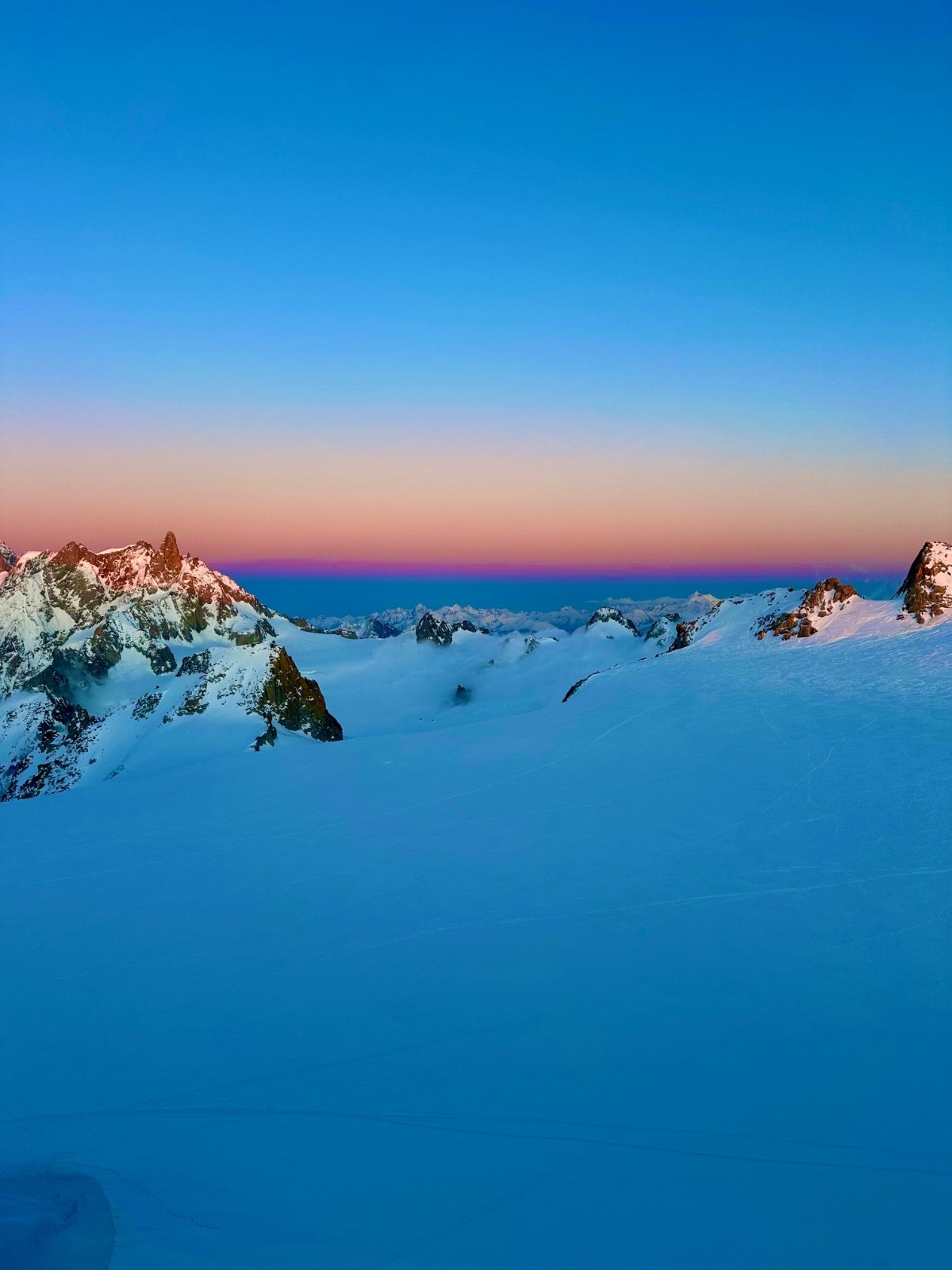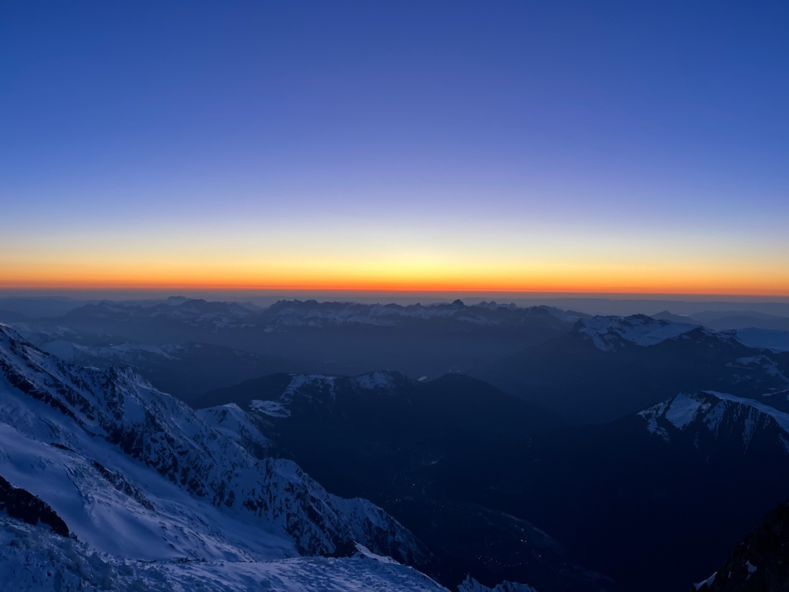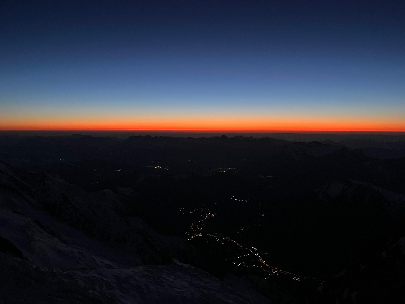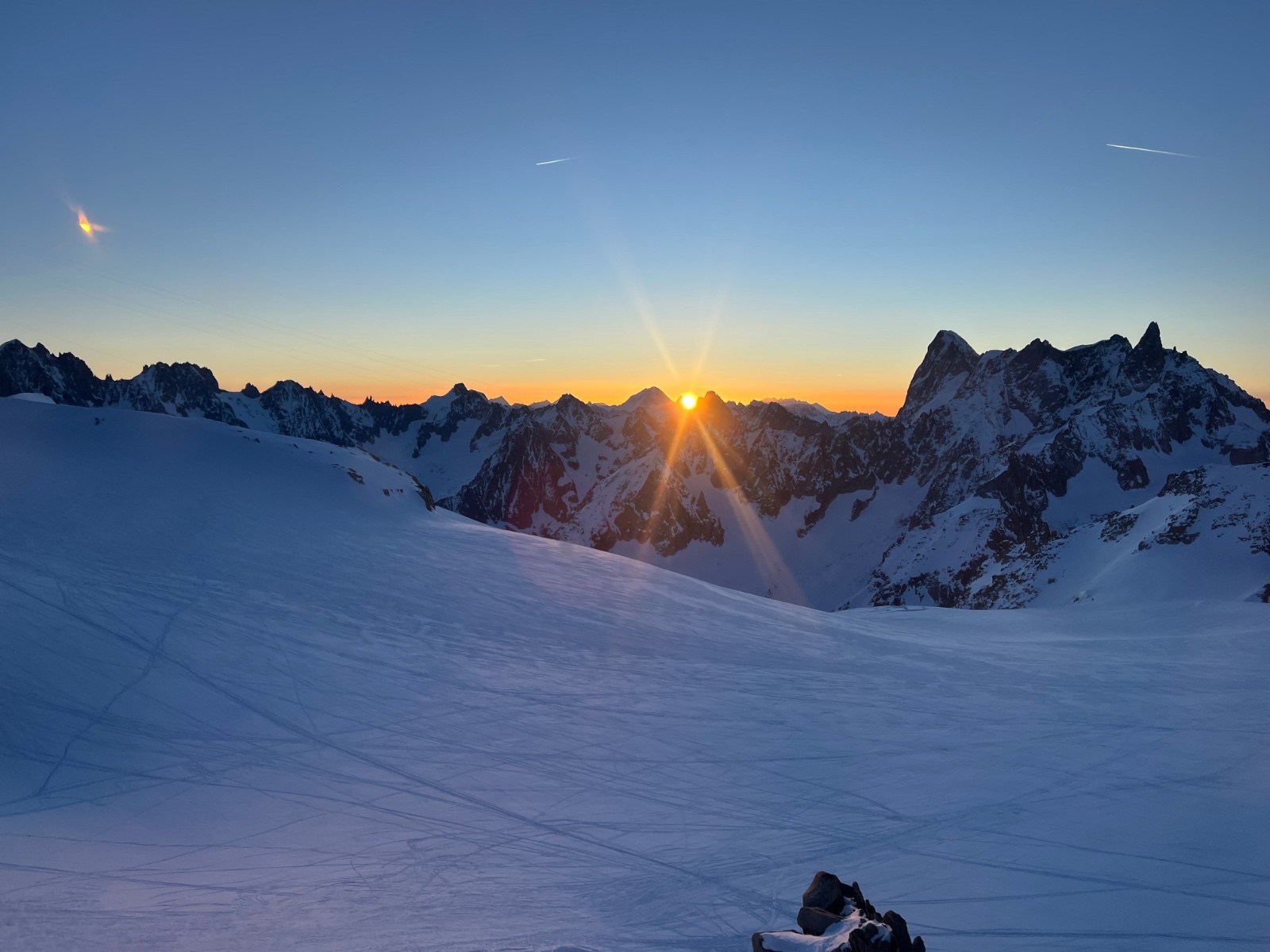 Météo/températures : - 10 au départ du refuge des Cosmiques, grand beau pendant la journée. Sans vent en dépit de la météo qui annonce 60 à 80 klm de vent à 4000m.