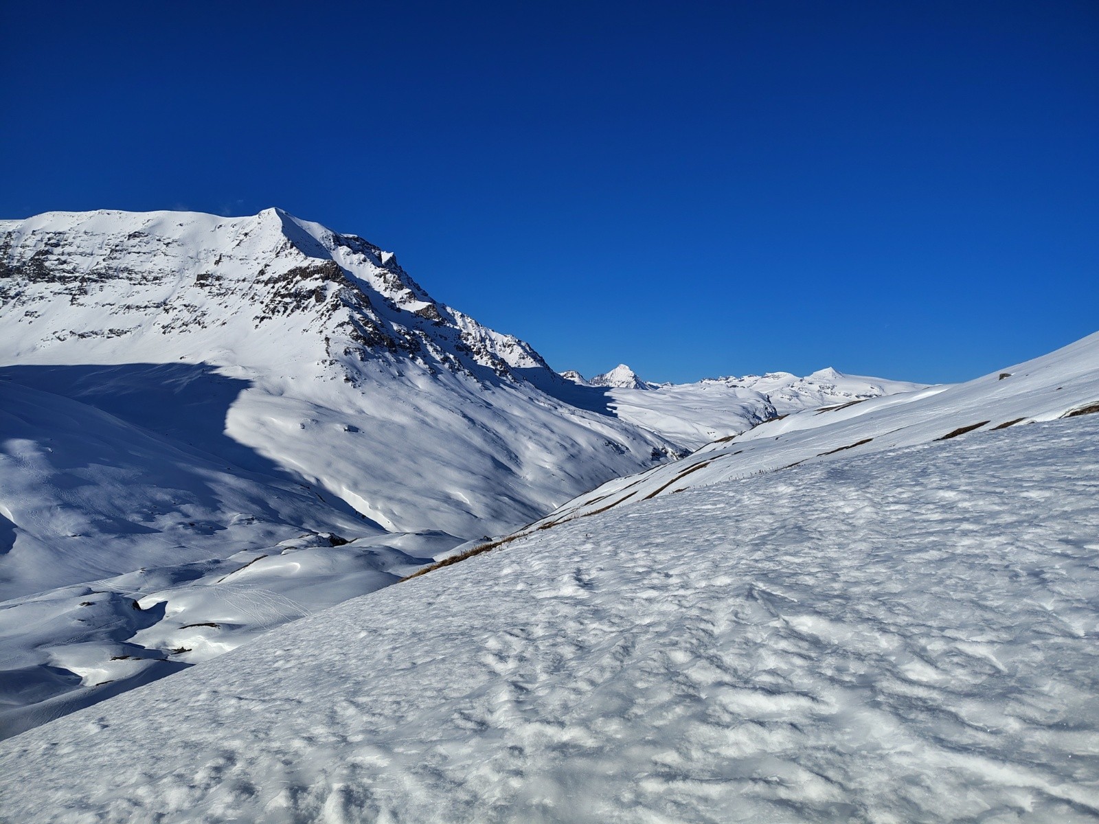 Nous basculons en nord du col des Barmesde l'Ours et arrivons à trouver de l'excelente poudre tassée en restant le plus possible sur les pentes nord. Mais arrivé au Pissets (~2500m) c'est moquette, poudre lourde et finalement la collante sur le bas.