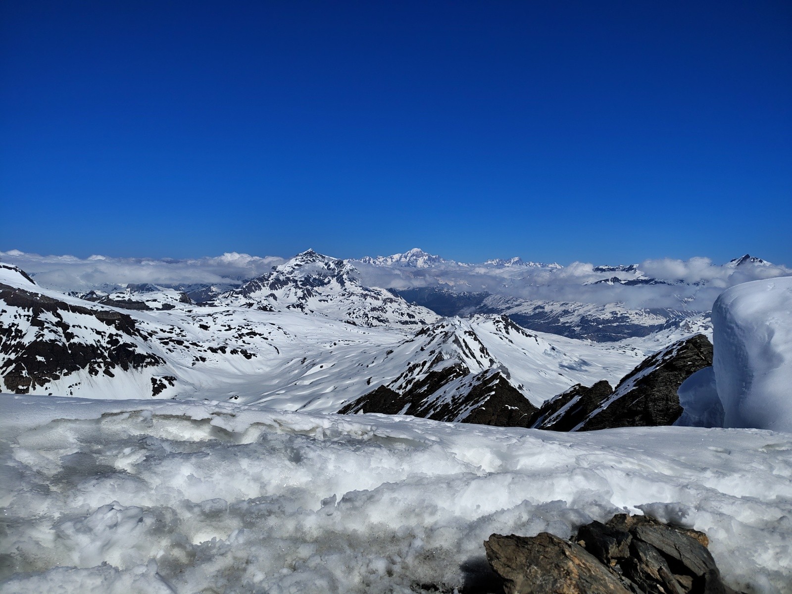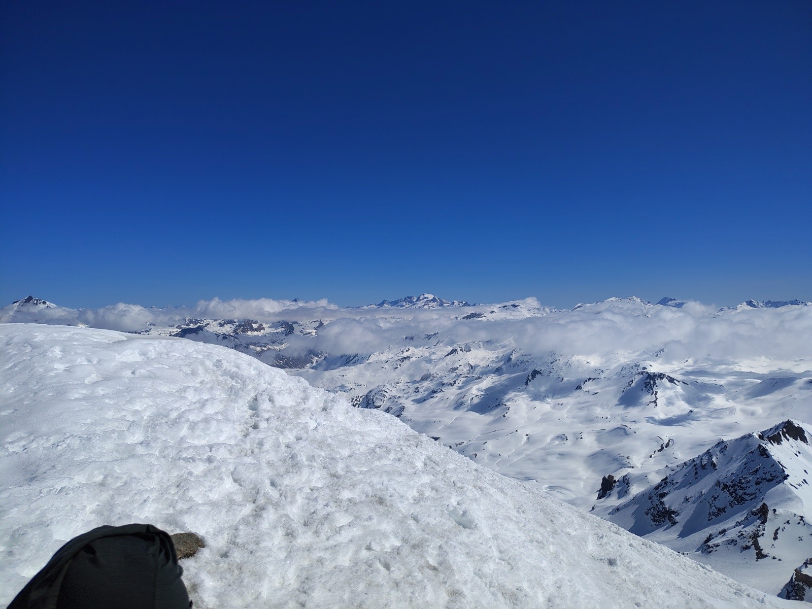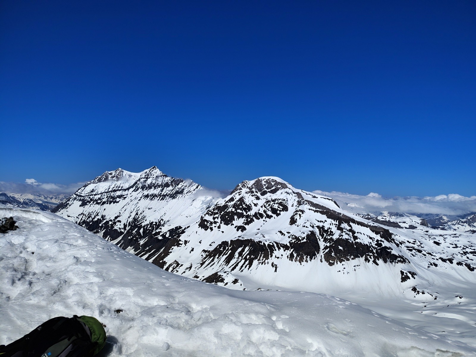 Départ du refuge à 8h. Nous montons plein sud sur une neige bien regelée. Puis nous poursuivons la montée dans une orientation plutôt est et un peu raide (30°/35°). Ça chauffe vite, nous essayons de ne pas trop traîner, mais il fait chaud. Nous débouchons au dessus du col. Une petit paude et nous attaquons la fin. Il fait de nouveau chaud. Surperbe vue en haut. Bonne pause.