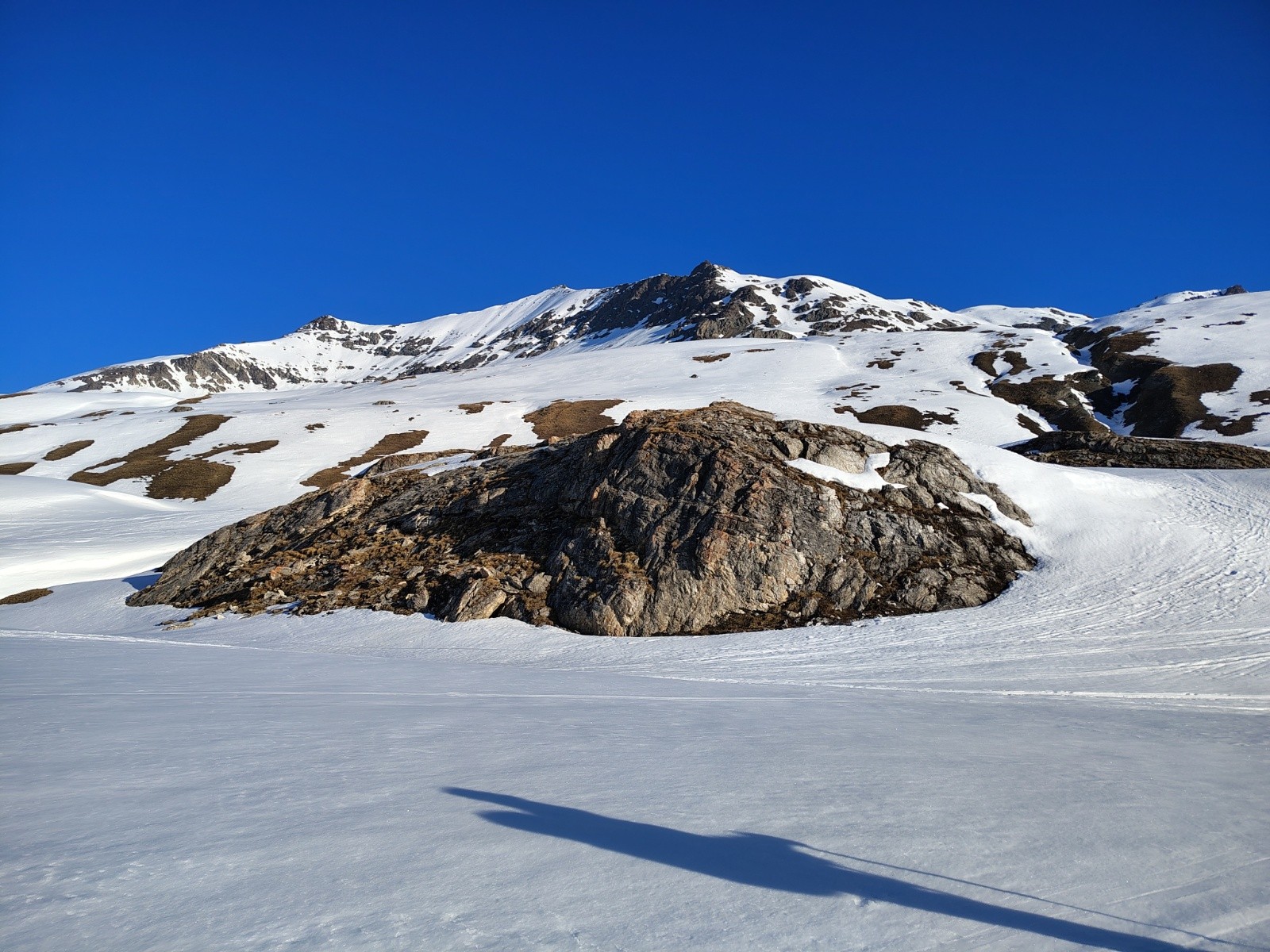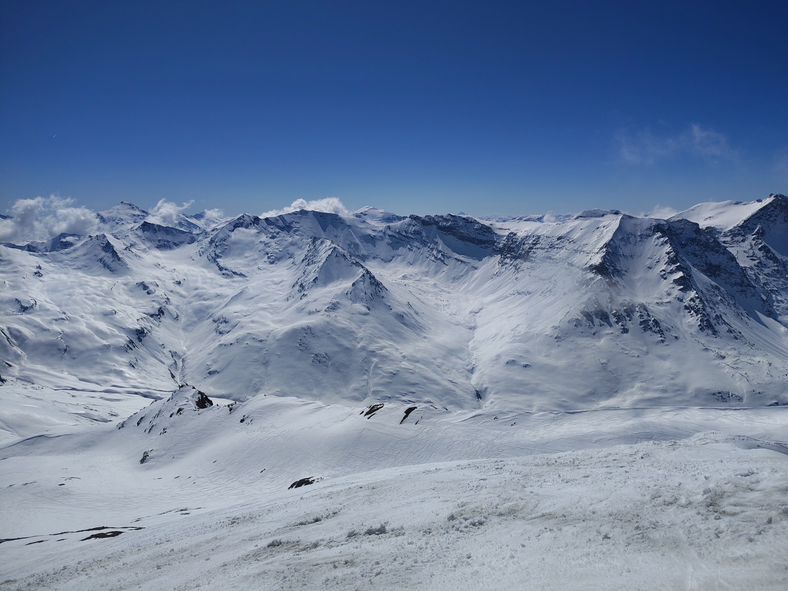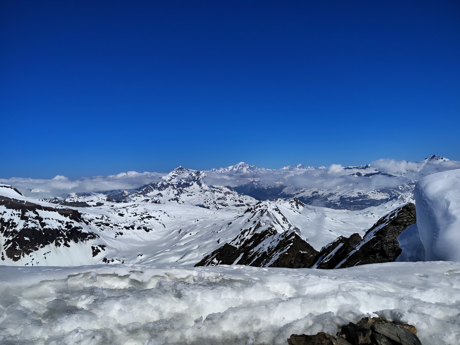 Départ du refuge à 8h. Nous montons plein sud sur une neige bien regelée. Puis nous poursuivons la montée dans une orientation plutôt est et un peu raide (30°/35°). Ça chauffe vite, nous essayons de ne pas trop traîner, mais il fait chaud. Nous débouchons au dessus du col. Une petit paude et nous attaquons la fin. Il fait de nouveau chaud. Surperbe vue en haut. Bonne pause.