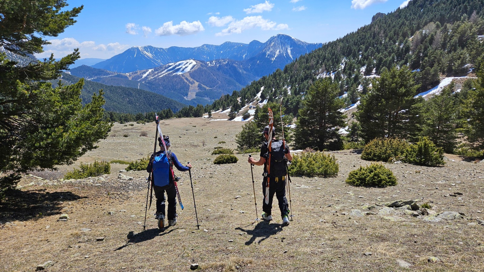 On a chaussé au parking d'été, montée sur neige dure qui décaille doucement en direction du lac d'En Veillos (la montée au col de Veillos ne passe plus)