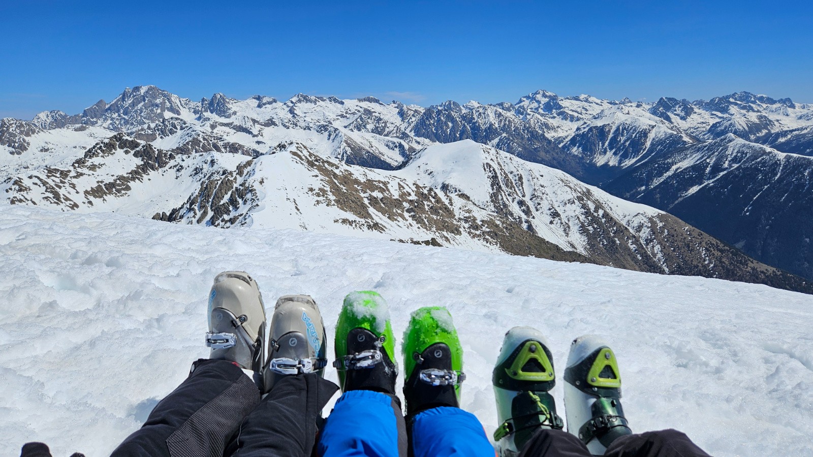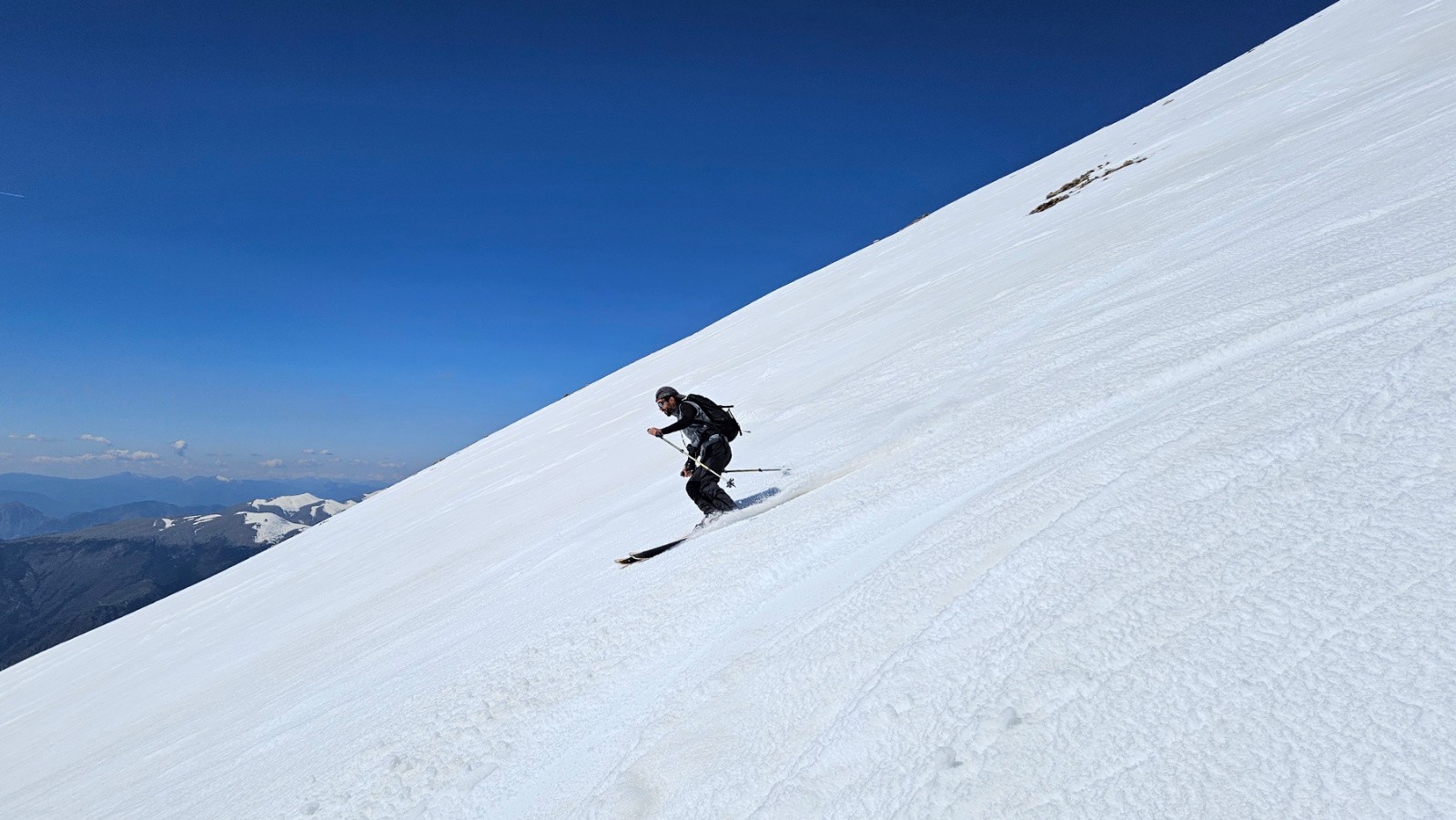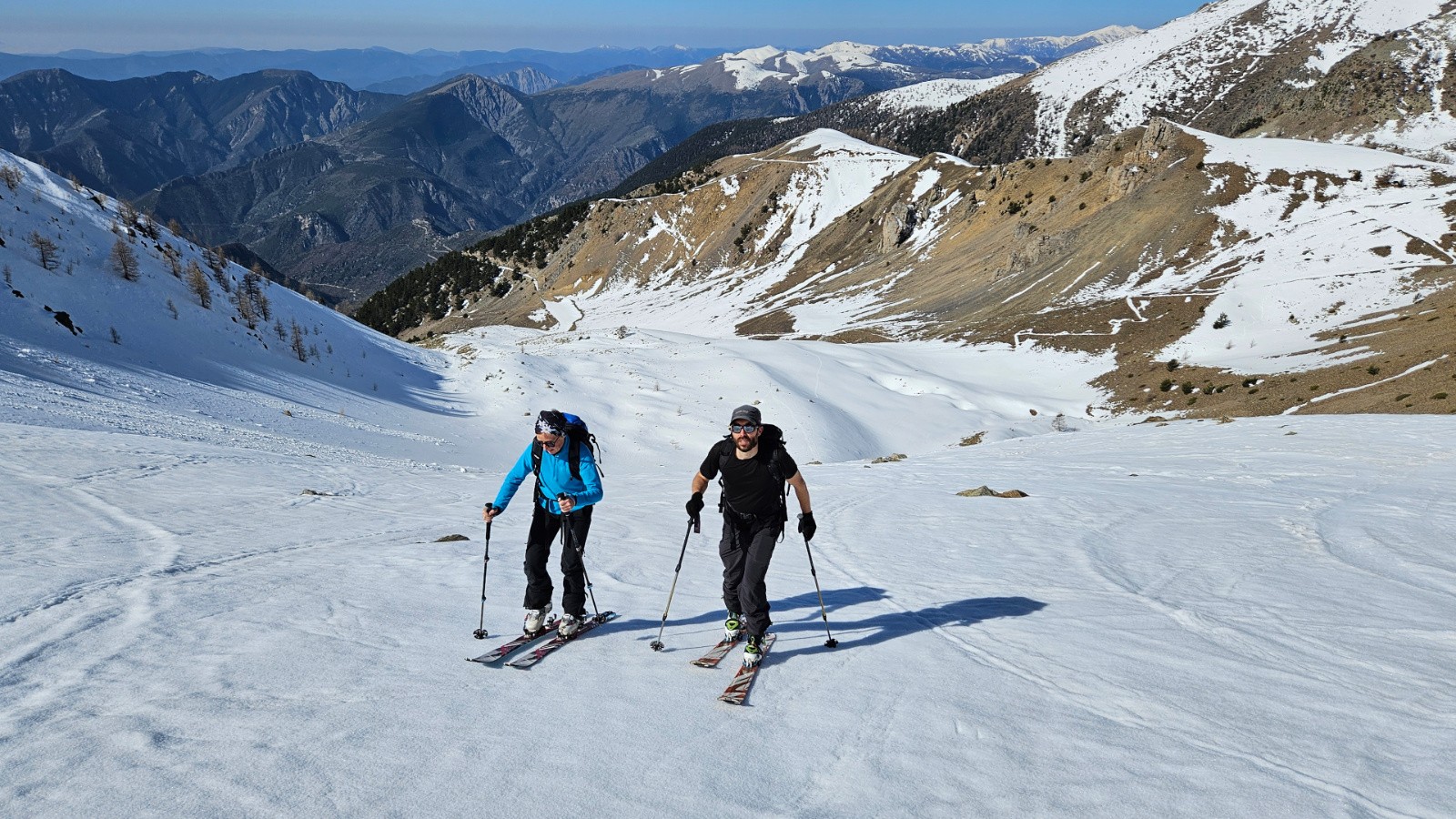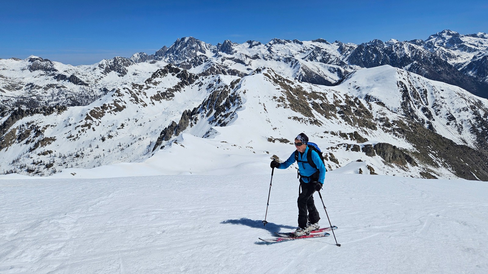 On a suivi la crête avec les skis sur le sac, puis repeauté dans les pentes sommitales