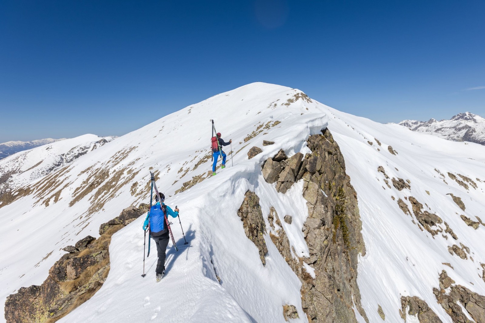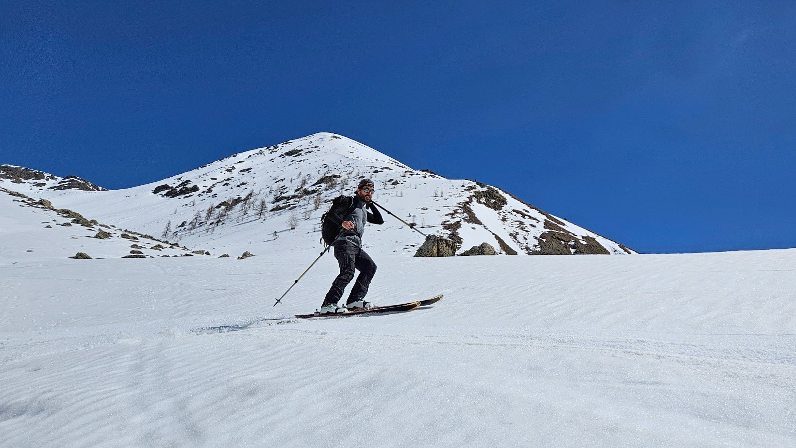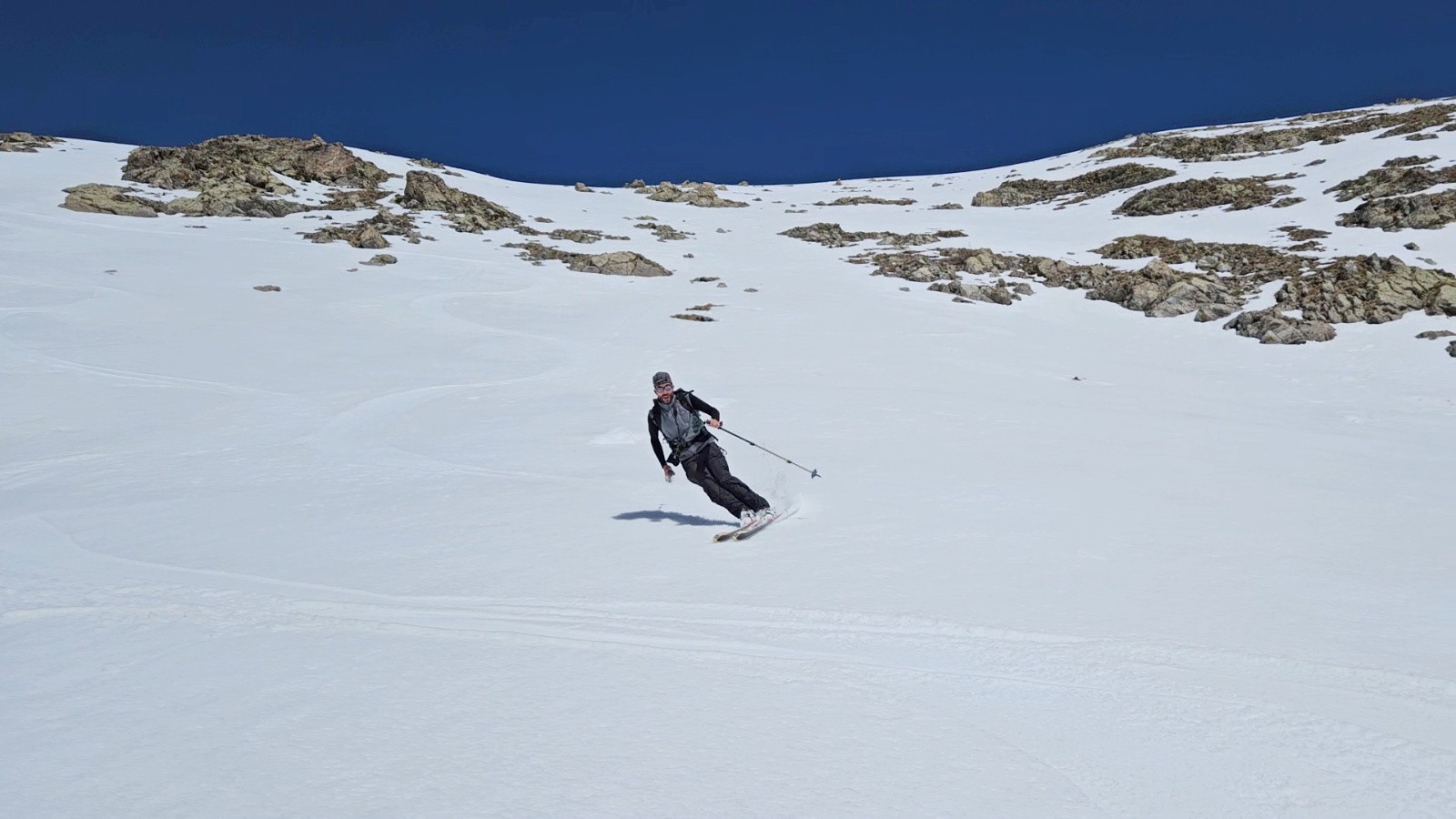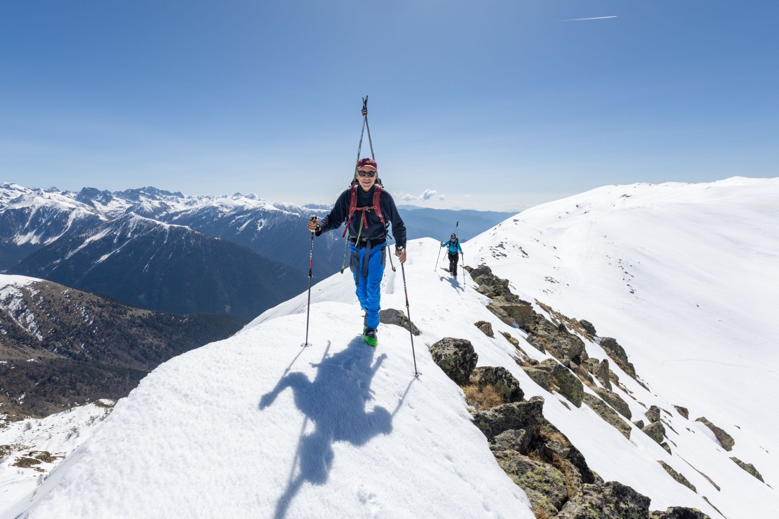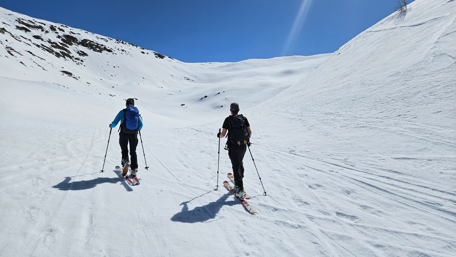 On a suivi la crête avec les skis sur le sac, puis repeauté dans les pentes sommitales