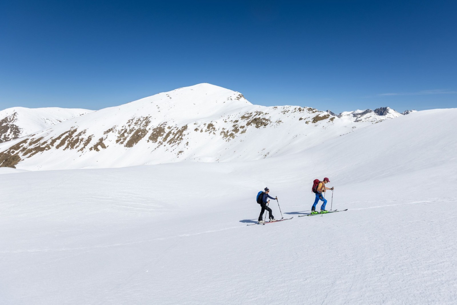 On a mis les couteaux dans un goulet raide en neige dure, puis à peaux jusqu'à la crête entre le Pétoumier et Pépoiri