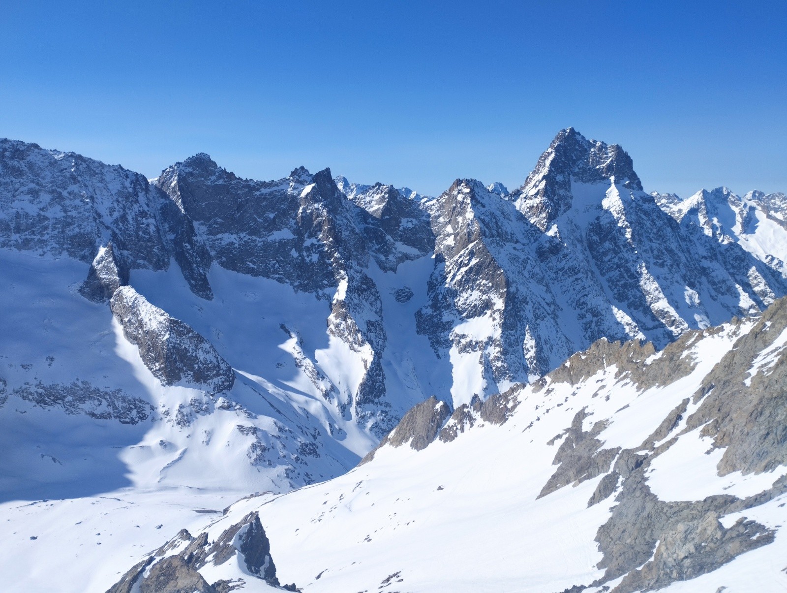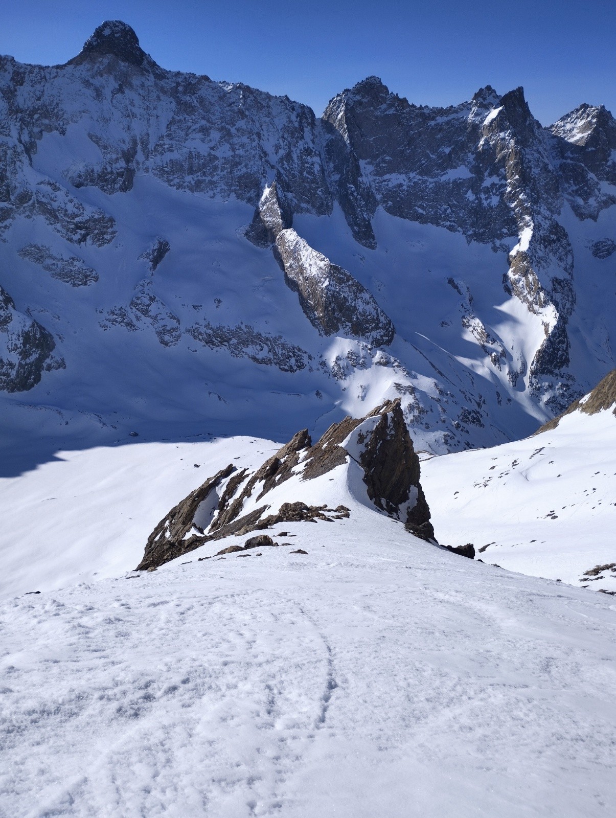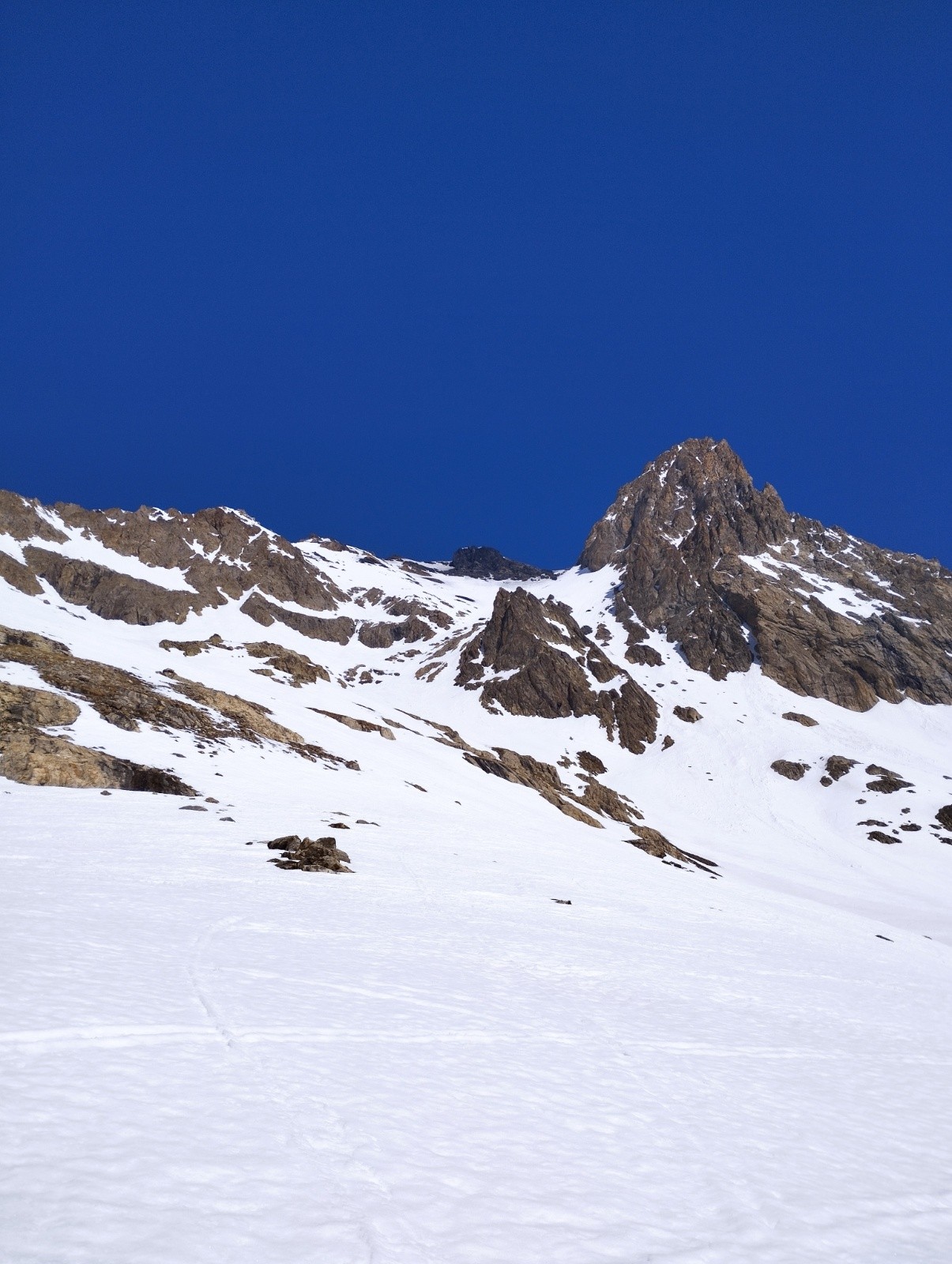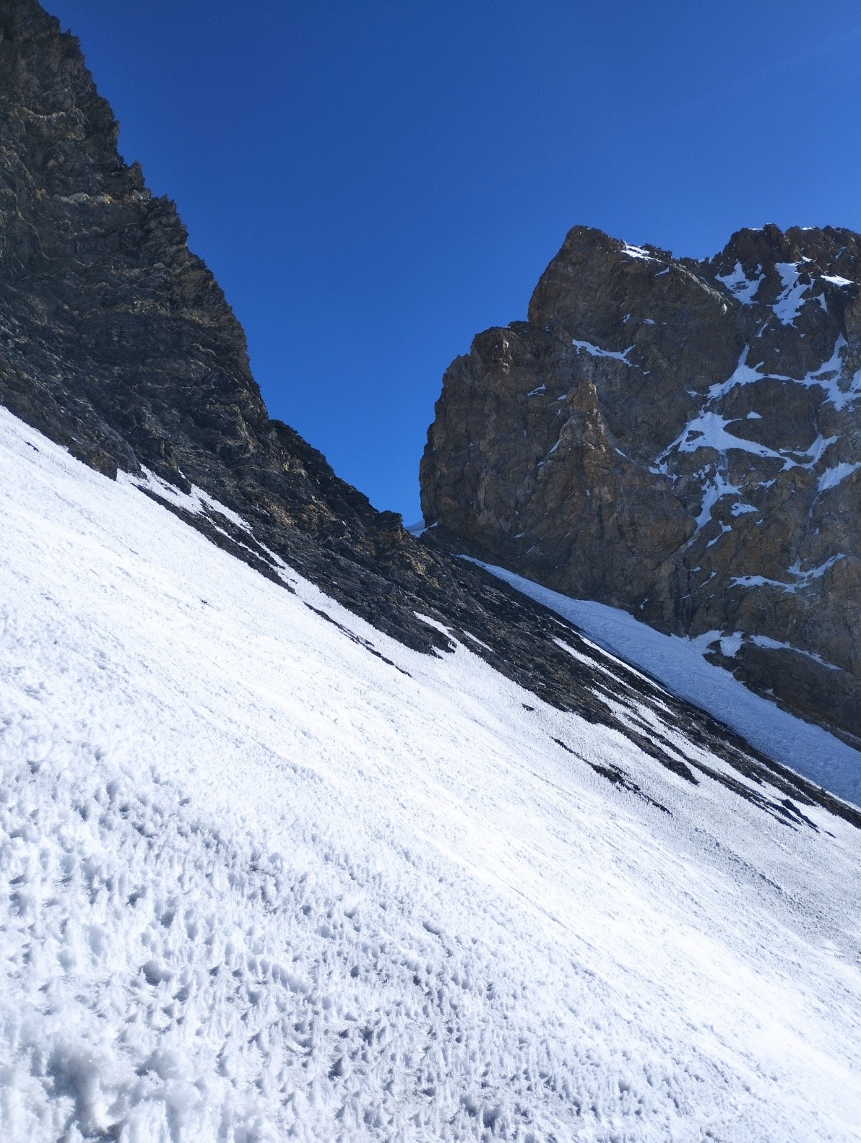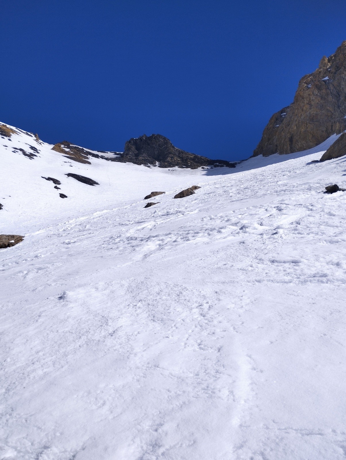 On remonte la face sud via les pentes directement au dessus du refuge, puis via le goulet (qui passe en conversions), puis la grande pente au dessus du goulet.