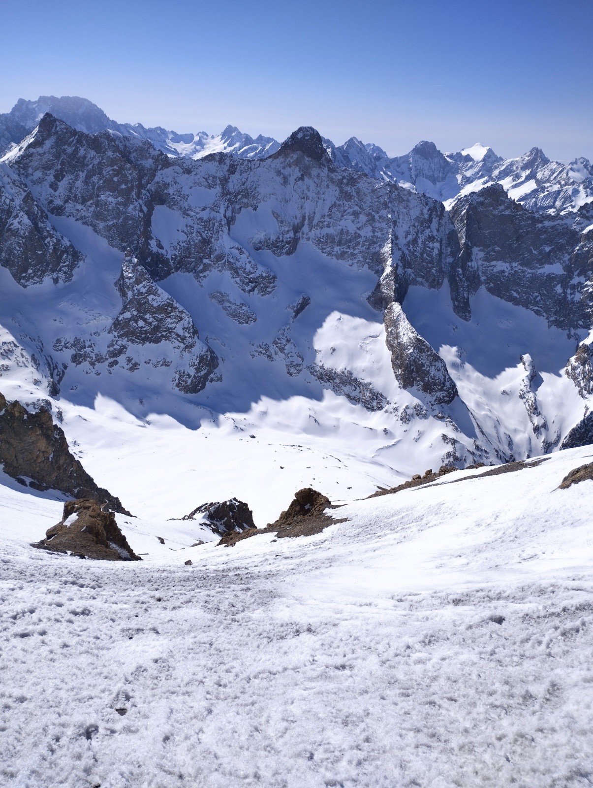 Conseils aux amateurs de moquettes : arriver aux alentours de 11h30 / midi au dôme quand il fait beau est un très bon horaire pour profiter d'une super moquette dans la face sud. On jouera sur les expositions sud-est du début de la face (au soleil plus tôt) pour ensuite rejoindre le goulet puis viser tout droit sur le plat en dessous du refuge (les dernières pentes ne seront pas encore trop molles à cette heure là)