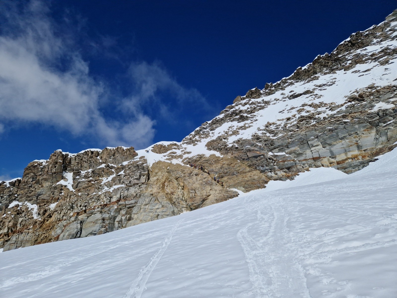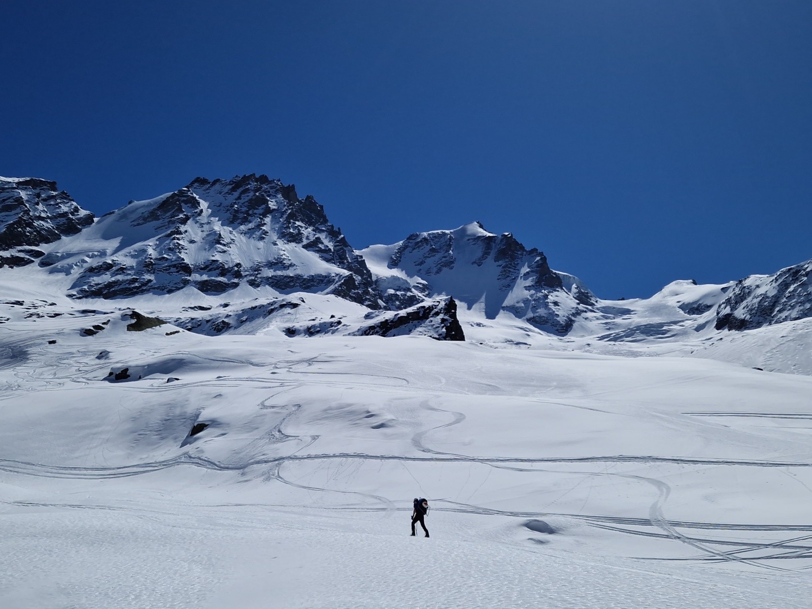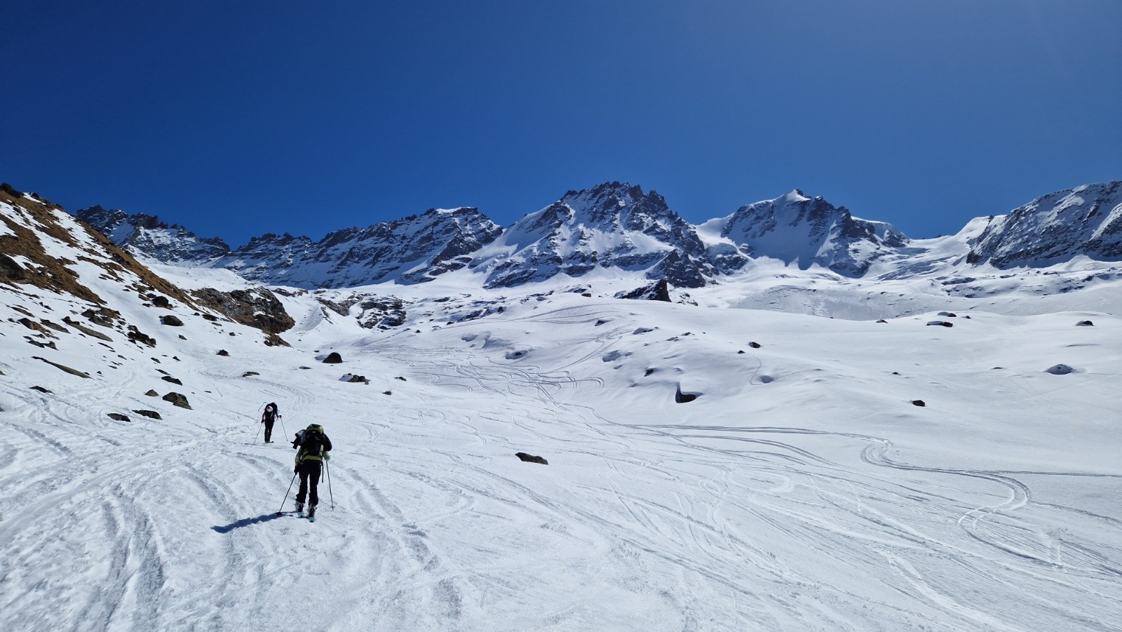 On y dépose quelques affaires et on repart vers le glacier de Montandayné. Une longue diagonale à gauche nous amène au pied du Col Est du Grand Neyron. Nous laissons les skis là. Nous remontons une rampe terreuse puis une vire enneigée (expo) qui nous conduit au col. Descente dans le même versant mais en rive droite, là où les pentes sont mieux exposées.