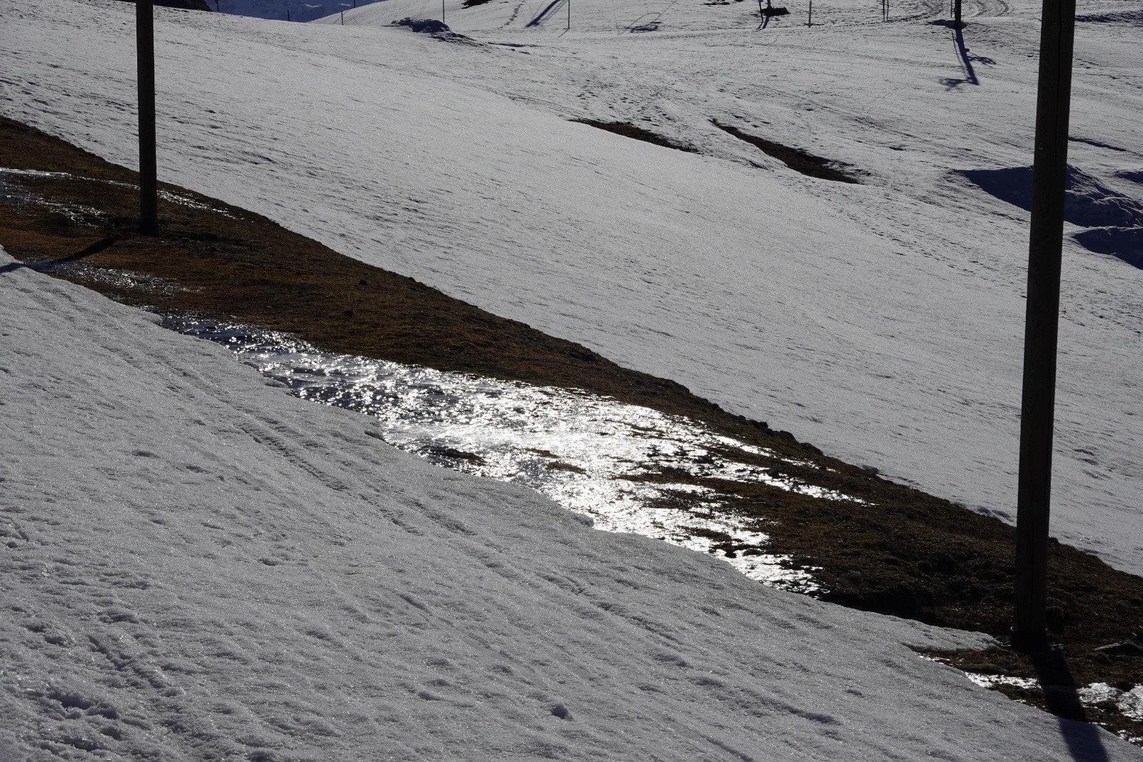 Moi je mets les couteaux pour ne pas déraper sur la sous couche de neige artificielle transformée progressivement en glace, que la neige tombée récemment recouvre péniblement.