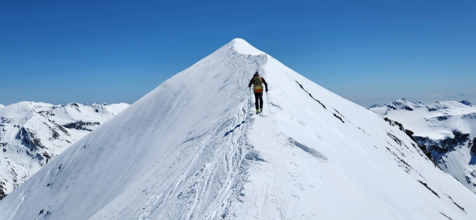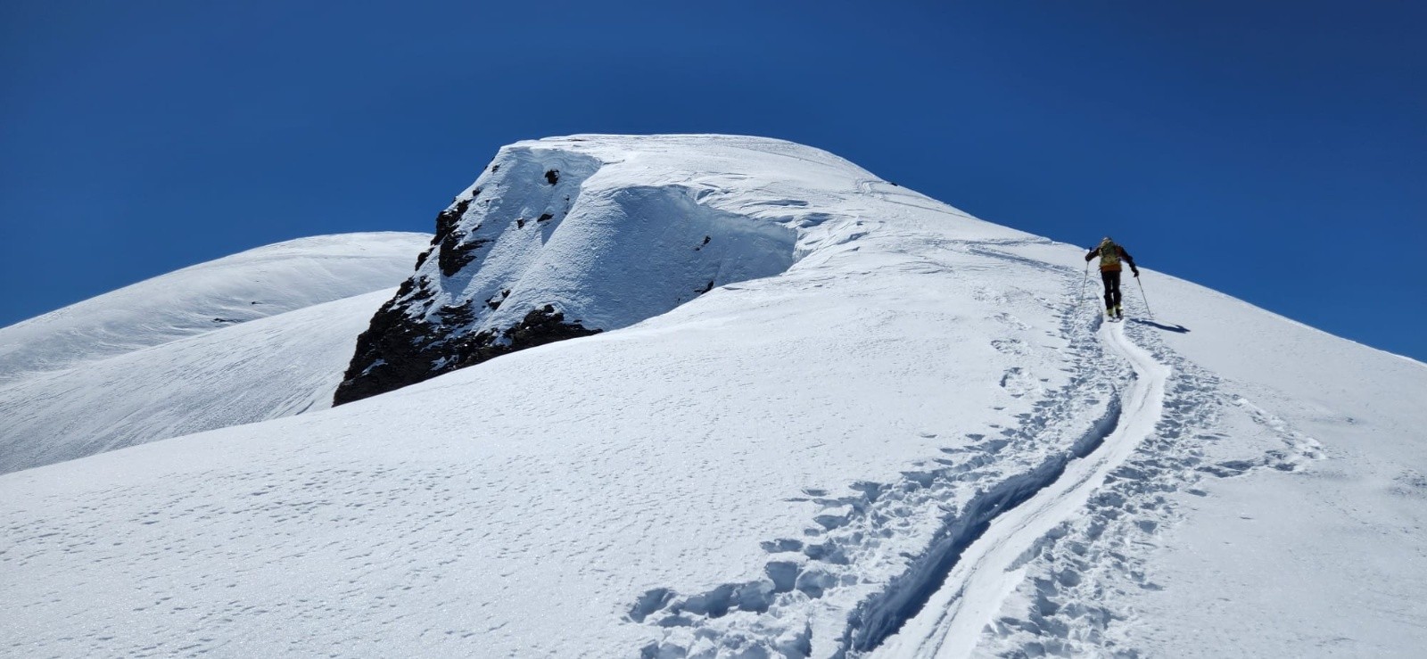 La montée sur le rocher de la Caille était tendue, couteaux obligatoires ou crampons si on veut être tout à fait prudent. Le reste est du velour, super trace jusqu'au sommet dans une neige restée froide grâce à l'altitude et à son exposition N, superbe arête finale, découverte pour Rémi et Mathurin, et moi je ne m'en lasse pas.