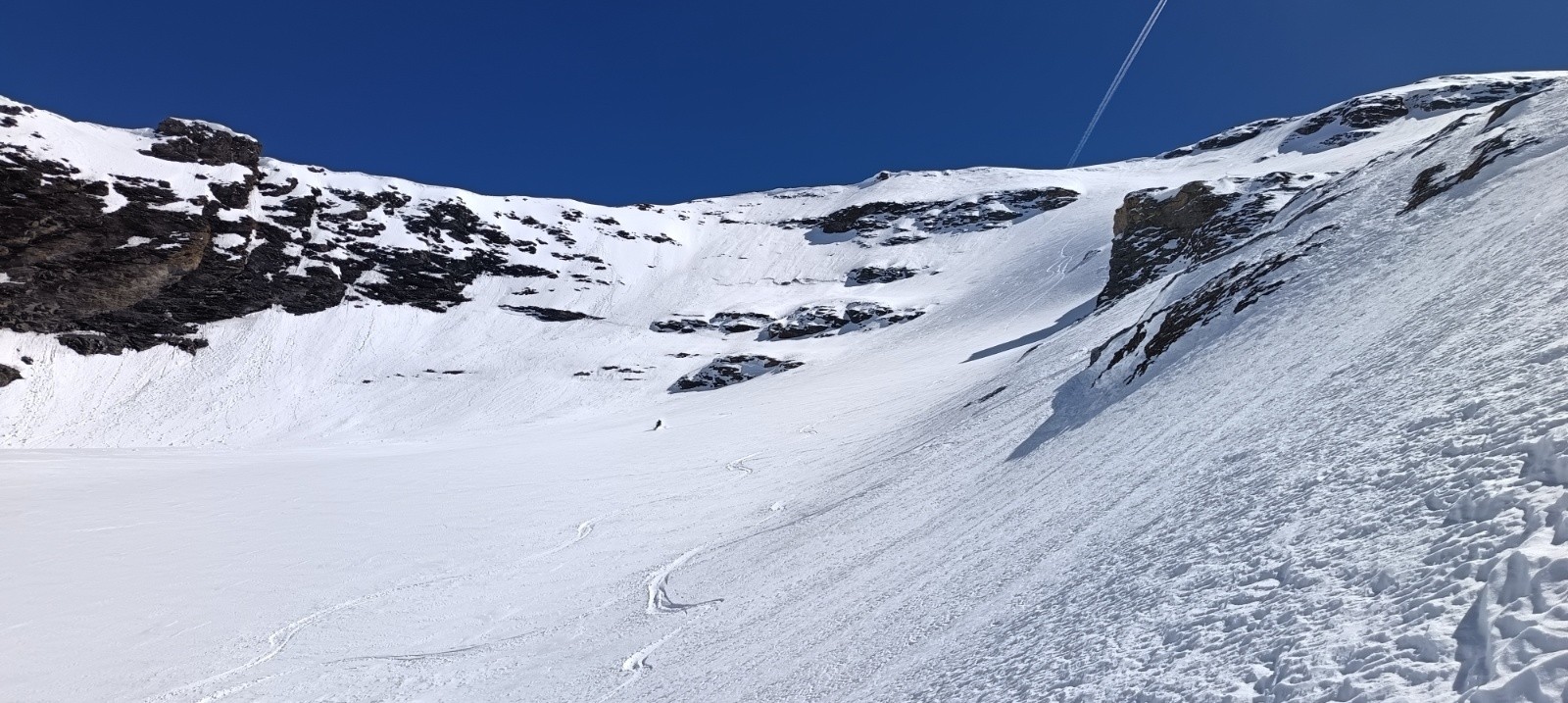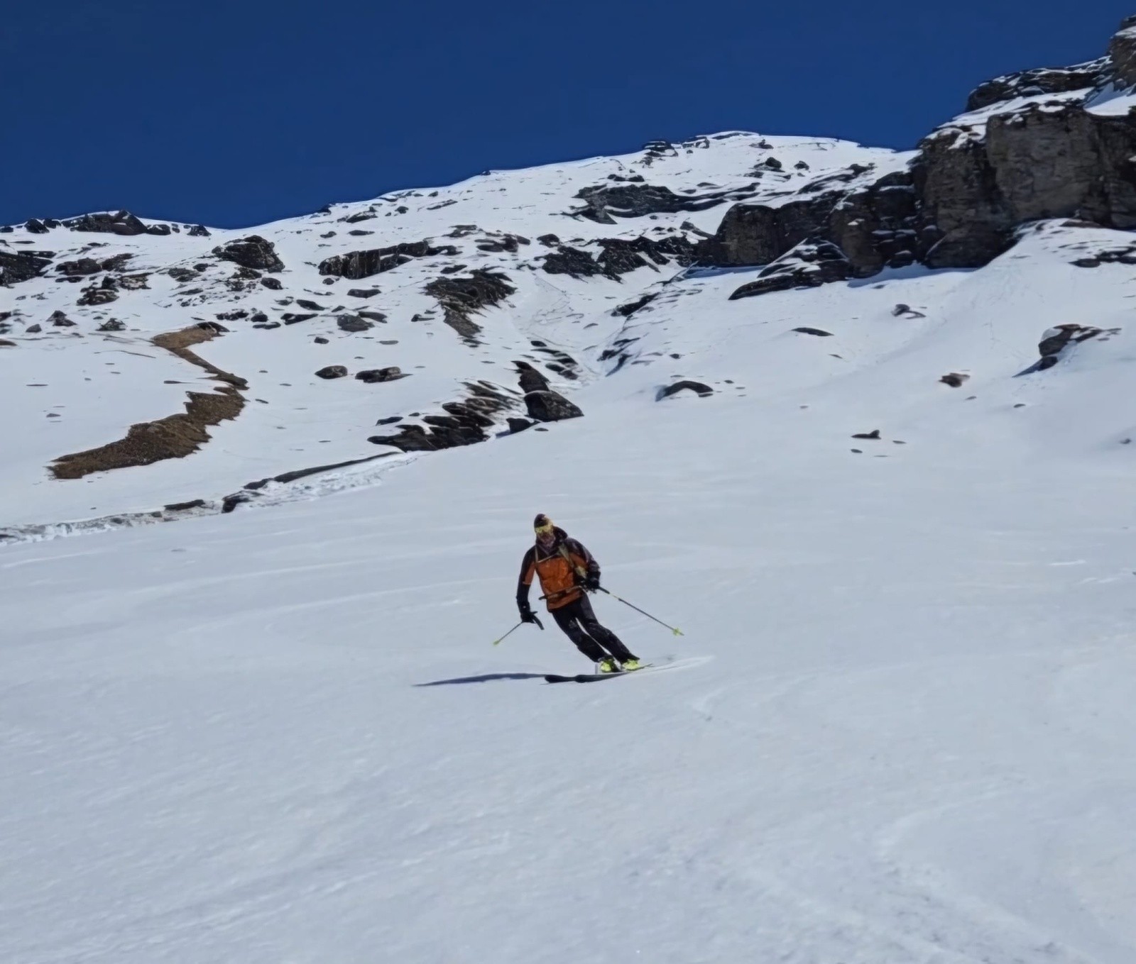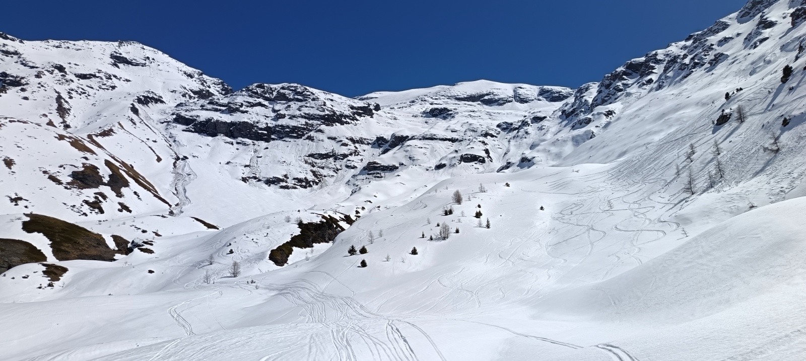 Pas mal de traces pour la descente mais il y'avait encore de la place pour se faire plaisir, et trouver de la bonne poudreuse, quand il fait 25°C en vallée on ne va pas se plaindre.