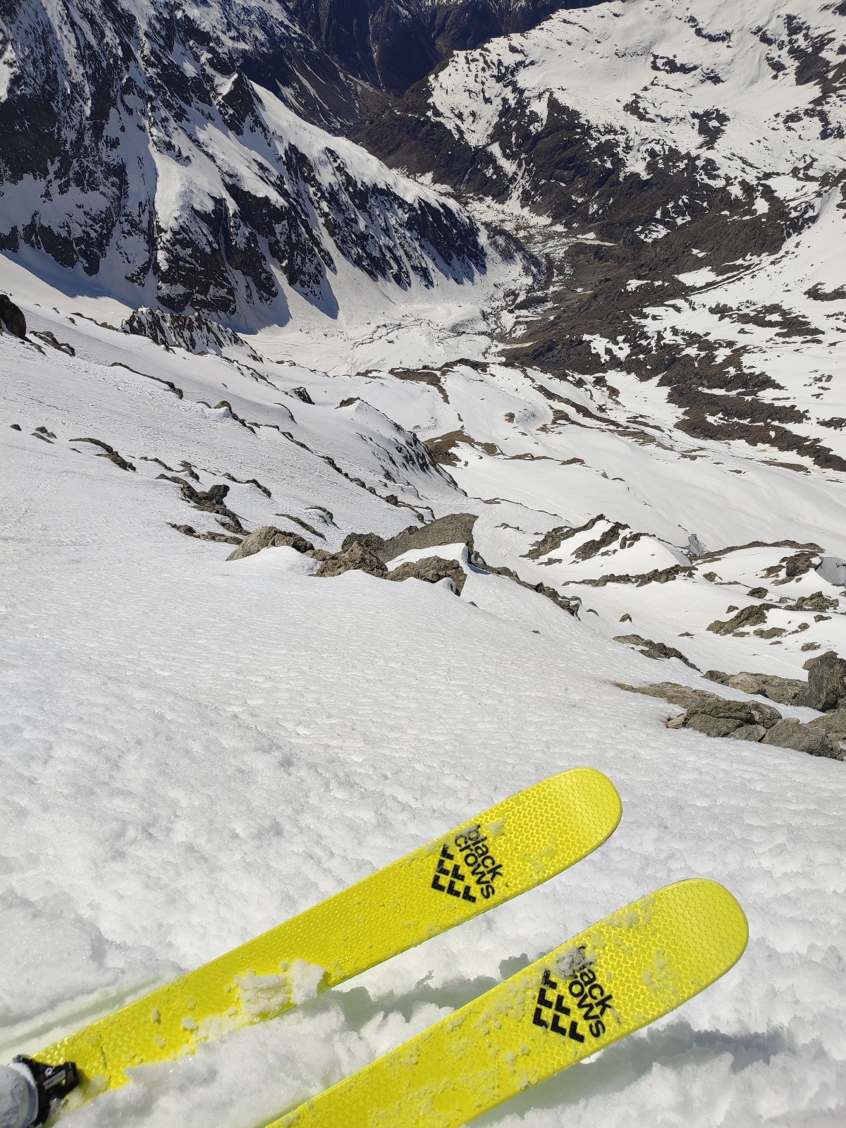 Sommet, glacier du Says, versant Bérarde : Encore un peu de neige froide, agréable à skier. Décaillée en est. Pas de rimaye ni de crevasse visible.