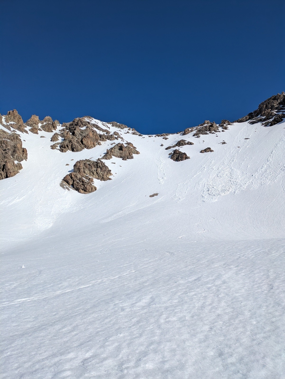 Le regel était bon sur la montée mais vers 10h, sur les pentes les plus fortes, la croûte commence à lâcher sous les crampons et on s'enfonce jusqu'au genou. Je m'arrête un peu au dessus du col vers 3020m (point 3009 sur la carte), la pente finale étant très Est et me semblant déjà très réchauffée (il était 10h15, il aurait fallu viser un peu plus tôt encore).