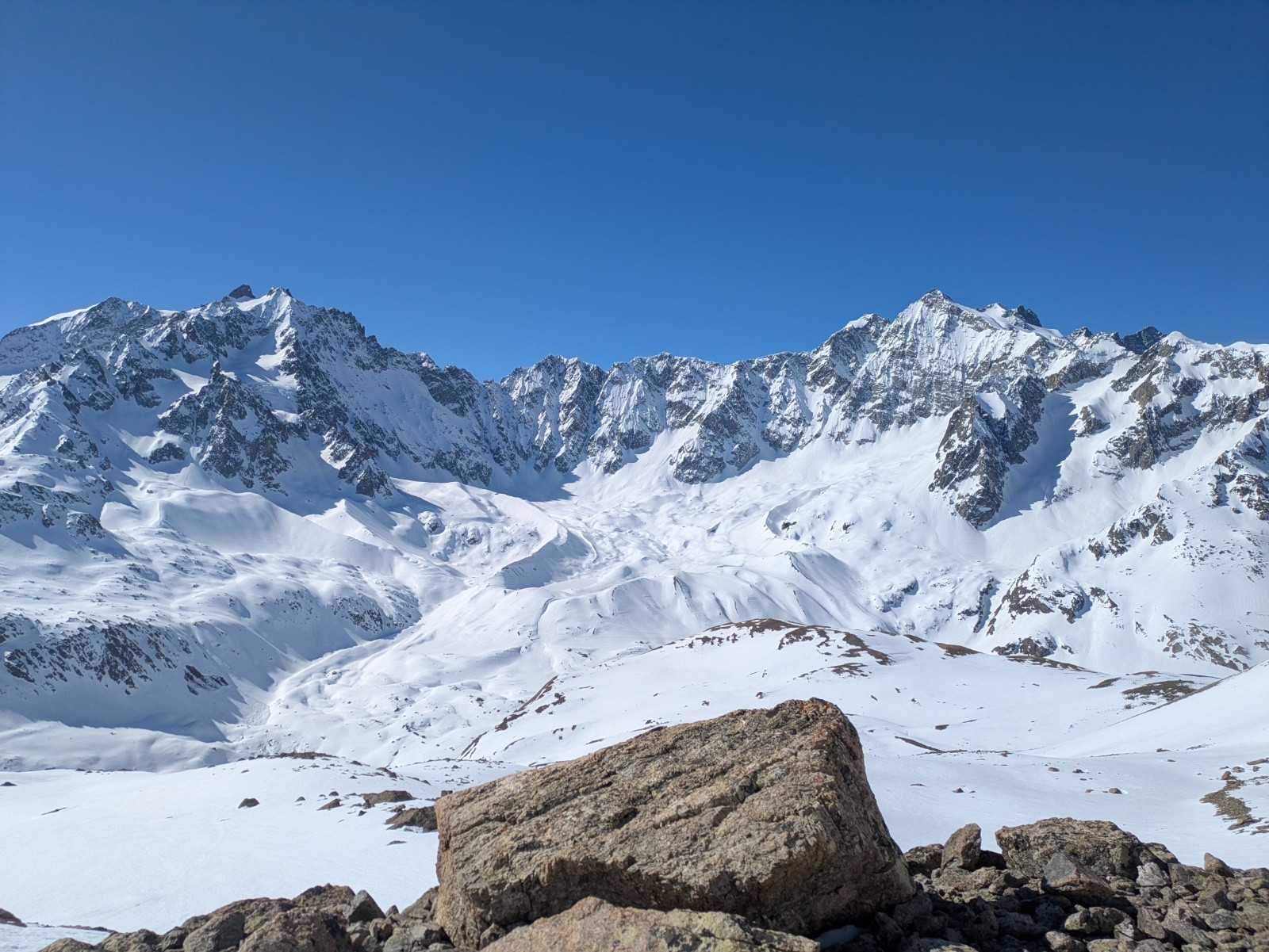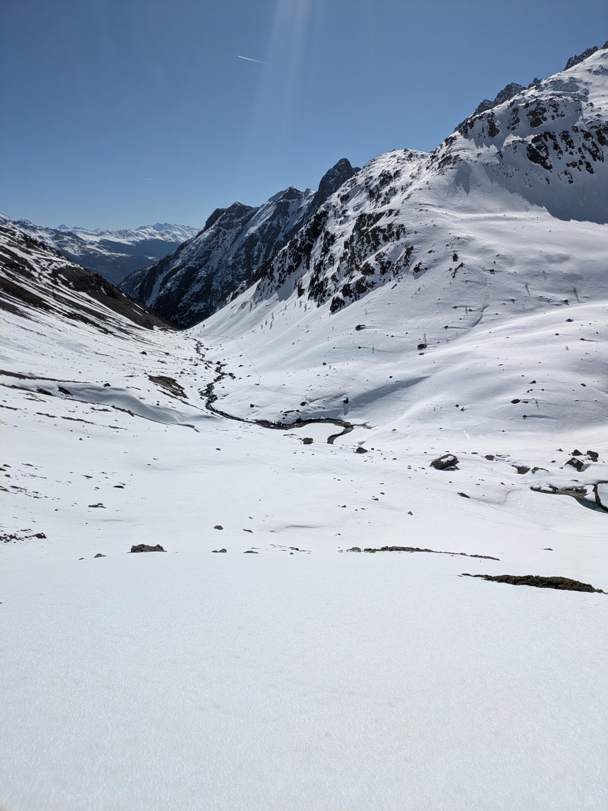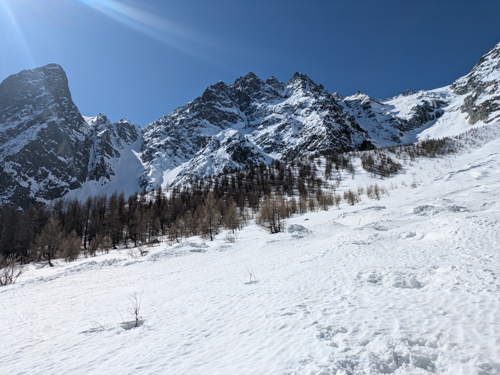S'il reste plein de neige sur les versants nord, les sud sont déjà bien clairsemés, même à 2200-2400, et il faut choisir ses trajectoires pour parvenir au replat de Valleyssart. A ce moment là, la pointe de l'étendard Ouest me semble bien trop encore à l'ombre pour être accueillante et je m'engage vers le Pic du Lac de Combeynot.