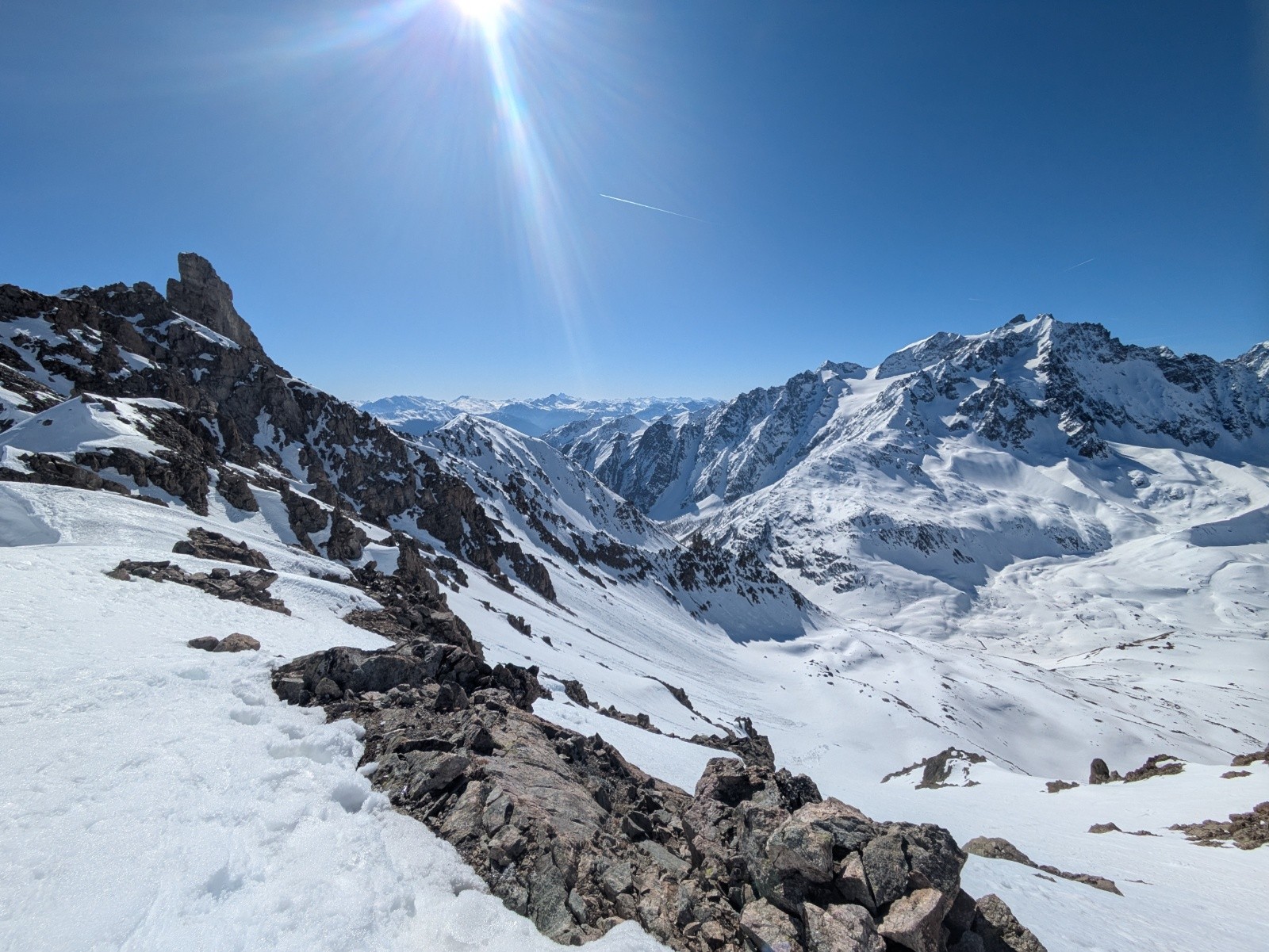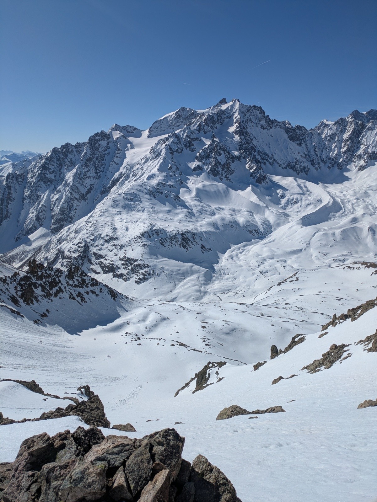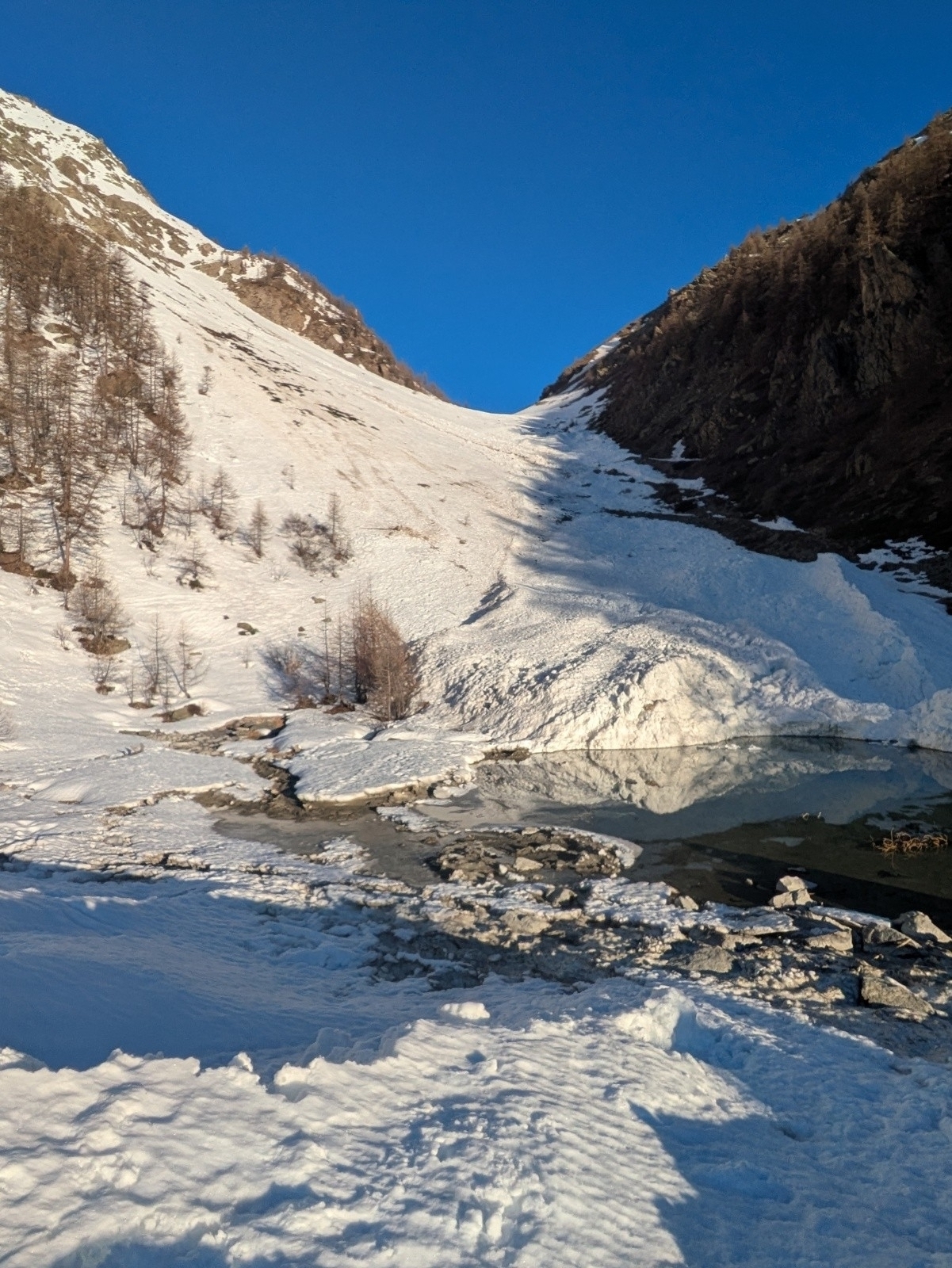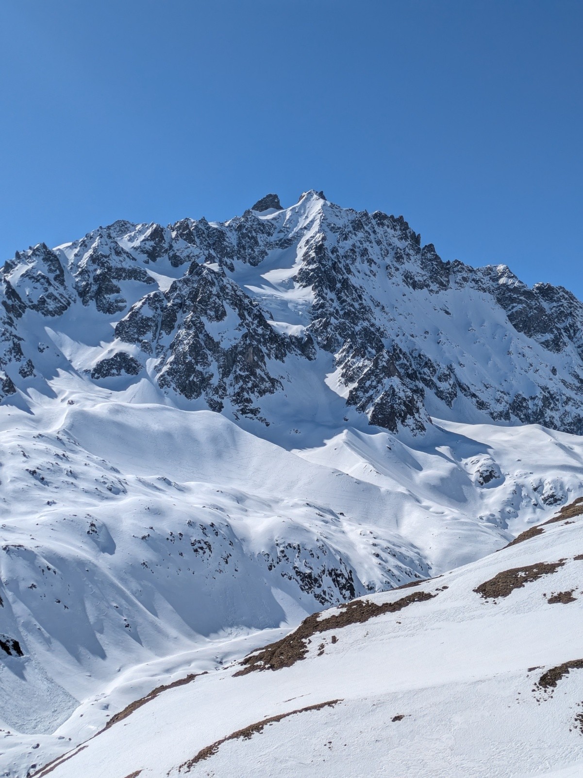 S'il reste plein de neige sur les versants nord, les sud sont déjà bien clairsemés, même à 2200-2400, et il faut choisir ses trajectoires pour parvenir au replat de Valleyssart. A ce moment là, la pointe de l'étendard Ouest me semble bien trop encore à l'ombre pour être accueillante et je m'engage vers le Pic du Lac de Combeynot.