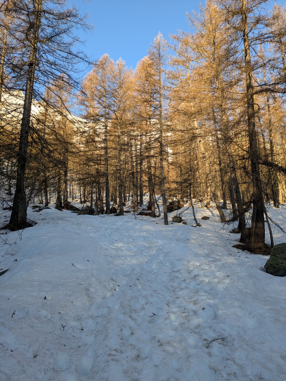 Remontée du vallon du petit Tabuc. Encore pas mal de neige dans la forêt, ça chausse bas pour la saison (et pour mes références en Belledonne).