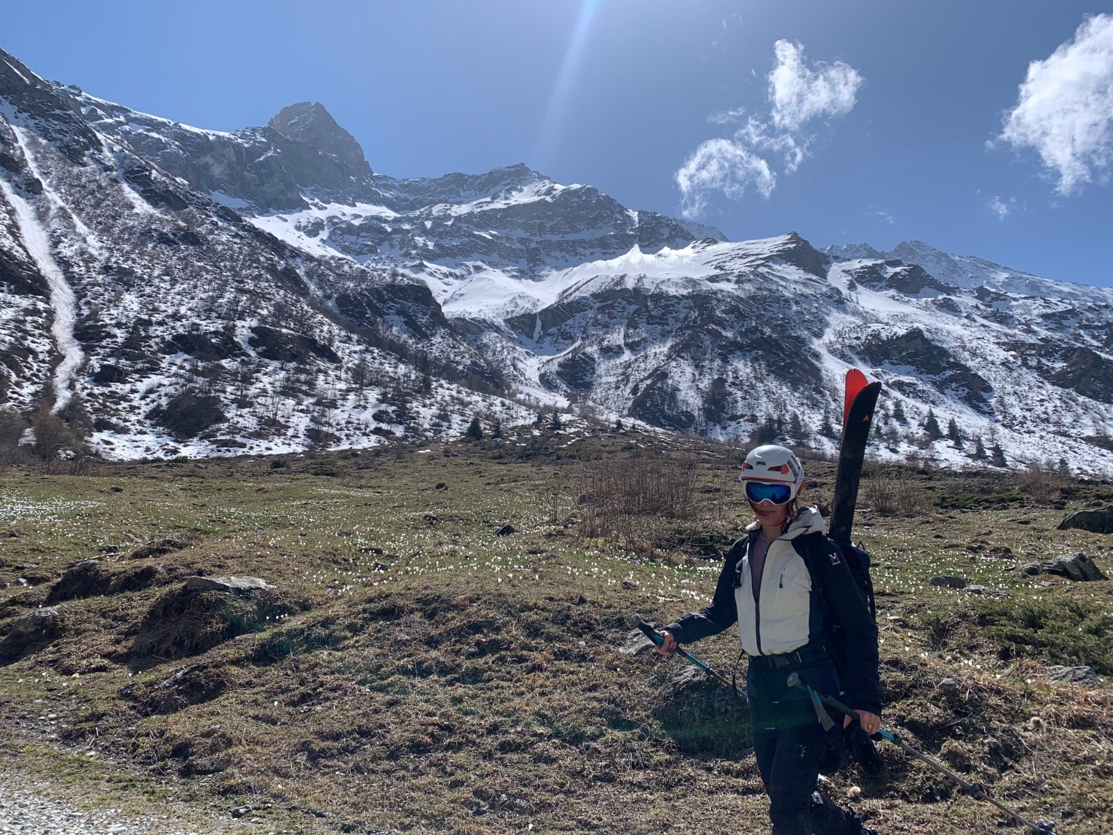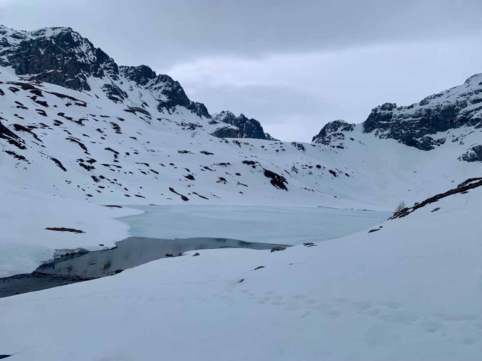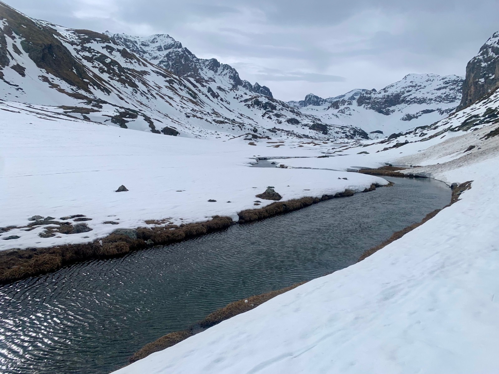 Itinéraire suivi : portage 400m pour rejoindre le loooong vallon qui mène au refuge d’entre le lac. c’est plat, mais le lac est joli. Après le lac, montée facile jusqu’au sommet. Il n’y a pas beaucoup de neige, et ça ne va pas s’améliorer avec la pluie annoncée. On cherche un peu l’entrée du couloir qui est un peu plus bas que le sommet.
