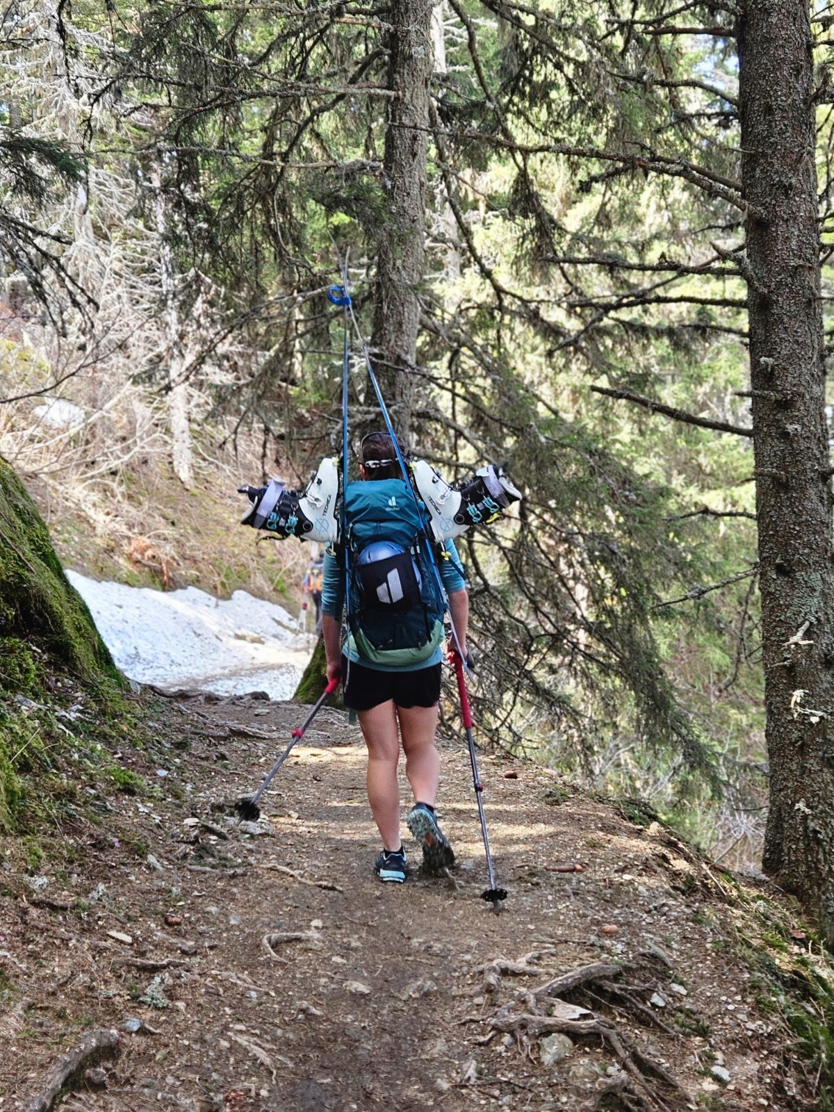 Altitude de chaussage/déchaussage : 550mD+ en basket à l'aller (chaussage sous le lac vers la cabane) ; au retour ça passe jusqu'au début de la forêt en slalomant entre les rochers sous la combe