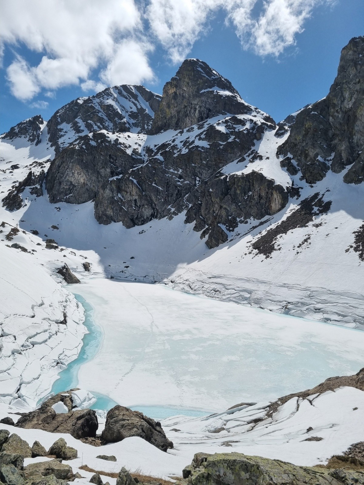 - une traversée aérienne du lac du Crozet (en début de débâcle) pour une fois sans avalanche à traverser mais à plusieurs dizaines de mètres au dessus du lac, faut pas glisser, la trace est propre.
