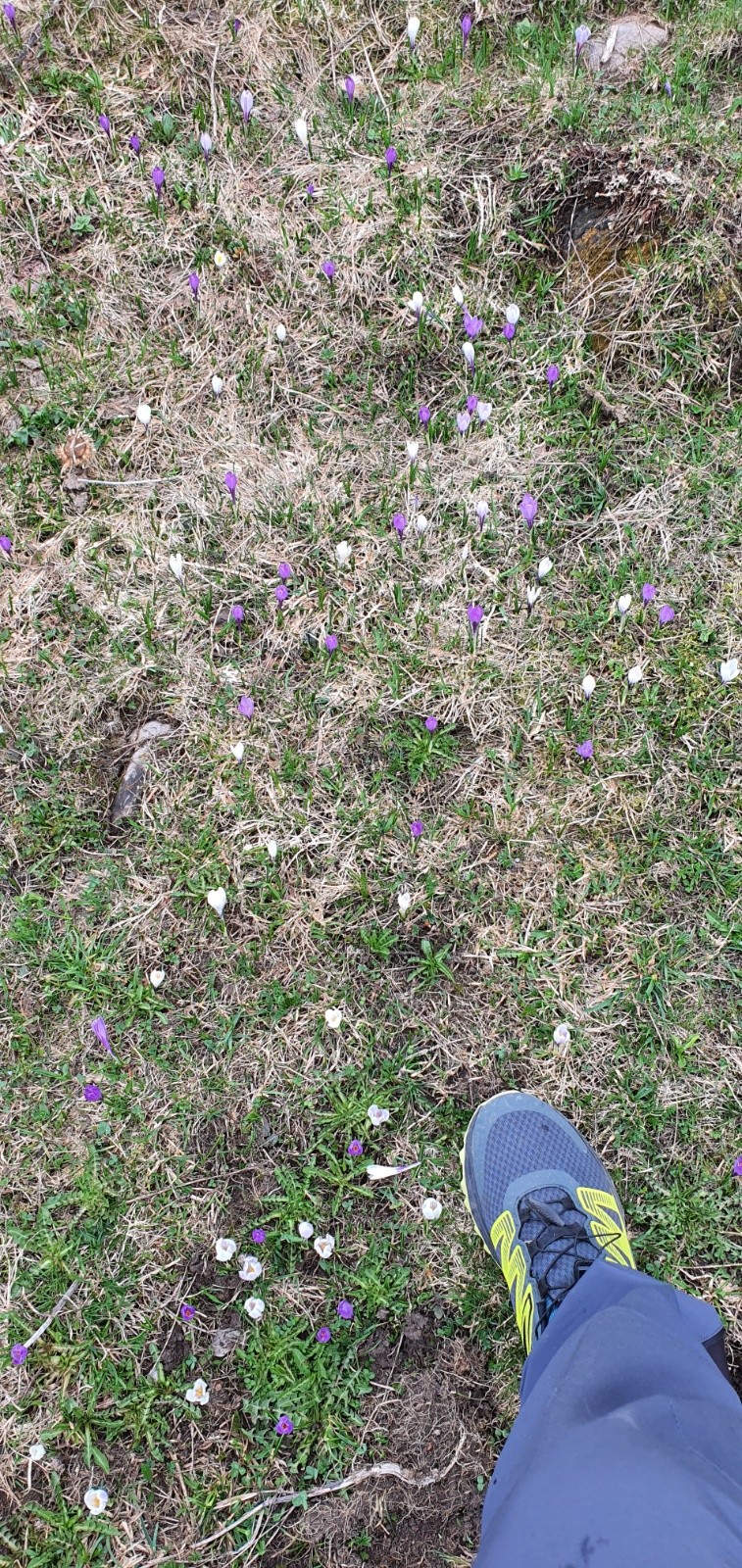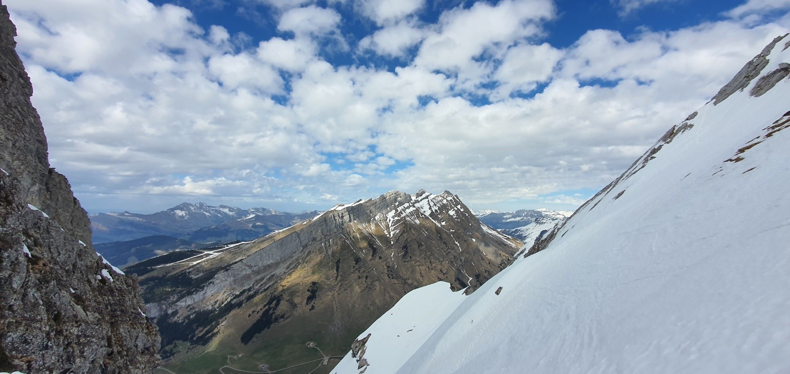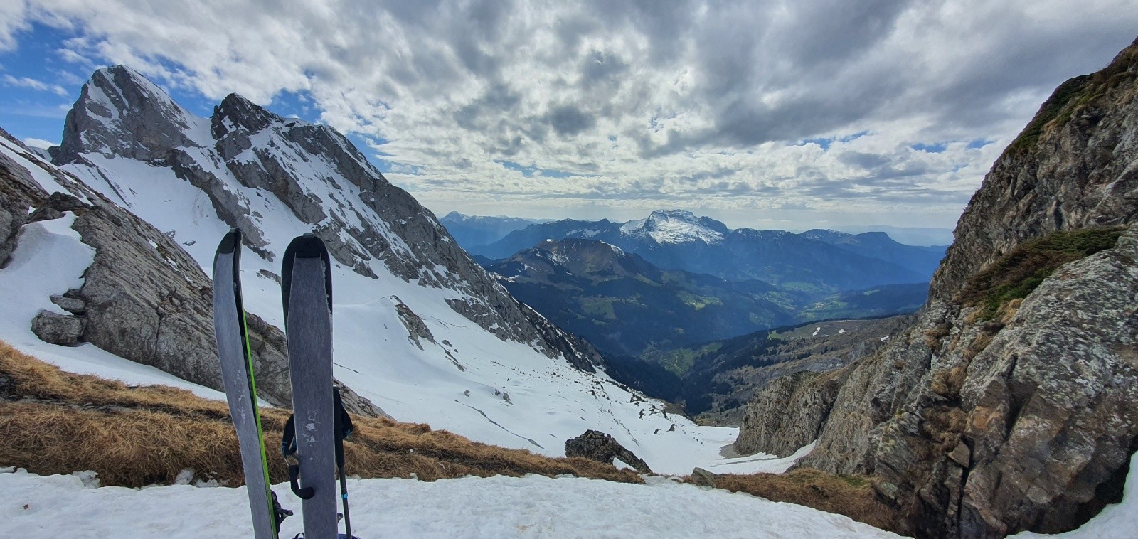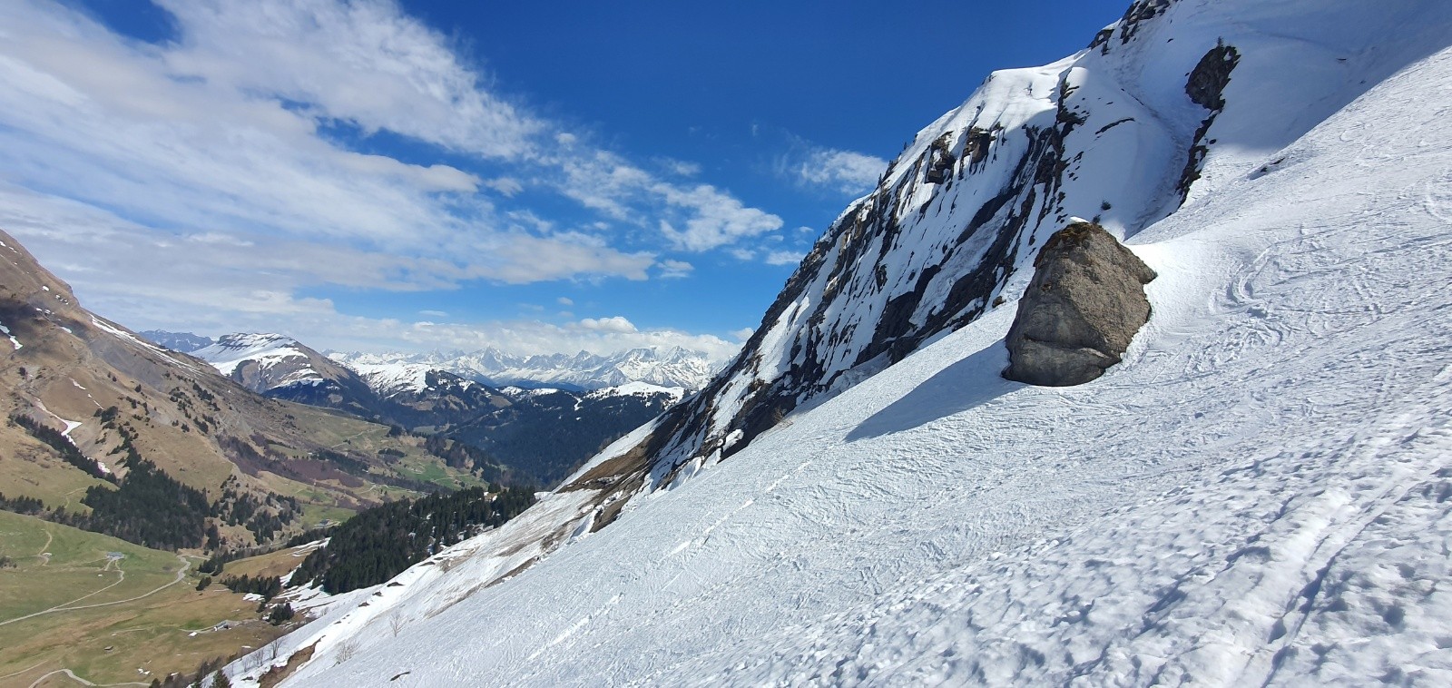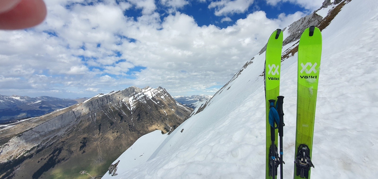 Conditions nivo et activité avalancheuse : pas de souci dans les combes où tout a été purgé mais méfiance sur les plaques ensoleillées. Ambiance fonte des neiges mais il ne reste plus grand chose. Ne pas s'approcher des rochers dont les corniches ou pentes amont n'ont pas encore été purgées mais dans la combe à Marion au-dessus des rochers exposés c'est déjà de l'herbe. Les cailloux et touffes sortent partout même en haut, mais en slalomant dans la colle ça passait encore.