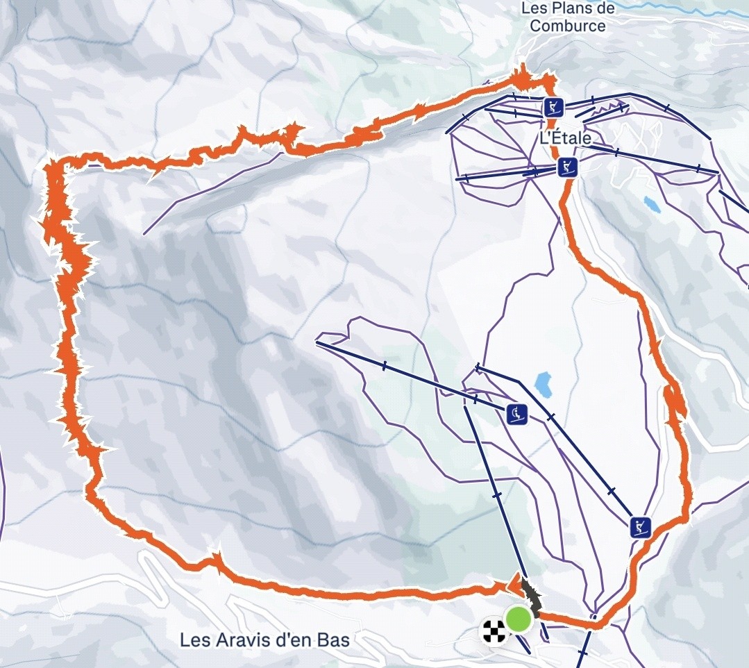 Itinéraire suivi : boucle Les Prises-> Col des Aravis -> Combe à Marion -> Col de Blonnière -> Alpage de Blonnière -> Comburce -> Col de Merdassier-> Les Prises de La Clusaz.