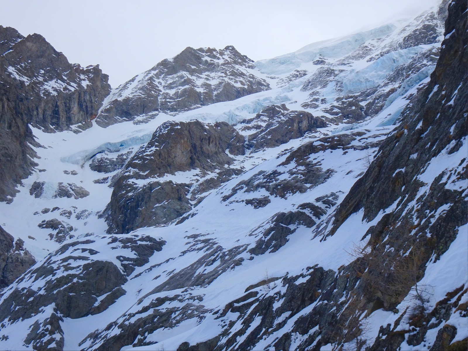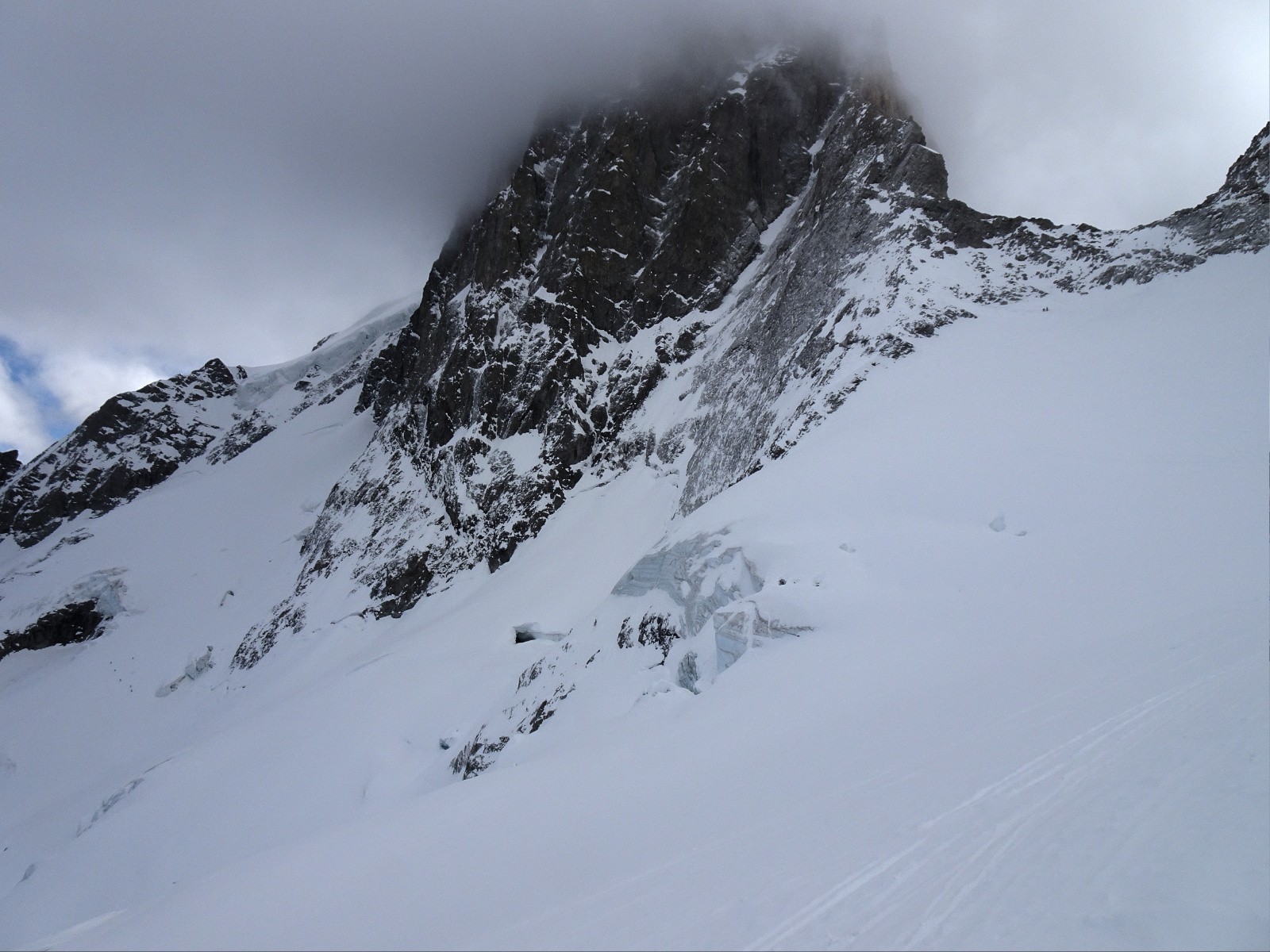La brèche se remonte dans la neige, et bloque complètement les nuages : d'un côté on ne voit pas les cordées de derrière, de l'autre on voit la Grave au soleil. N'ayant pris qu'une corde de 30m insuffisante pour le rappel, on garde les crampons pour traverser à droite vers une pente de neige. C'est expo mais il y a de quoi faire passer la corde sur des becquets. En dessous, on voit un bon nombre de traces qui descendent vers les Enfetchorres. Ne sachant pas combien de temps la Meije continuera à bloquer les nuages, on préfère descendre que de risquer de galérer à trouver le passage du Serret du Savon.