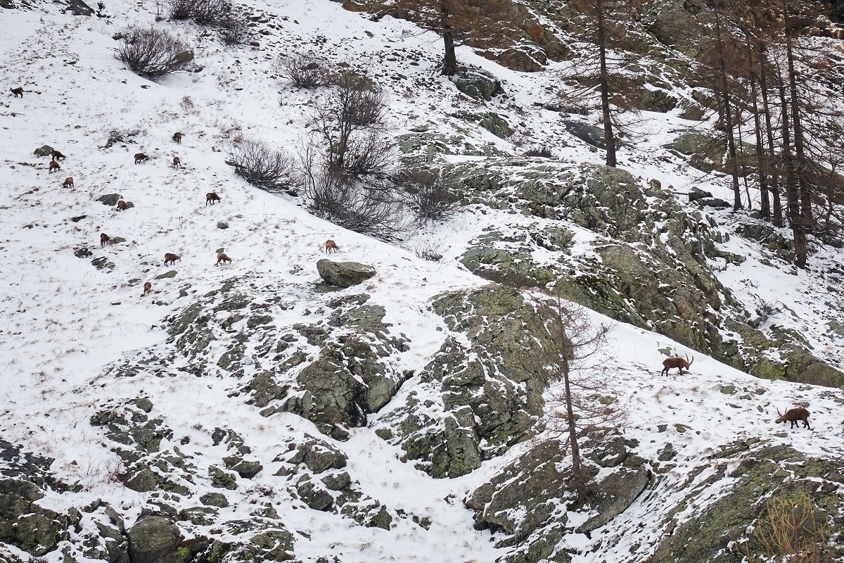 recherche dâherbe. Un plus haut, une quinzaine de chamois font de mĂȘme.