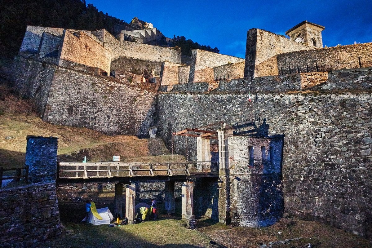 #6. Bivouac insolite dans les douves de la forteresse de Fenestrelle ! Ce Val Chisone a Ă©tĂ© dauphinois (donc français) jusquâĂ ce que le Duc de Savoie la rĂ©cupĂšre (en Ă©change de lâUbaye) dans le cadre du TraitĂ© dâUtrecht (1713). A Fenestrelle, il y a construit une forteresse monumentale pour se protĂ©ger des Français. Elle serait la plus vaste construction en maçonnerie aprĂšs la Muraille de Chine. Rien que cela !