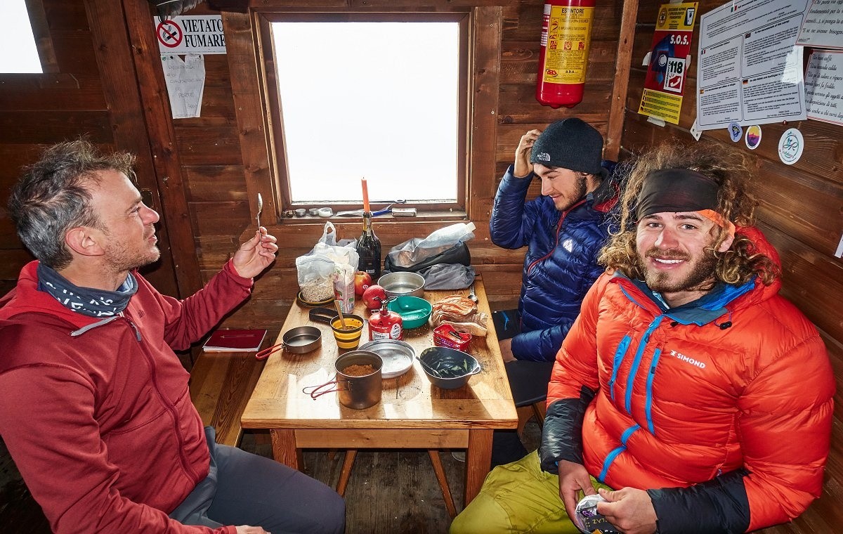 #3. Faute de place dans le bivouac « dâarchitecte » Corradini, on se rabattra sur le trĂšs joli bivouac Andrea Tornior (2540m), dont la longueur dâaccĂšs contribue Ă limiter sa frĂ©quentation. Antho nous fait dĂ©couvrir sa recette « spĂ©cial bivouac » du tiramisu.
