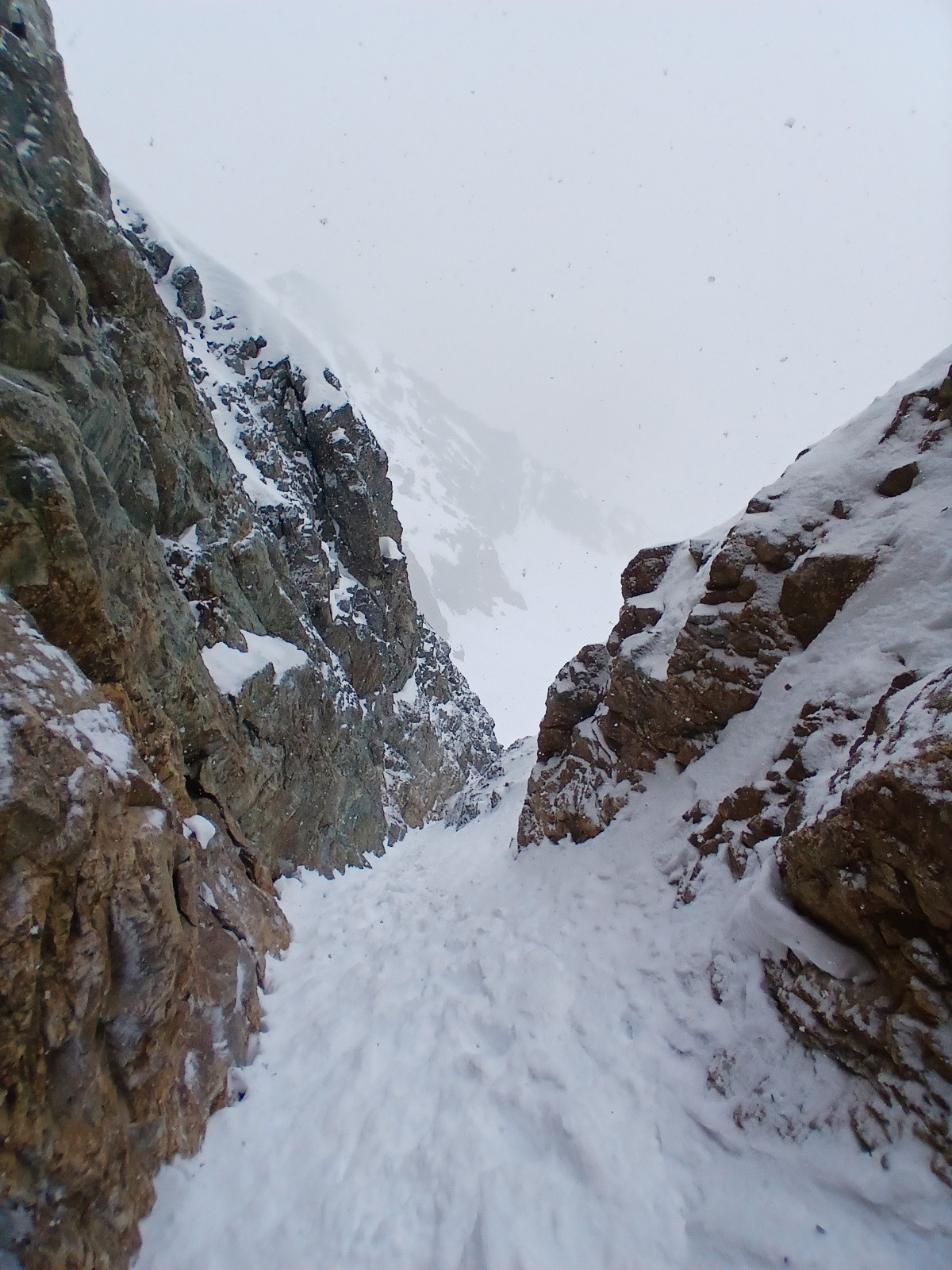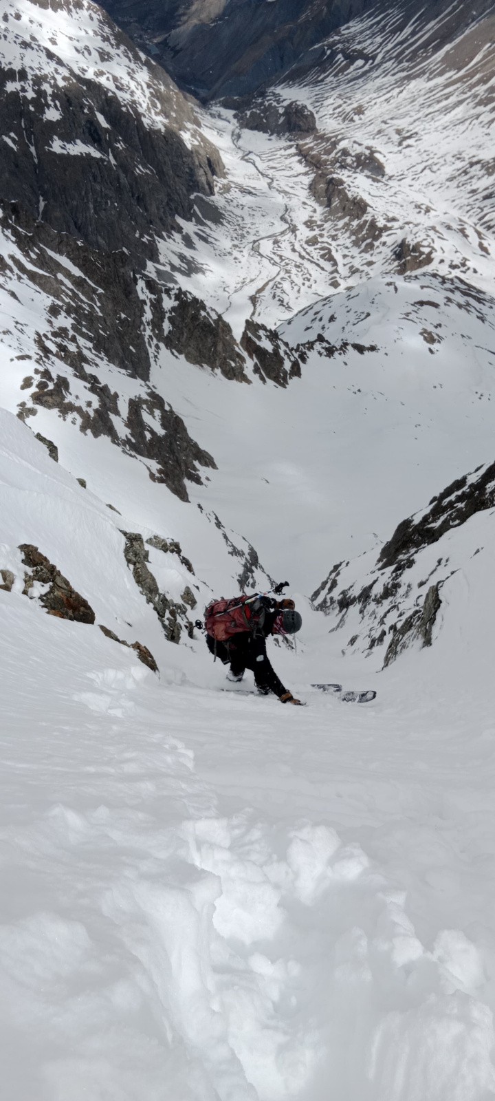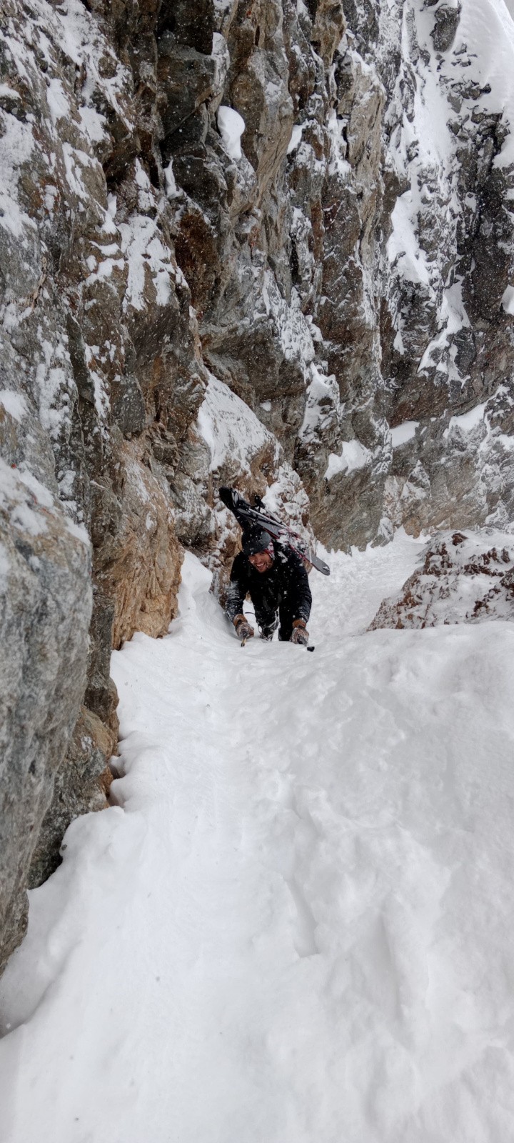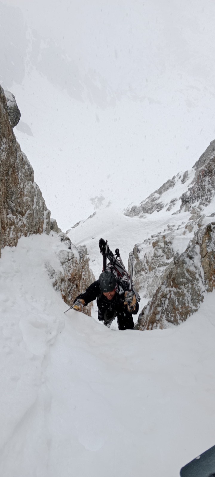 La neige dans la baïonnette est bonne et stable mais le couloir est peu rempli -> c'est raide et étroit. Ne maitrisant pas le virage sauté dans moins de 3m de large dans du 50°, j'ai descendu une petite moitié à pied (principalement la partie basse où il y a 2 petits ressauts en glace) et dérapé sur un bon quart.