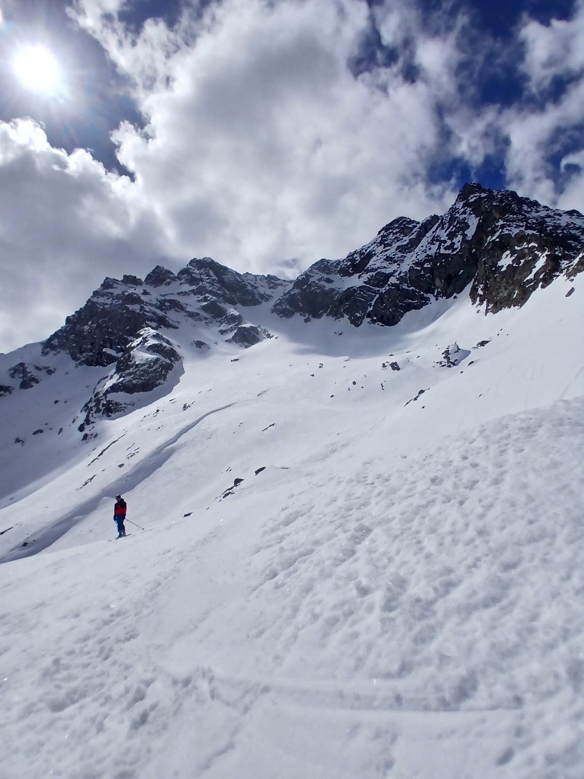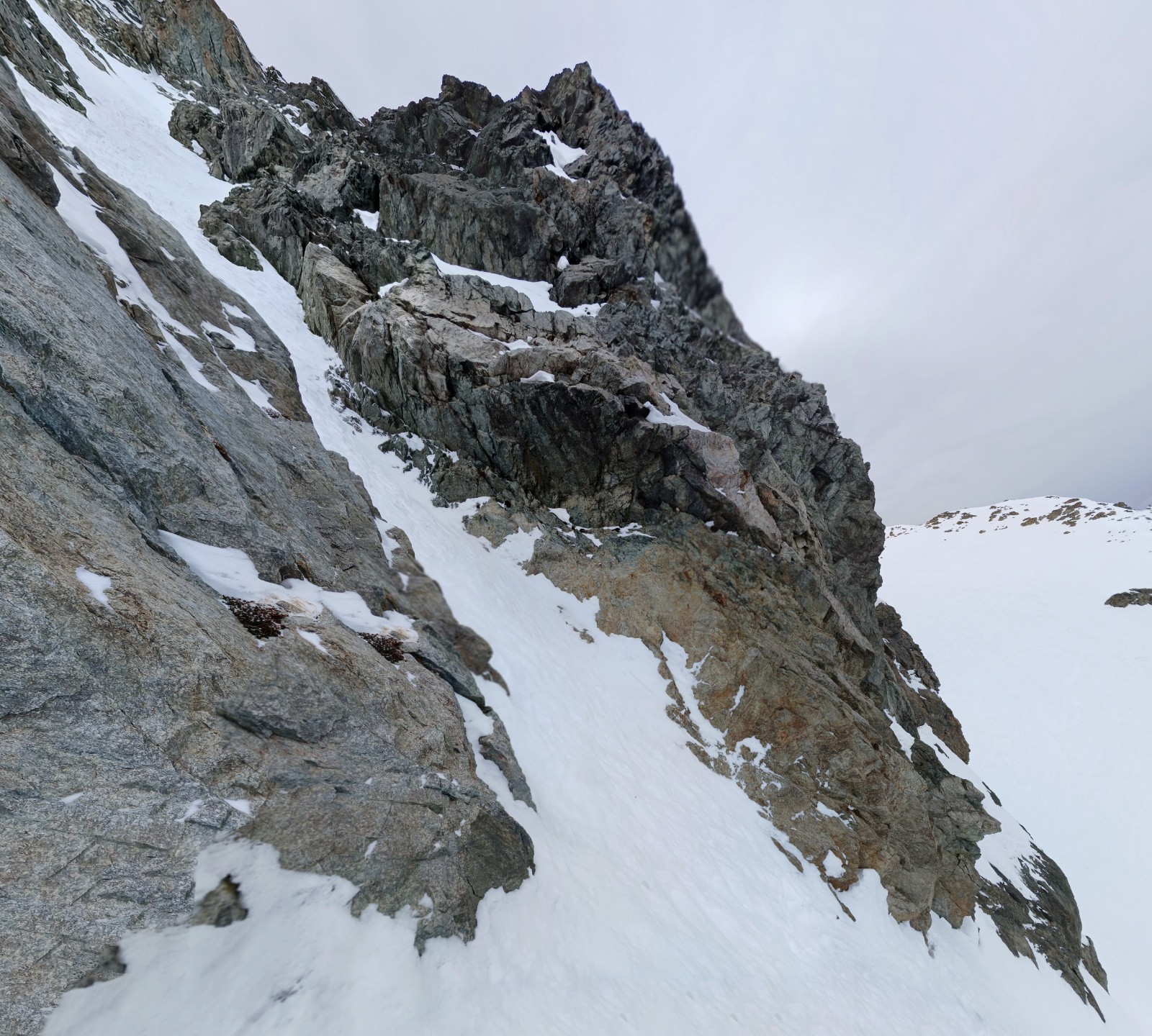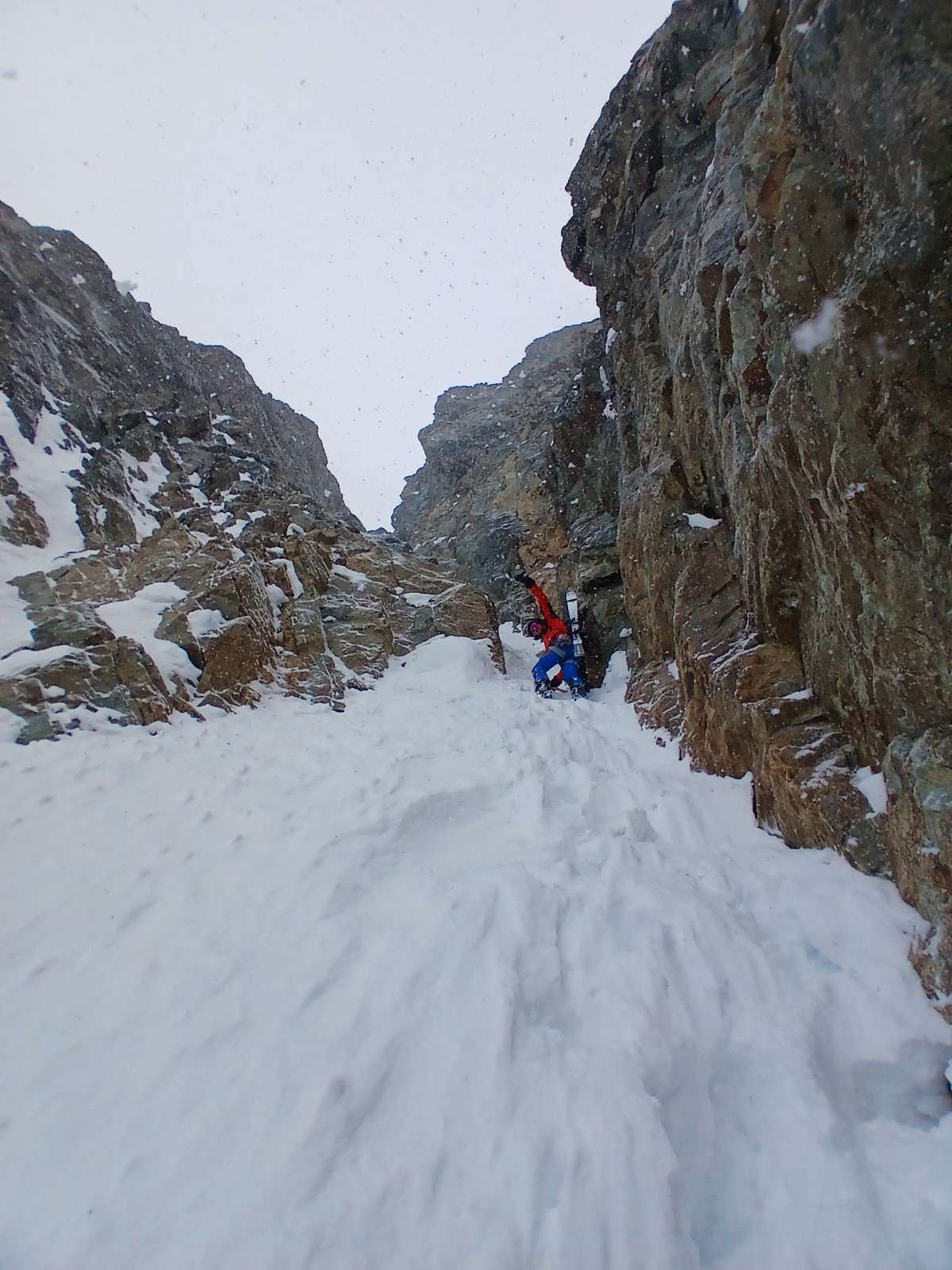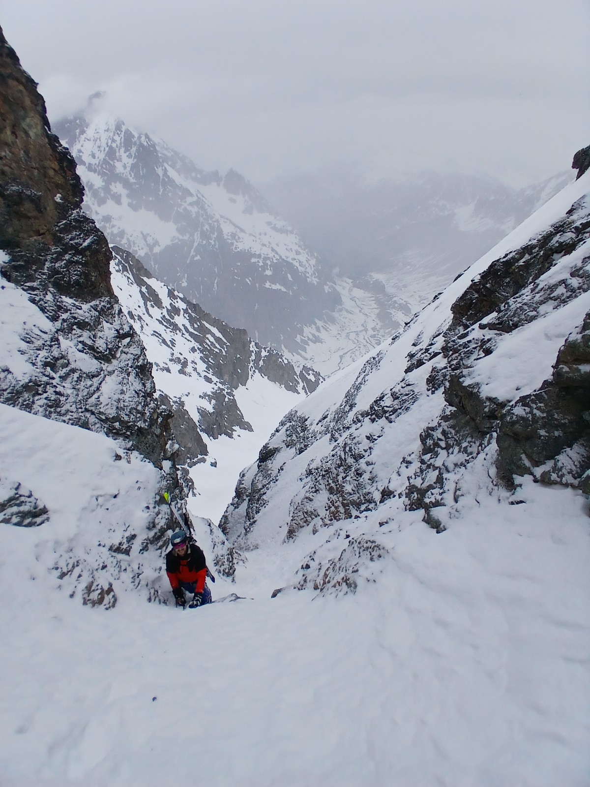 La neige dans la baïonnette est bonne et stable mais le couloir est peu rempli -> c'est raide et étroit. Ne maitrisant pas le virage sauté dans moins de 3m de large dans du 50°, j'ai descendu une petite moitié à pied (principalement la partie basse où il y a 2 petits ressauts en glace) et dérapé sur un bon quart.