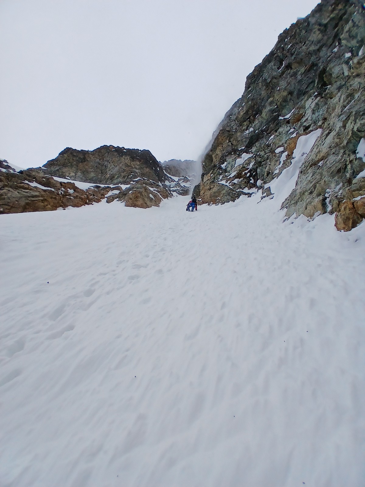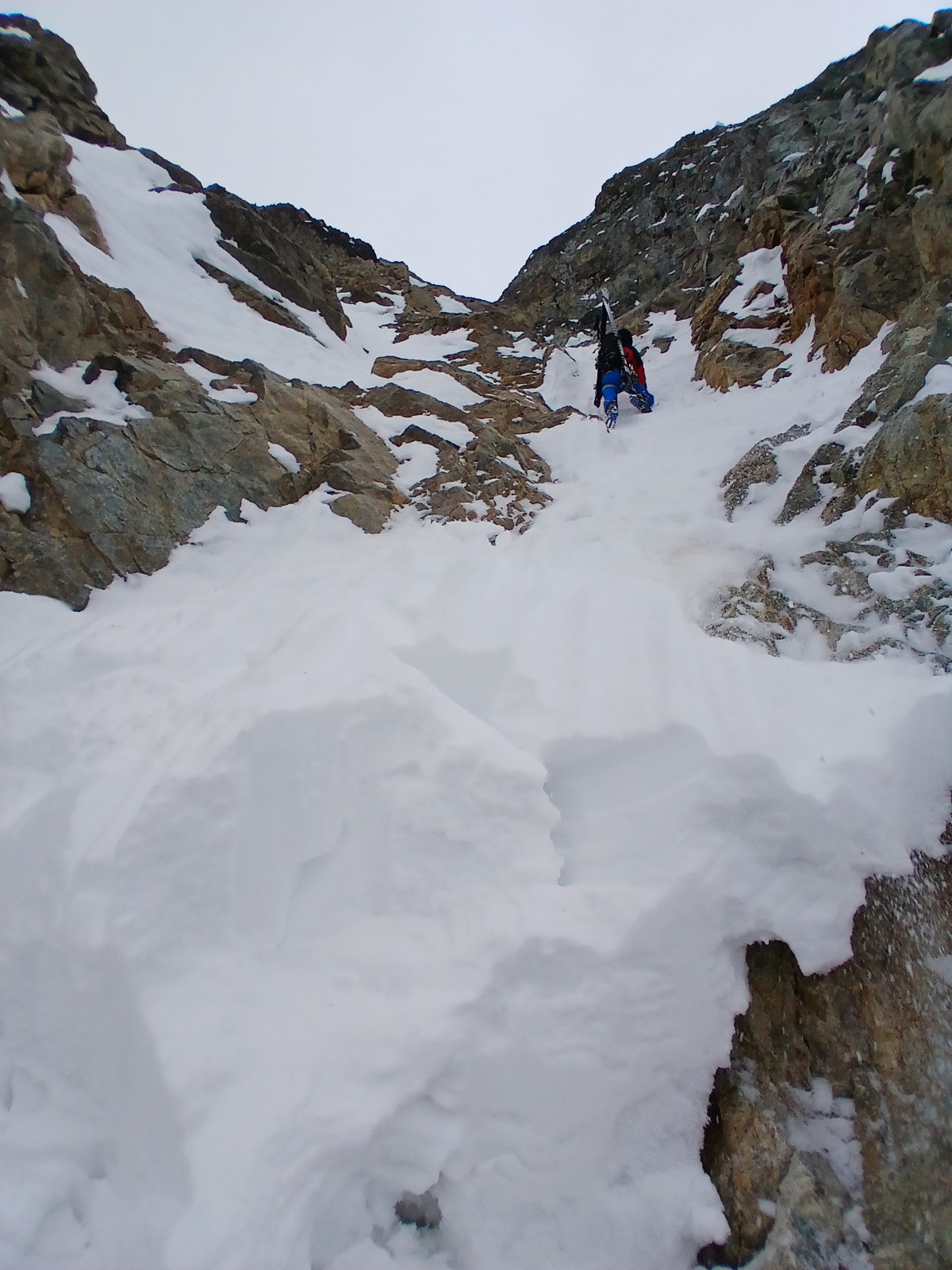 La goulotte est en bonne condition, seul le 1er ressaut en rochers pauvres en glace, est un peu technique sur 10m, après ça déroule. Assez gros brassage dans les derniers mètres avant la sortie.