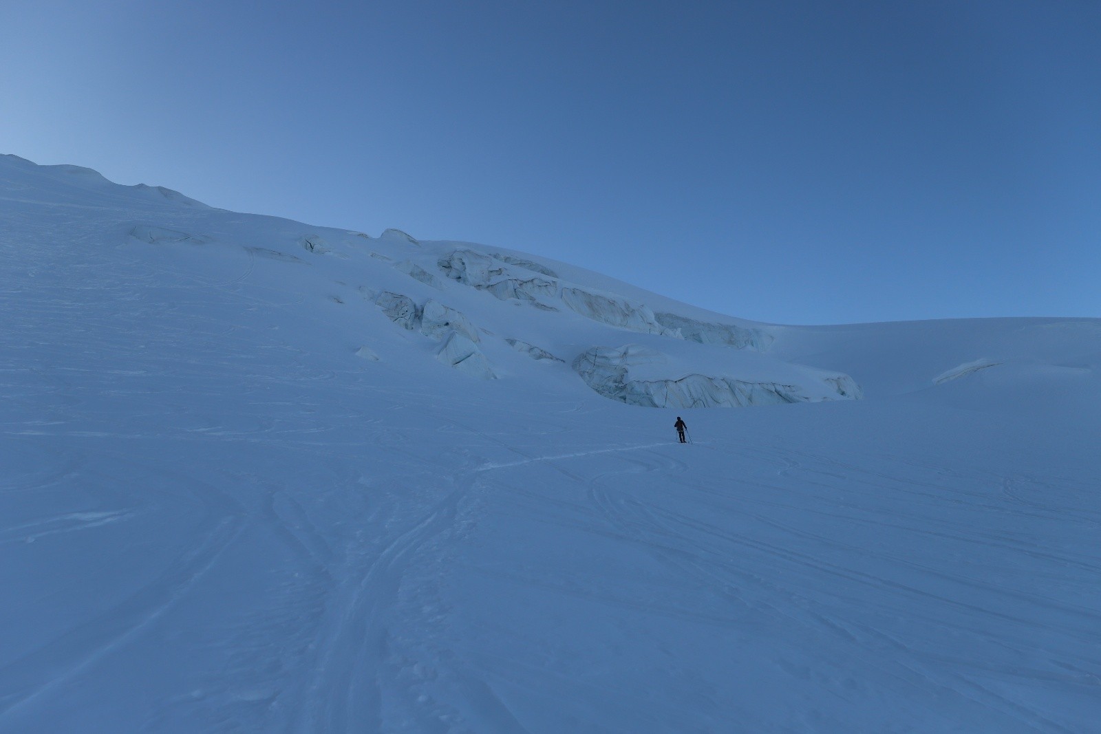 On laisse les skis au point 3772 pour poursuivre en alpi avec crampons/piolet, passage de rimaye plutôt aisé mais y a grand même un sacré trou! La suite continue dans des pentes de neige dure, un peu pénible pour moi de n'avoir pris qu'un unique piolet mais ça passe...