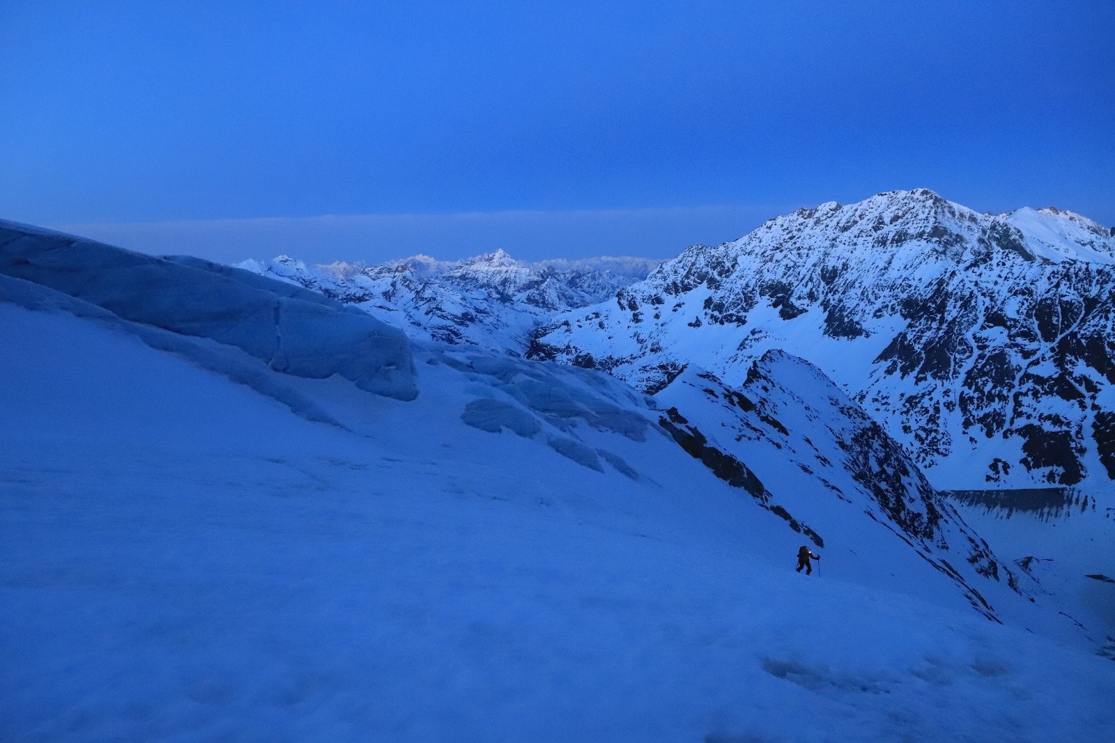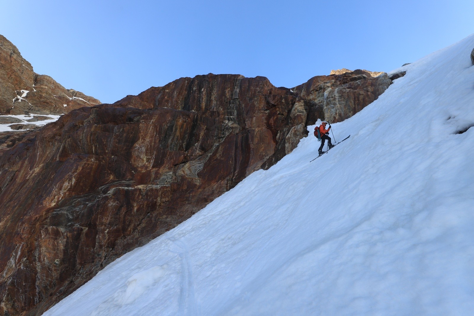 Ouf, on arrive à la dépose des skis après la lonnnngue pente à 45° en neige dure qui m'a paru interminable à descendre en crampons/piolets, heureusement que Léo m'a prêté son second piolet!