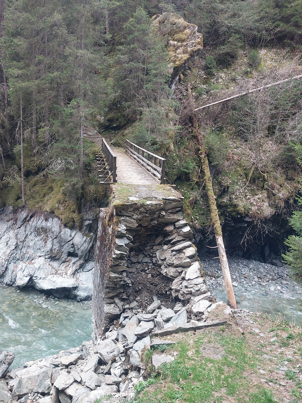 Il y a des sorties qui commencent bien et d'autres qui ne commencent pas vraiment. Celle-ci est dans la deuxième catégorie : après 15 minutes de marche, on arrive à la passerelle du Clôt... La passerelle est toujours là, mais lors de la crue du Vénéon en juin dernier, le pilier d'accès à cette dernière a été en grande partie détruit, il n'en reste qu'une partie qui semble très fragilisée et composée de blocs instables, on n'a pas osé passer. A noter, il y a une pancarte passage interdit sur le sentier.