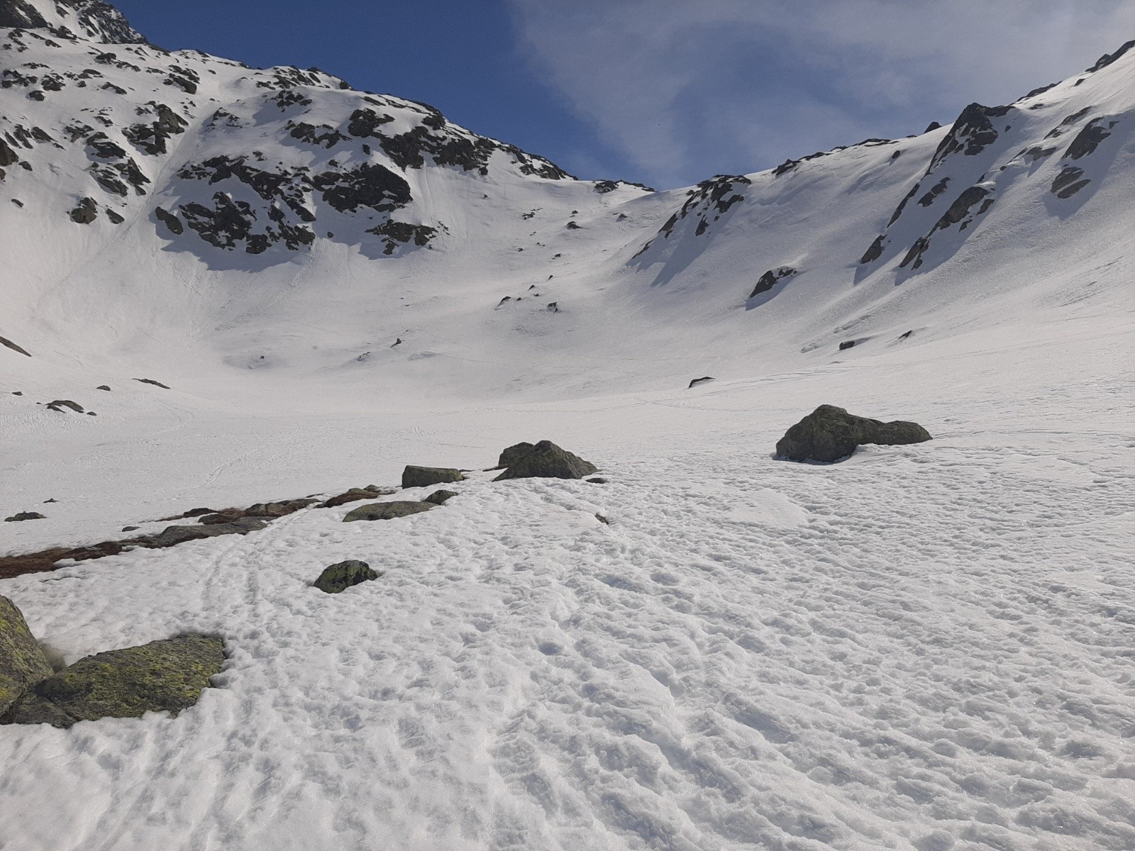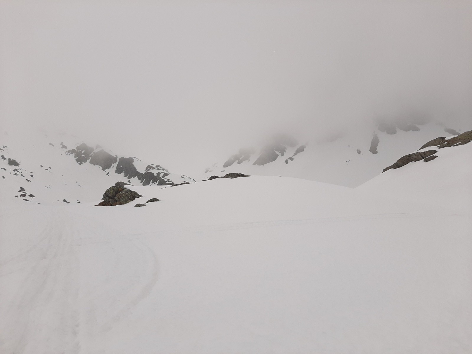 J'ai mis beaucoup de temps, car la montée vers Bergseeli puis la traversée exposée dans des pentes à 40° me font peur, j'ai fini à pied en piolet crampons. Après la neige est devenue une poudreuse froide où naturellement les peaux ont botté, je nettoie, je farte, je dois recommencer (bien sûr j'ai enlevé les couteaux). Mais maintenant la neige devient dure et la pente forte 35°, naturellement ce qui devait arriver arriva, je glisse. Je remets les couteaux, je récupère un bâton perdu dans la chute. Après, plus de visibilité pour changer de vallon, par chance je descends un couloir qui a l'air de mener à l'autre combe, je trouve un pieu et une chaîne qui permet de passer les rocher. Je remonte l'autre vallon dans une neige inconstante. Je finis par trouver un semblant de col et la descente sur le pass da Suretta.