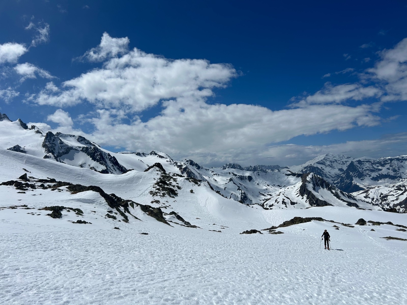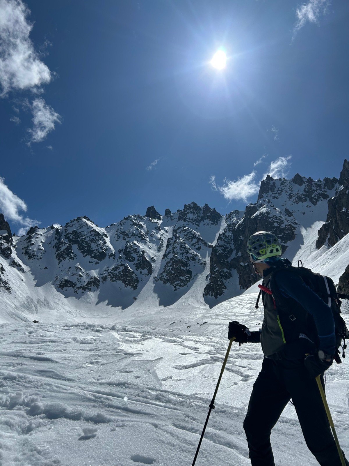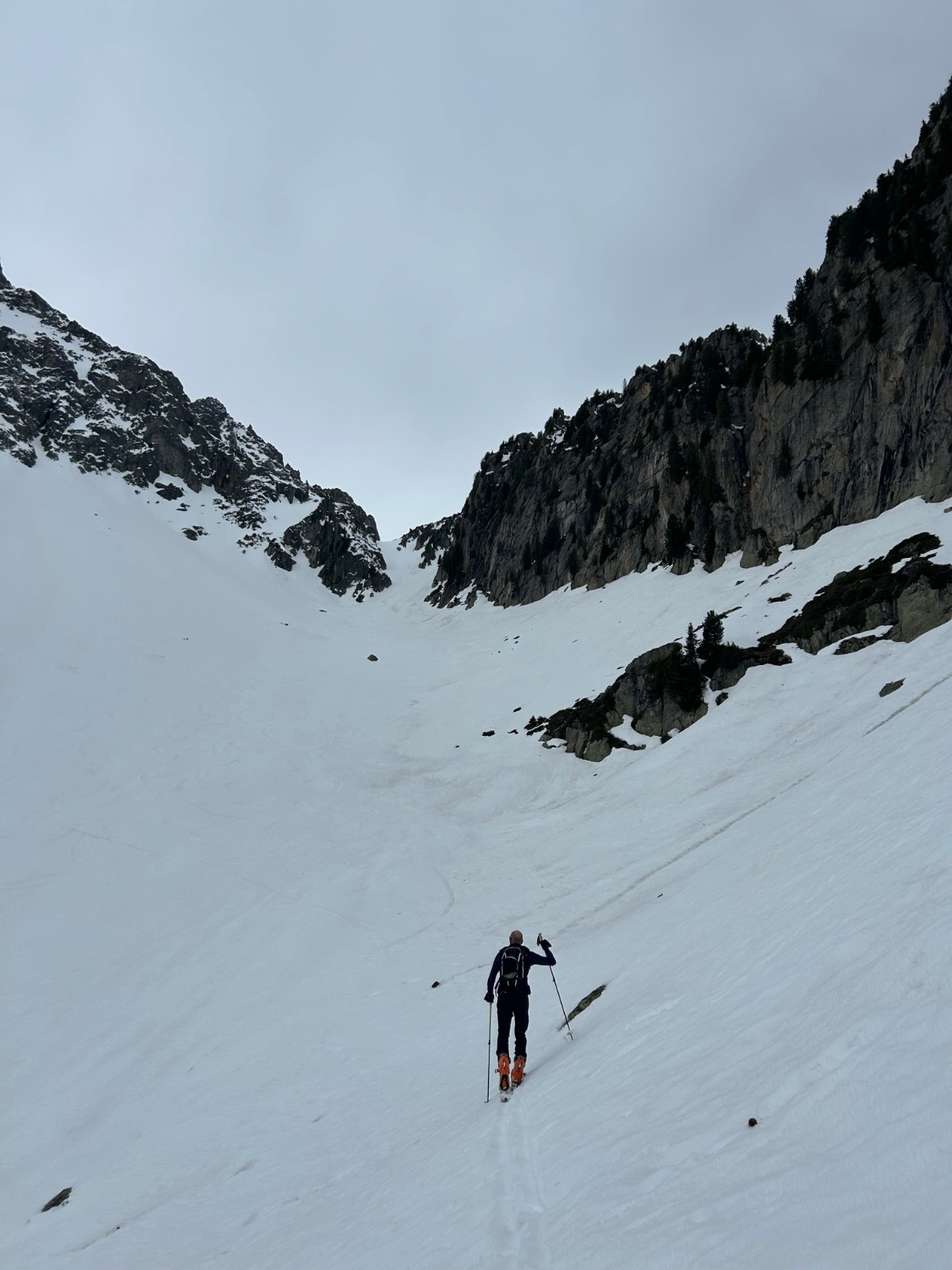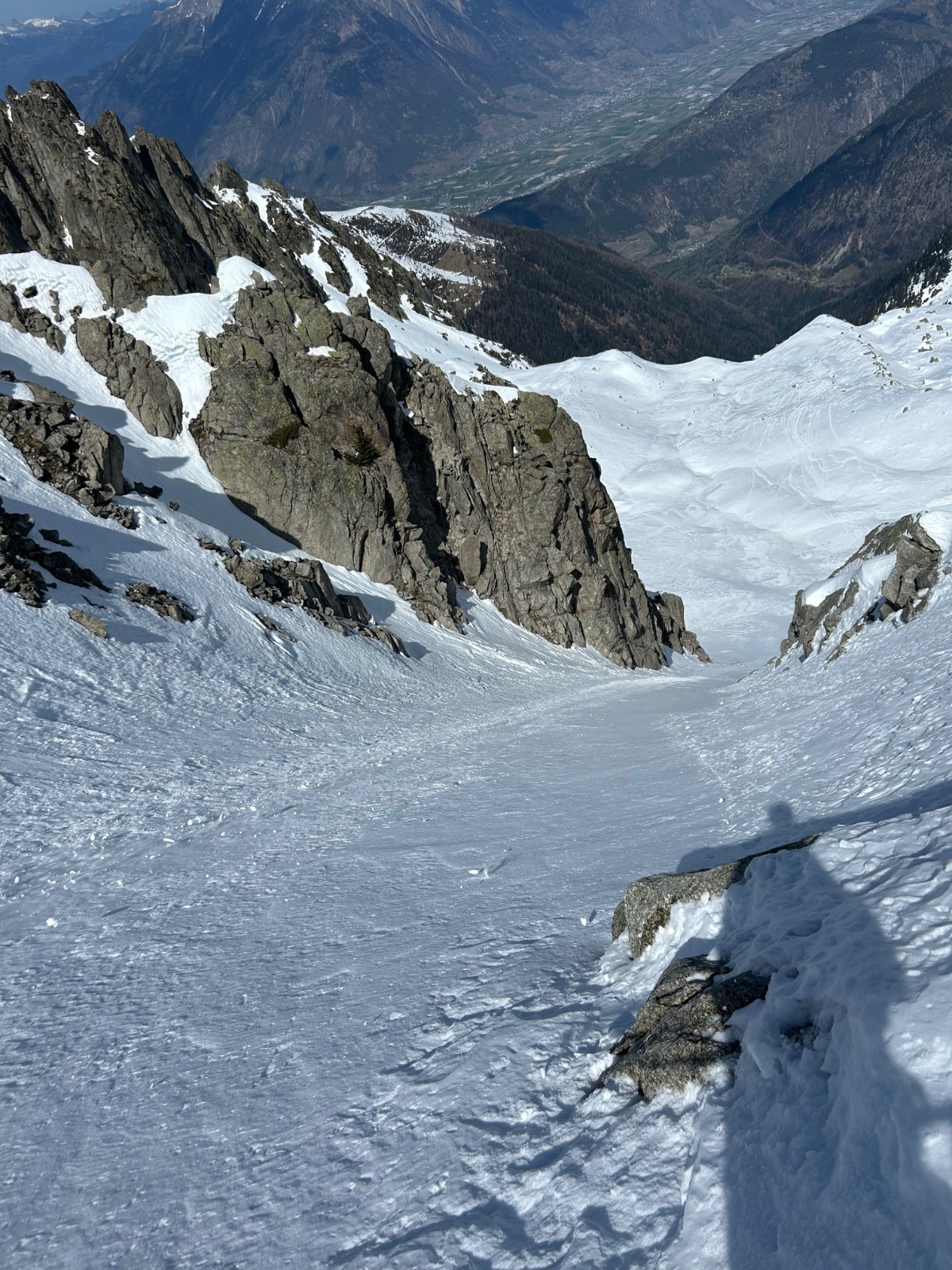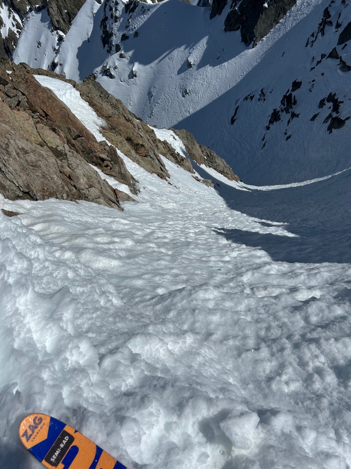 Conditions pour le ski : bonne accroche dans le couloir, neige typique de printemps en dessous