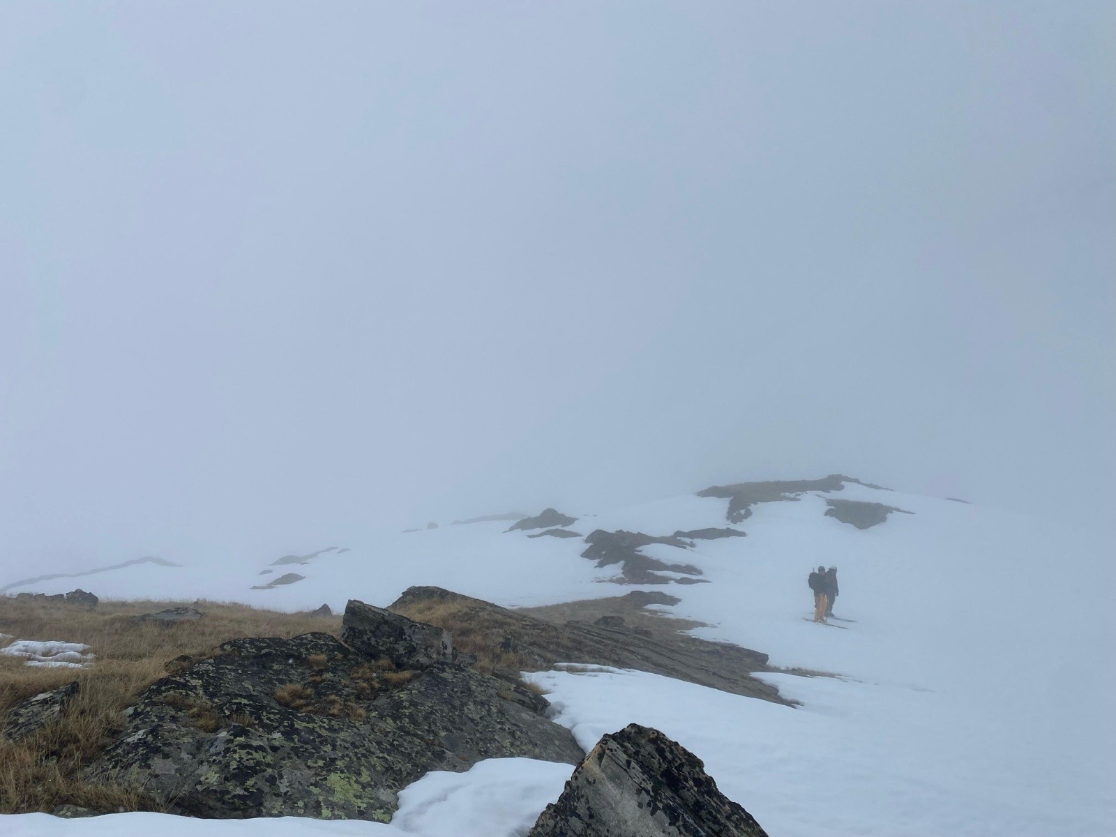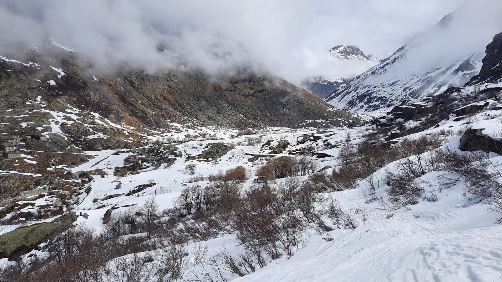 Contrairement aux Franciliens motivés dont j'ai compris qu'ils sont allés voir jusqu'où ça passait en direction de l'Albaron, nous n'avons aucun espoir d'atteindre notre objectif initial (n-ième but nivo-météo pour plusieurs d'entre nous à l'Albaron) et n'avons pas trop envie de tenter les pentes qui y mènent ou qui en sont voisines: mauvais regel, nuages bas et fournis, quantités mobilisables importantes (documentées récemment: www.youtube.com/watch?v=zxcFLKmX3bM) et une longue traversée sur le Plan avant de monter. Nous reviendrons.