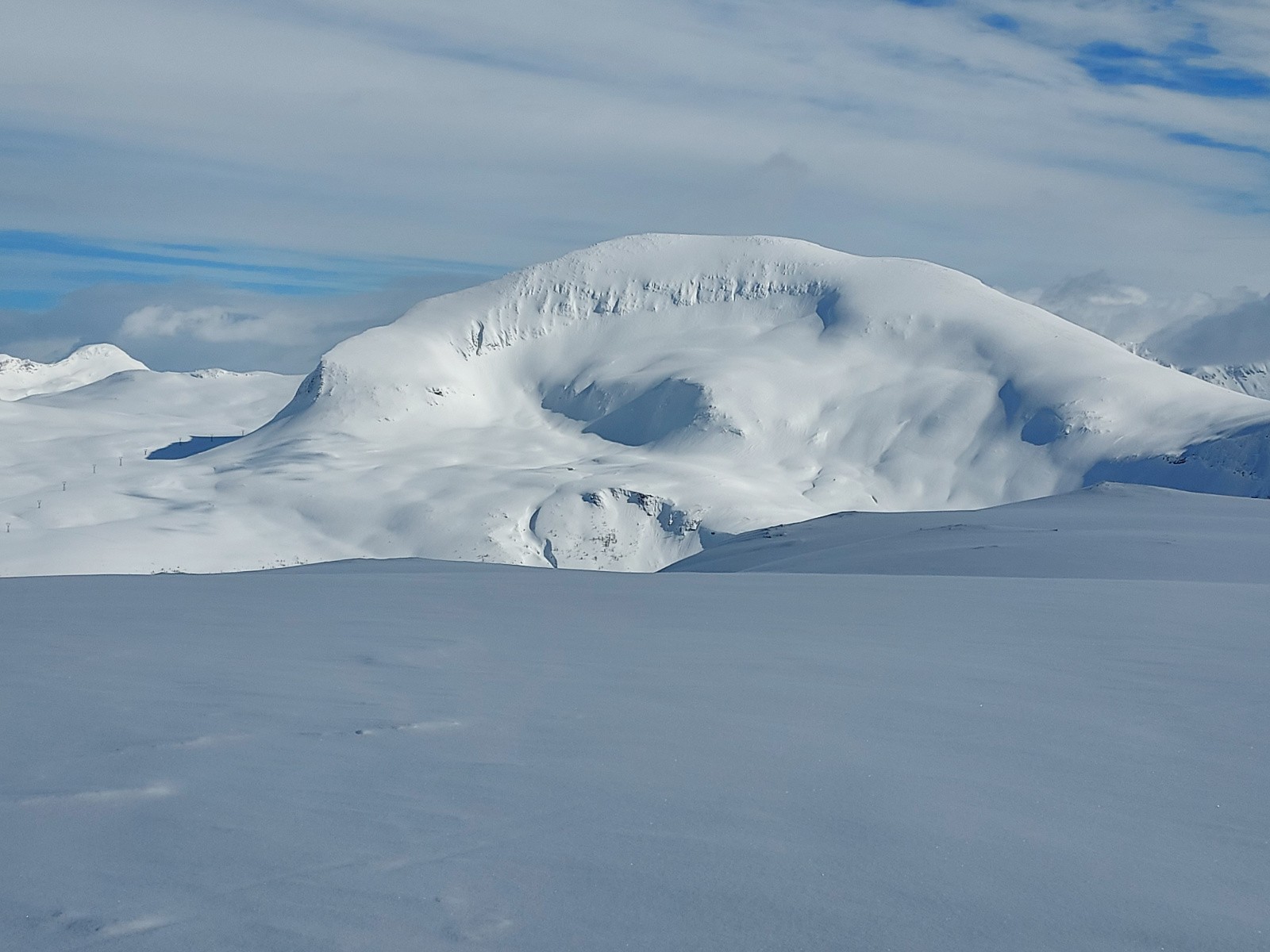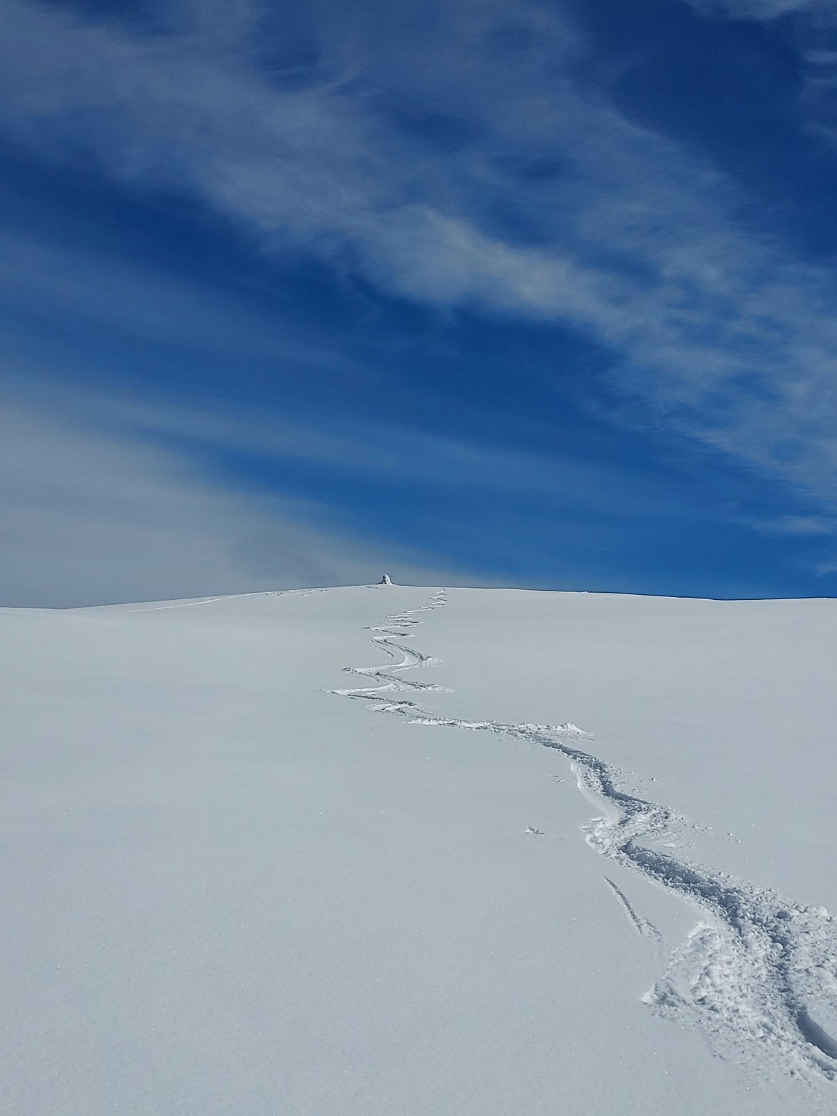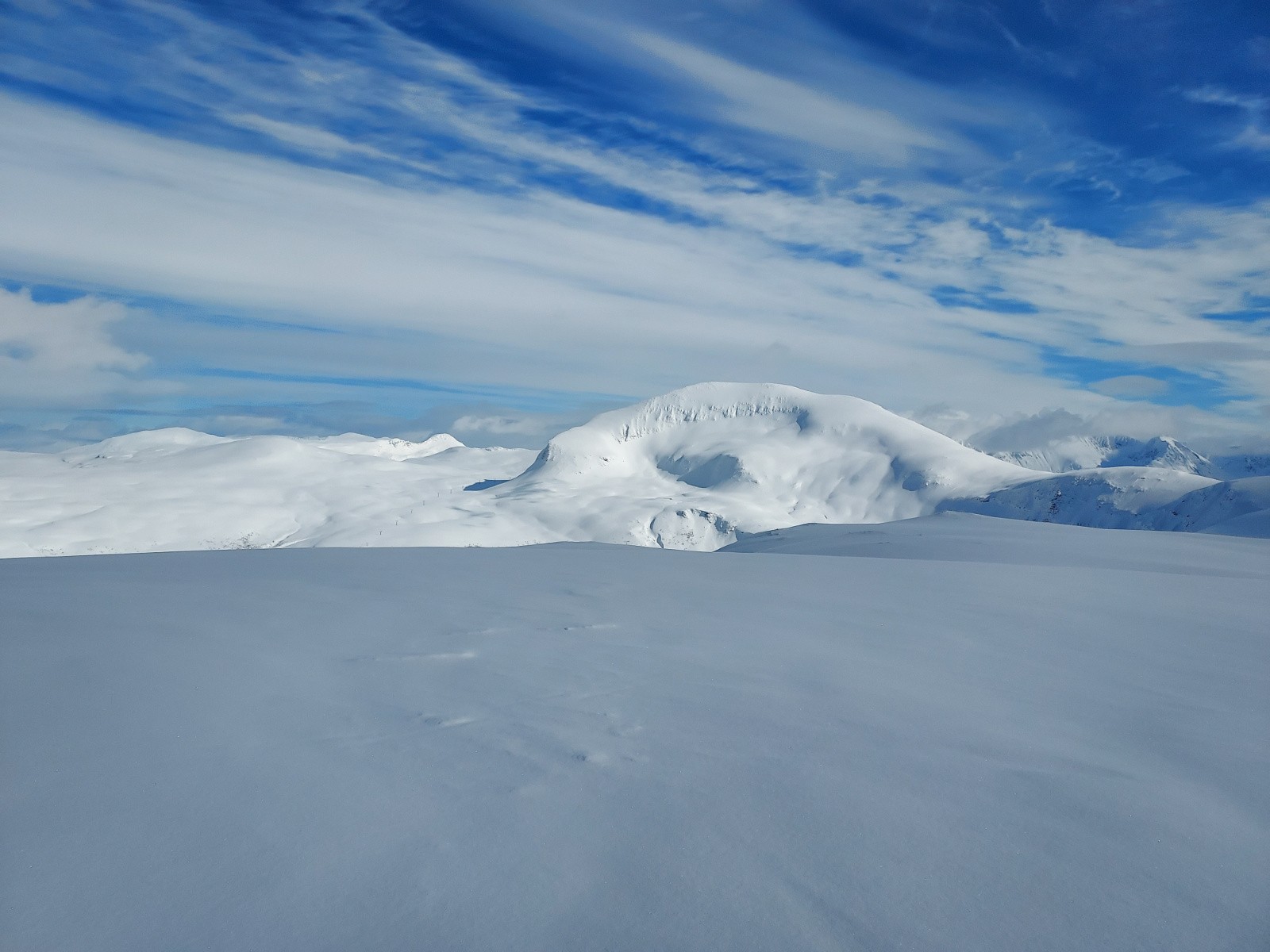 Itinéraire suivi : Première montée en rive gauche jusqu'à la cote 692, trois d'entre nous sont chauds à repeauter pour monter jusqu'au cairn final de Bønntuva pour tracer le versant SO.